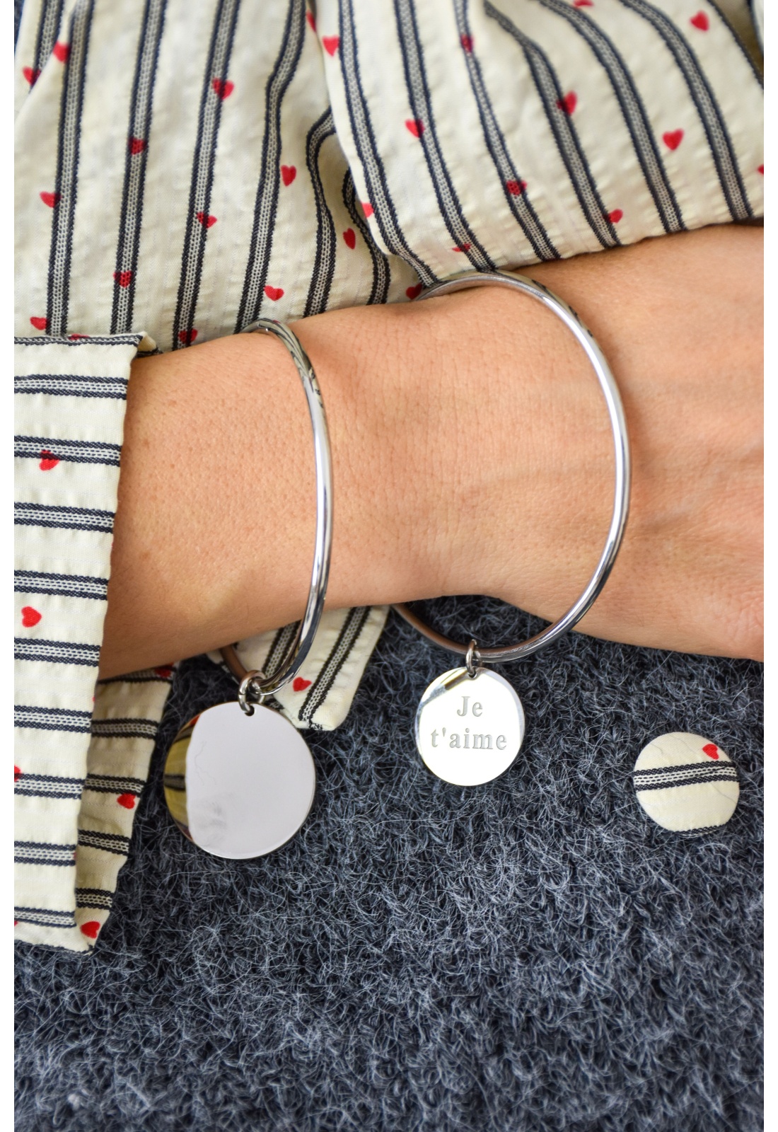 Jonc pour femmes.De couleur argent.Avec une pampille plate ronde.Composition :100% Acier Inoxydable.