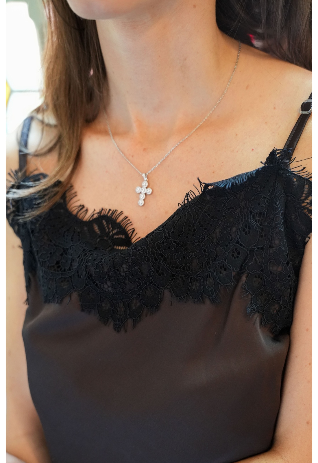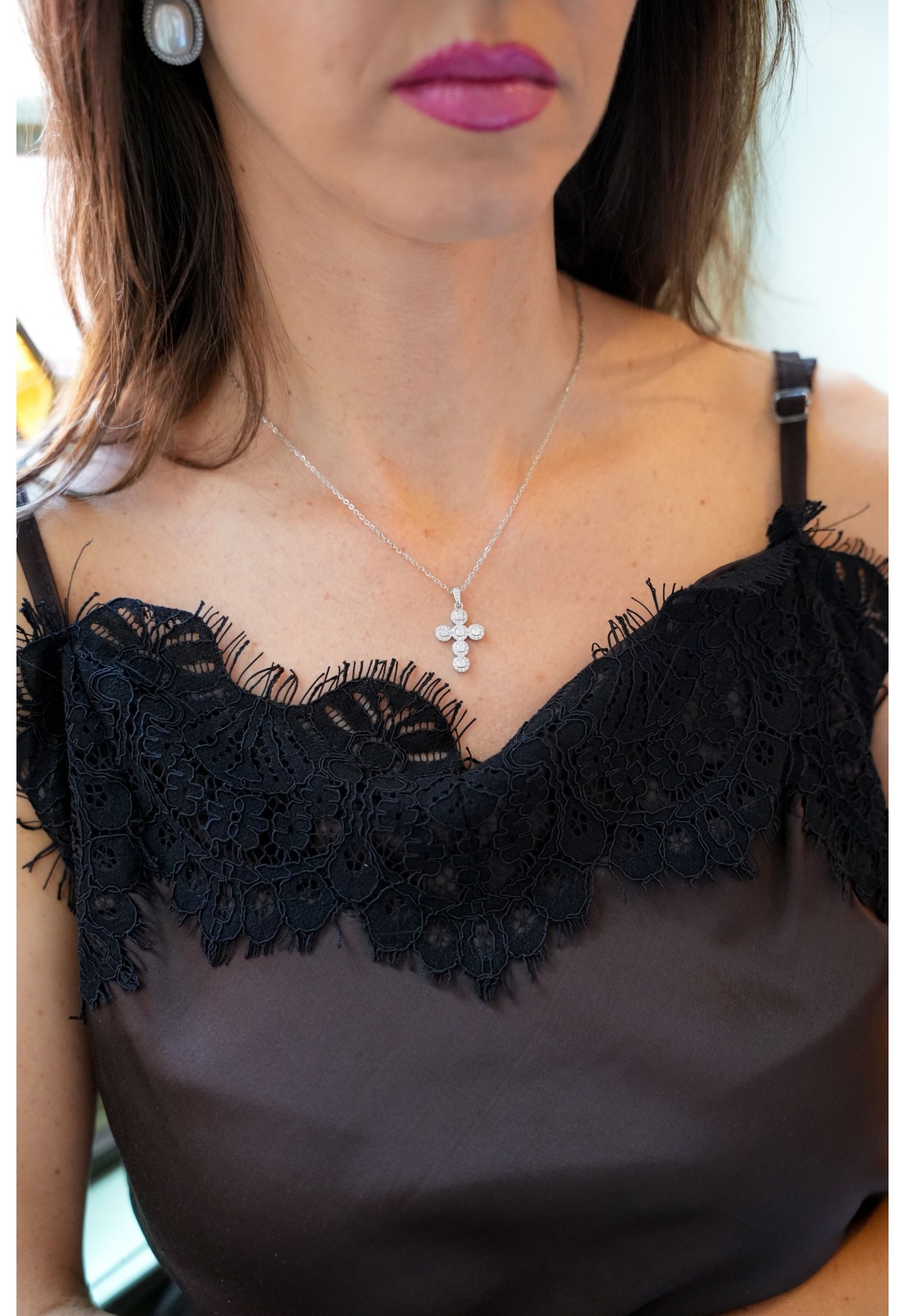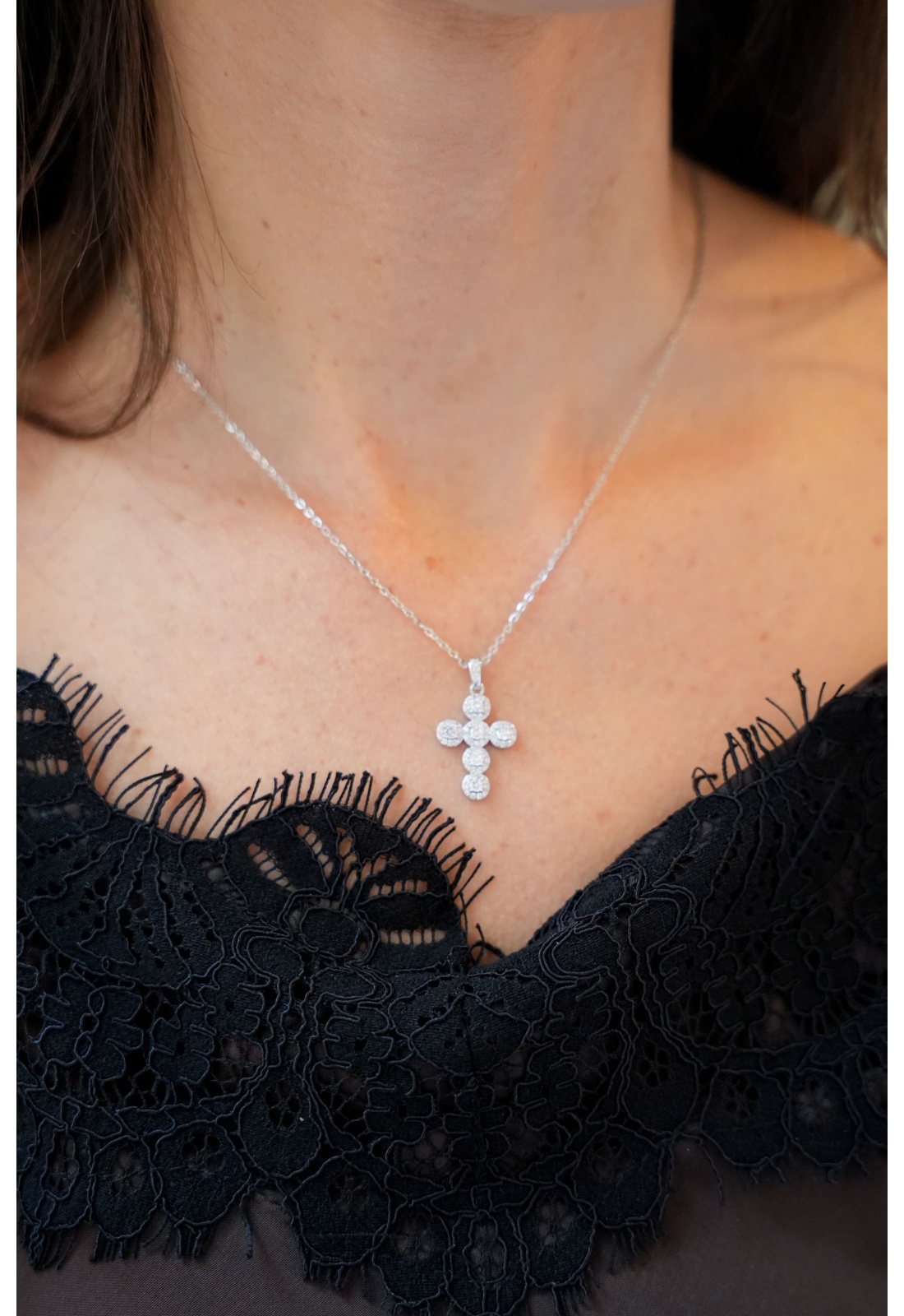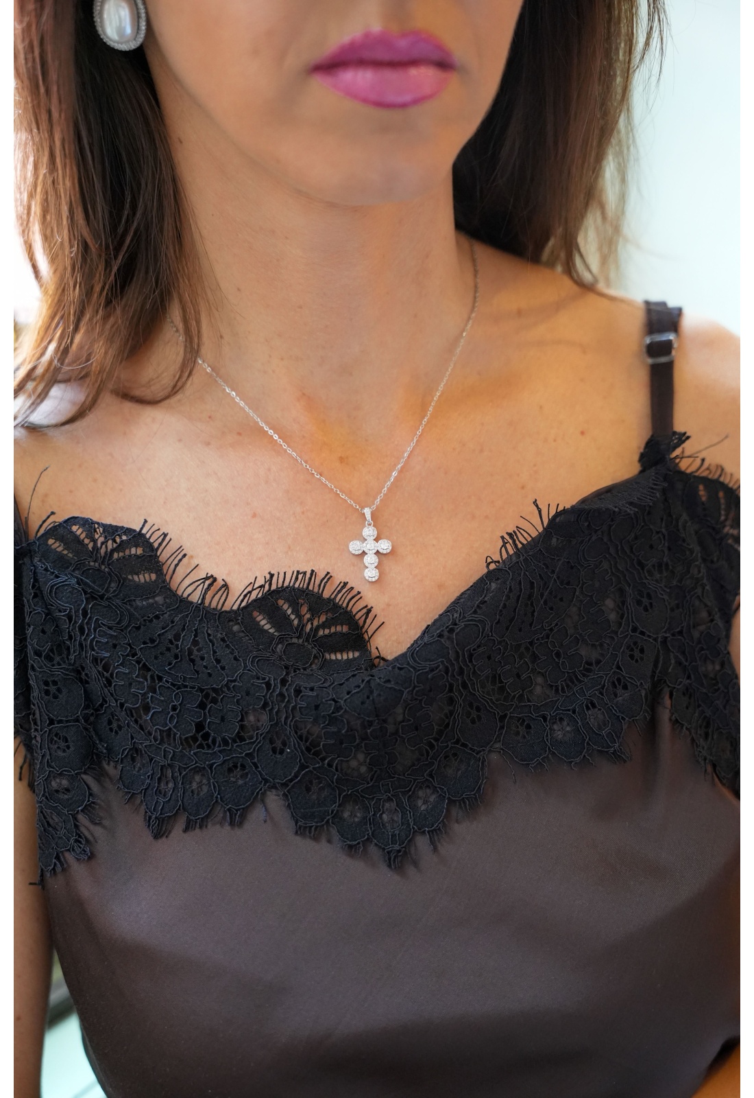 Collier pour femmes.De couleur argent.Avec pendentif en forme de croix ornée de strass.Ajustable sur plusieurs niveaux.Composition :100% Acier Inoxydable.