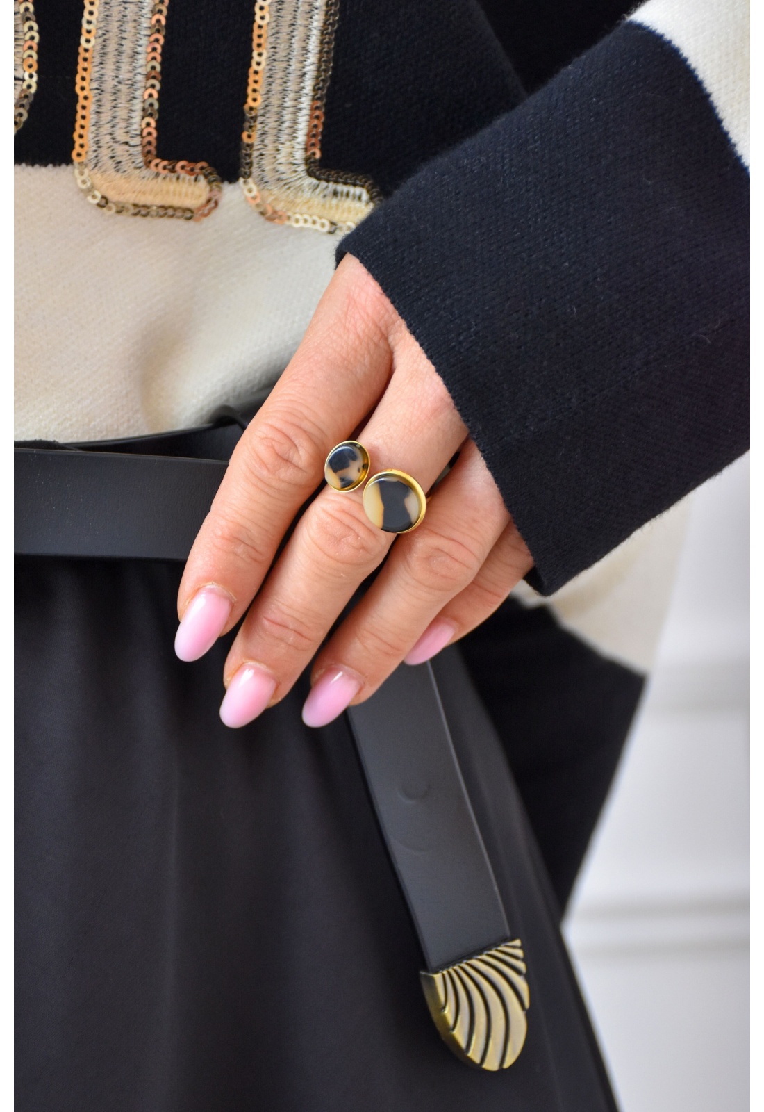 Bague pour femmes.De couleur dorée.Avec 2 pierres écrues et noires.Ajustable.Composition :100% Acier Inoxydable.
