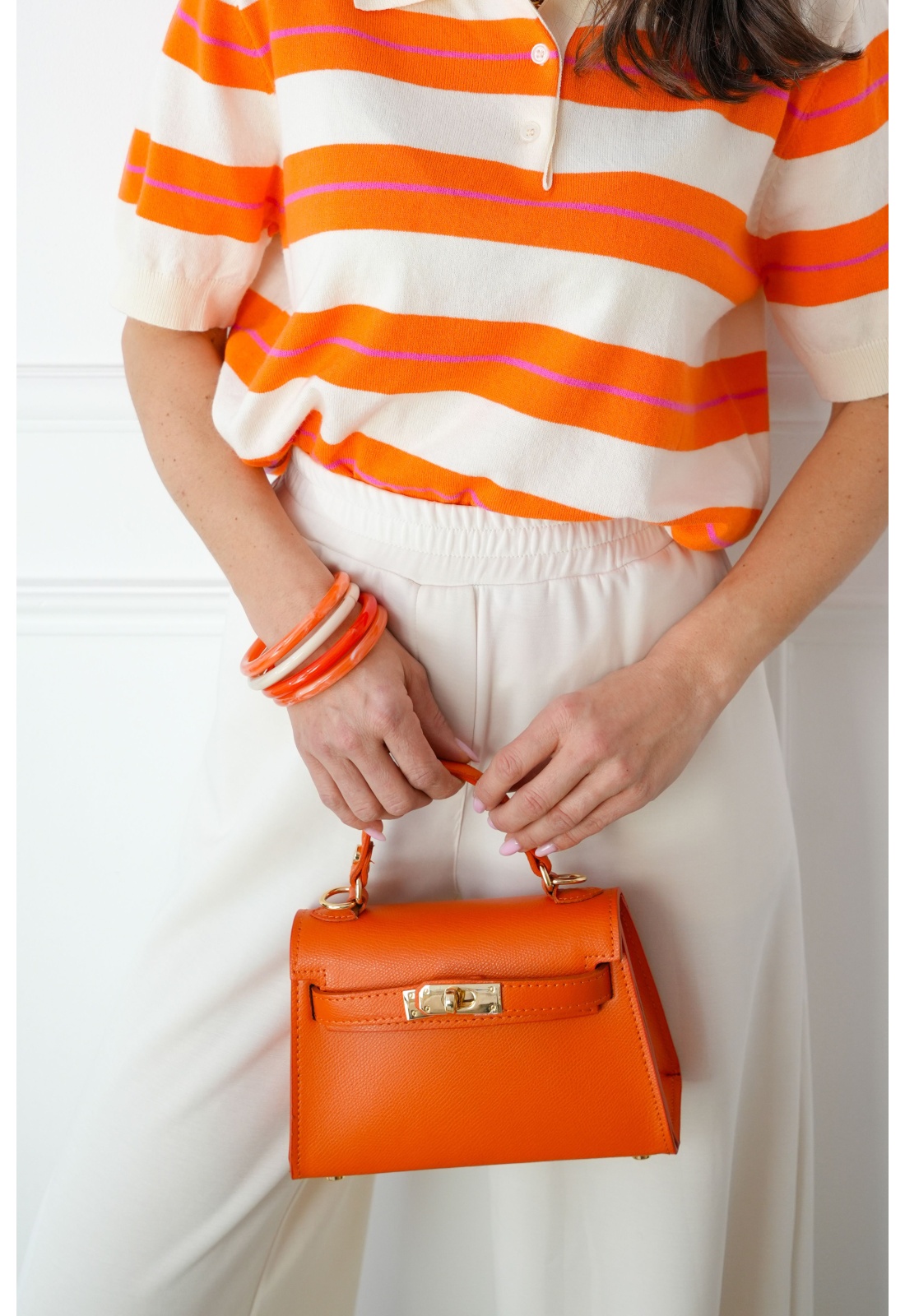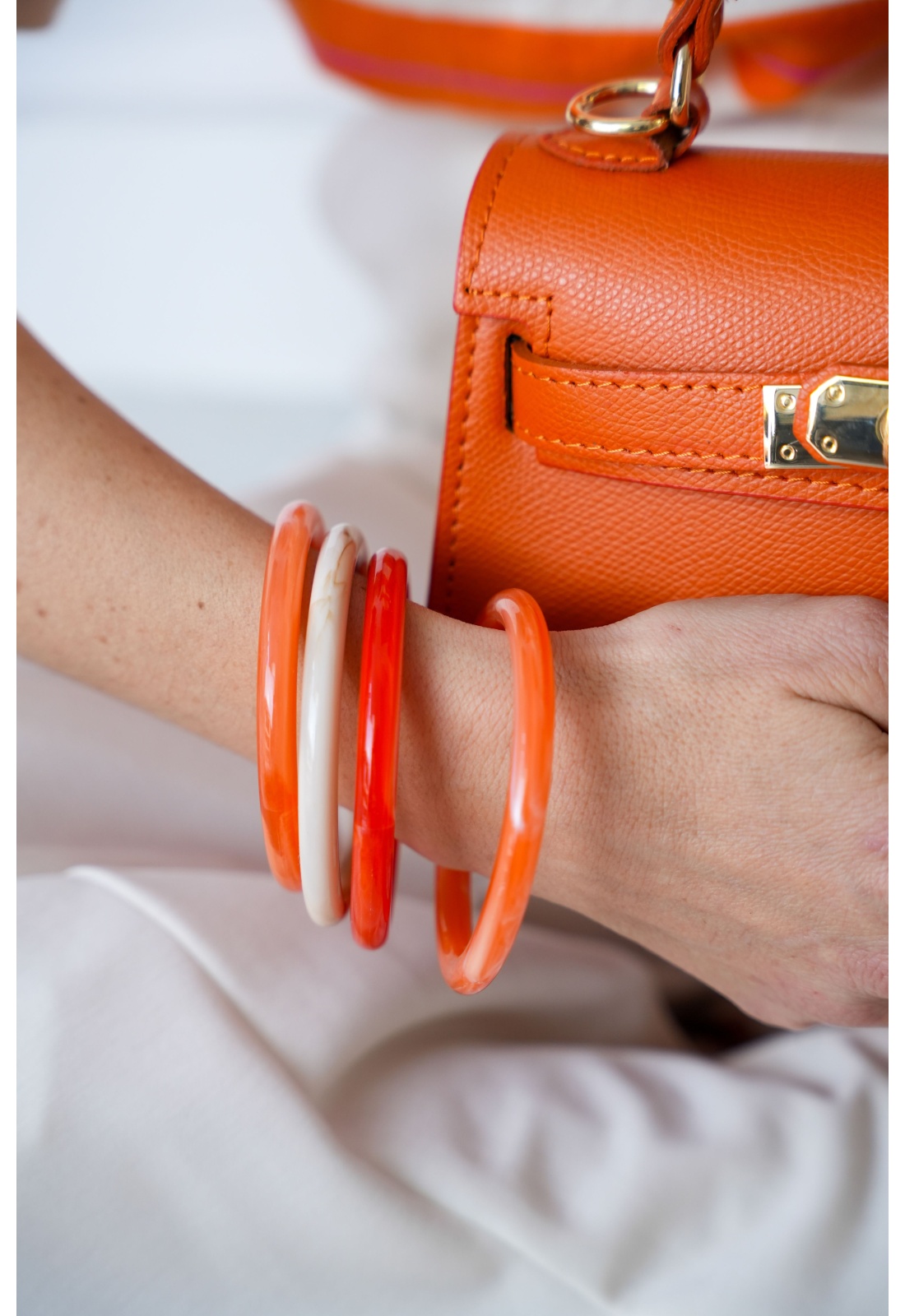 Bracelets pour femmes.De couleur orange et écru.Effet légèrement marbré.En résine.Set de 4 unités.