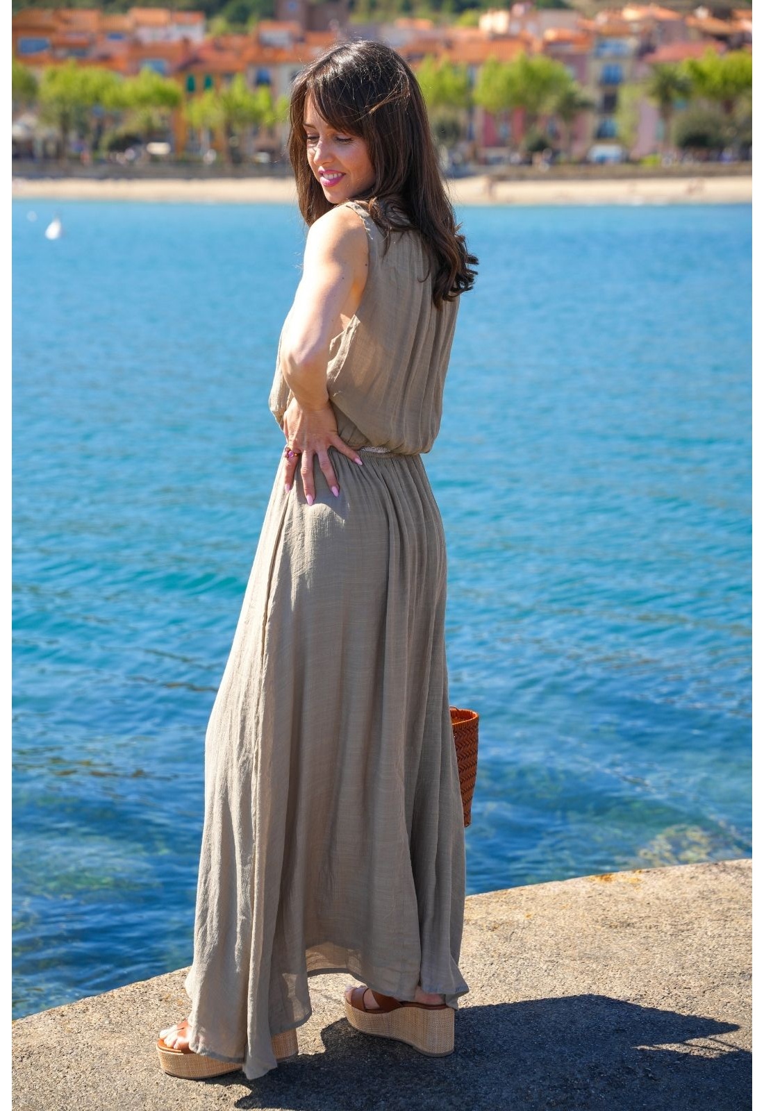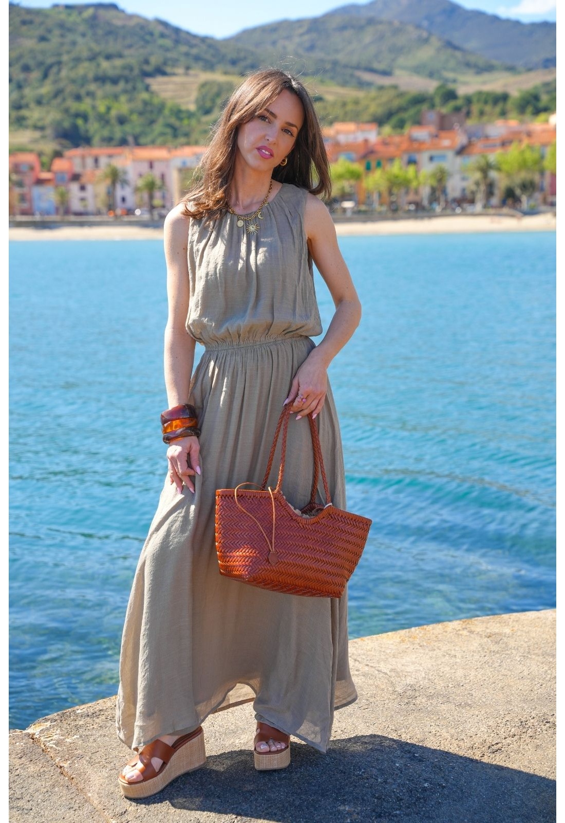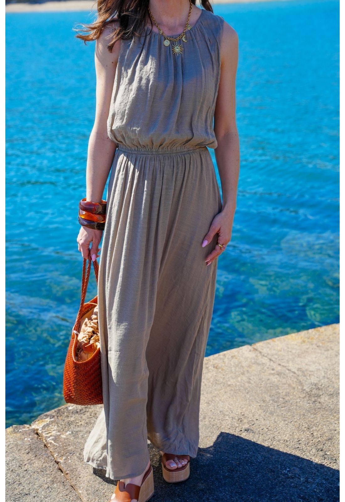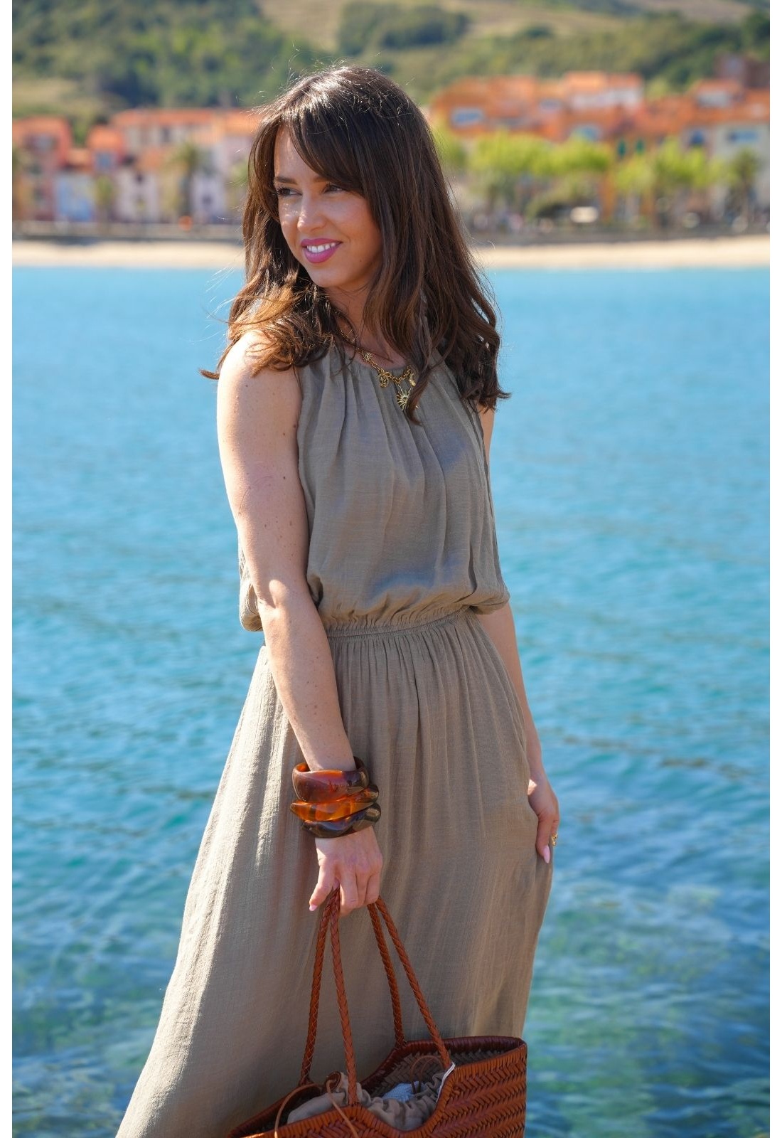 Robe pour femmes.Kaki.Col rond.Sans manches.Longue, un peu évasée.Taille élastiquée.Dos elastiqué.Griffée au niveau des extrémités du vêtement.Composition :65% Viscose.35% Polyester.Fabriqué en Italie.La mannequin porte une S/M et mesure 160 cm.