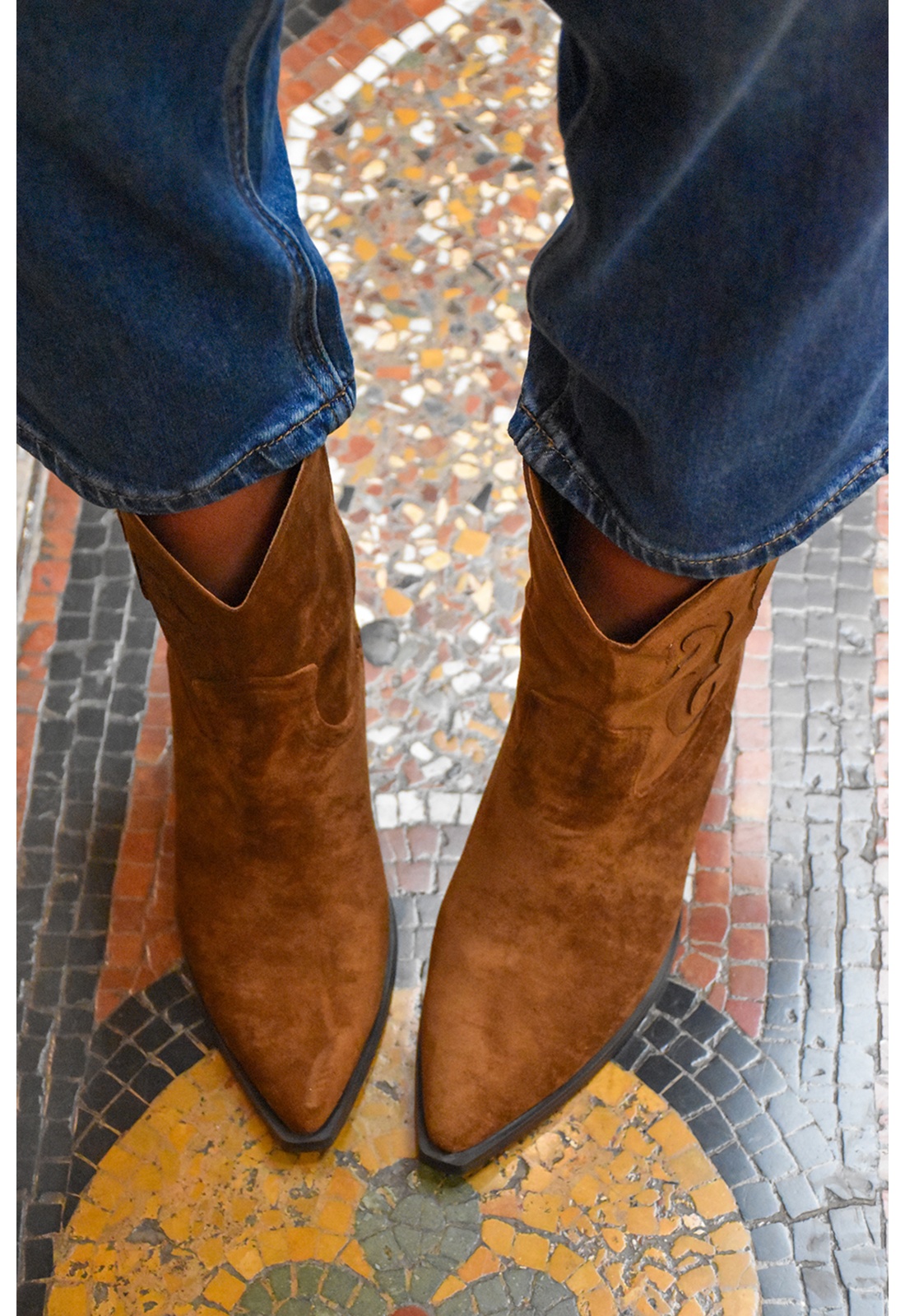 Bottines pour femmes.Tyope santiags. De couleur camel. En suédine.Mi-haute.Détails surpiqures au niveau de la cheville.Doublure camel à l'intérieur. Bout légèrement pointu. Talons carrés.
