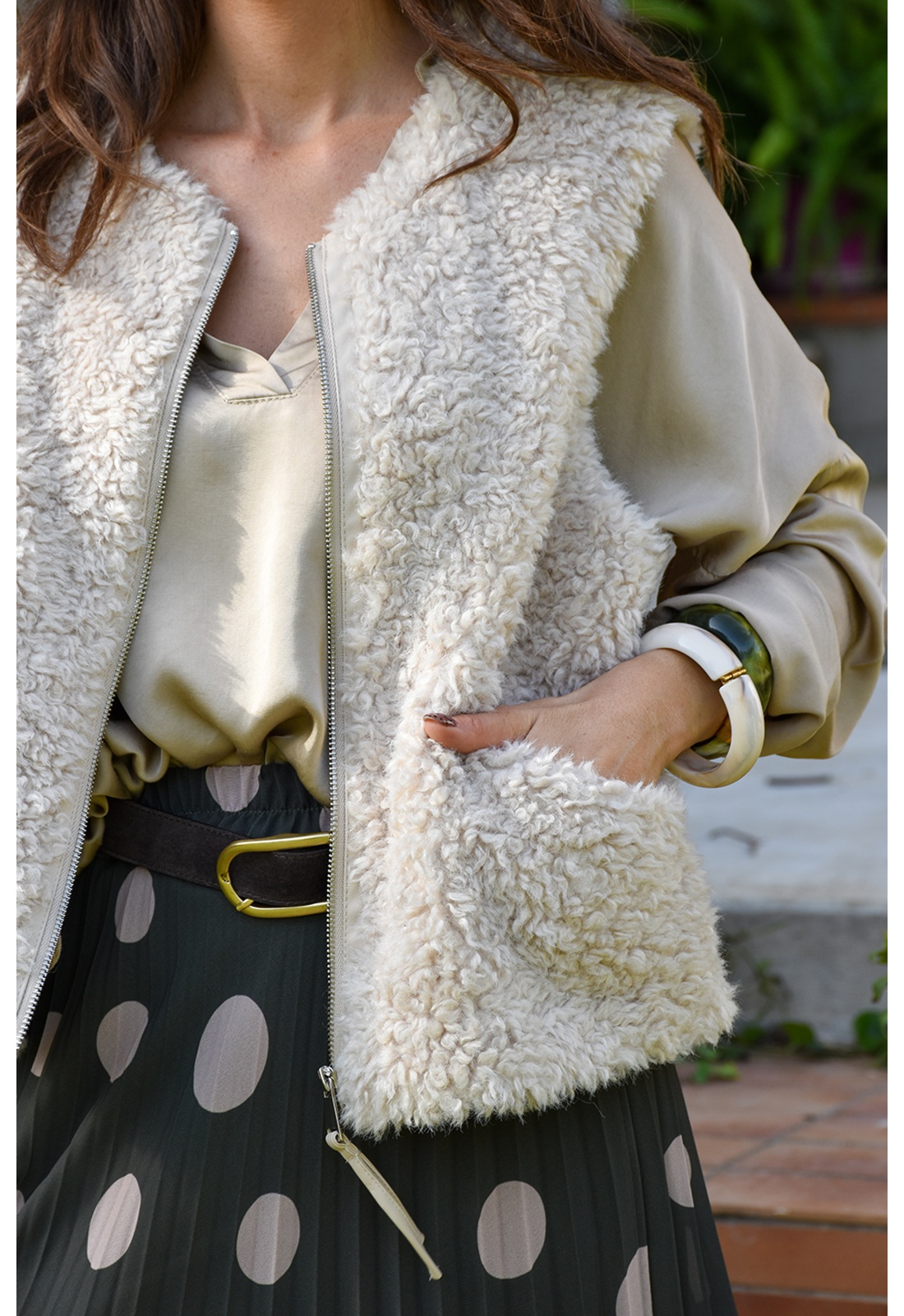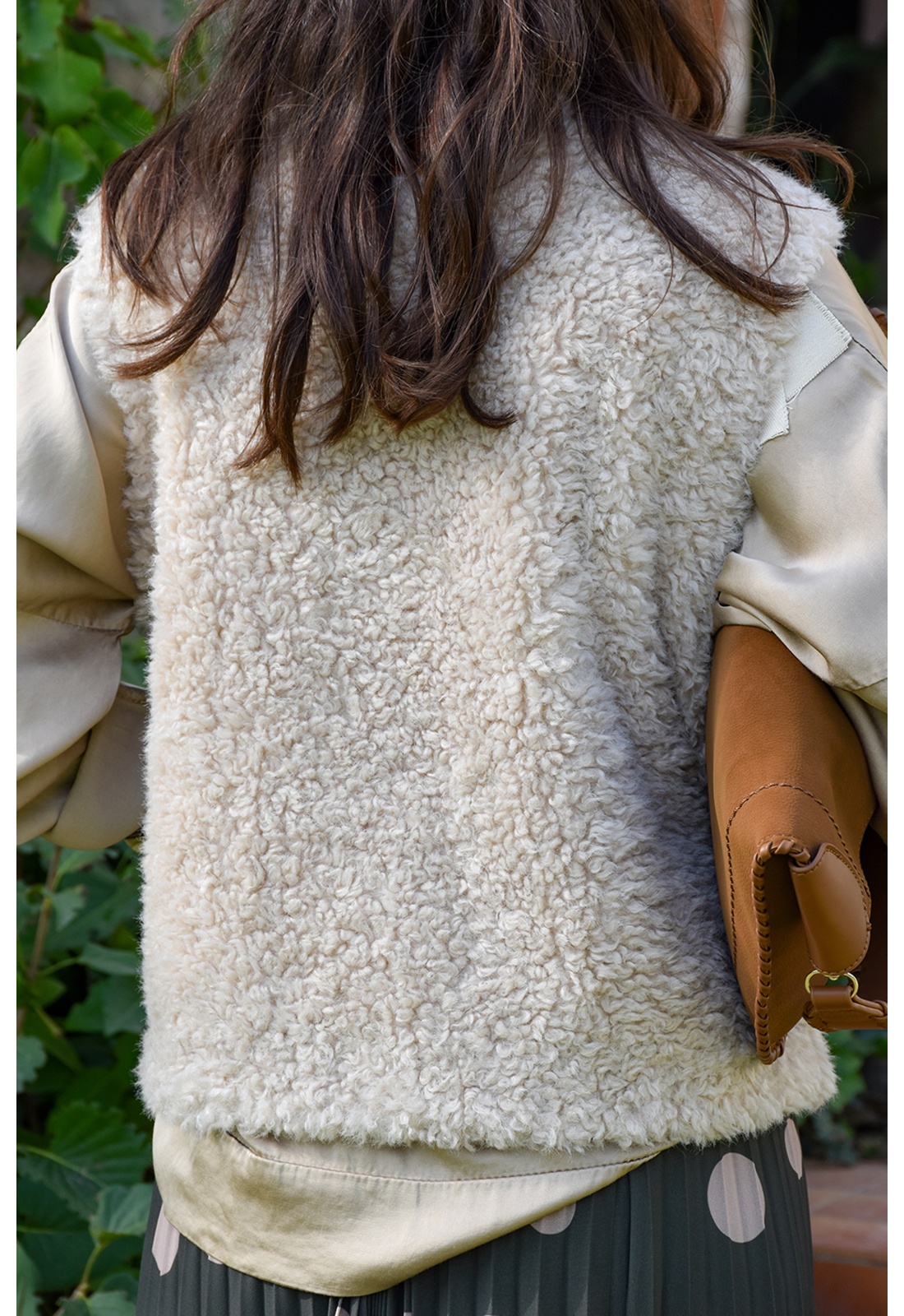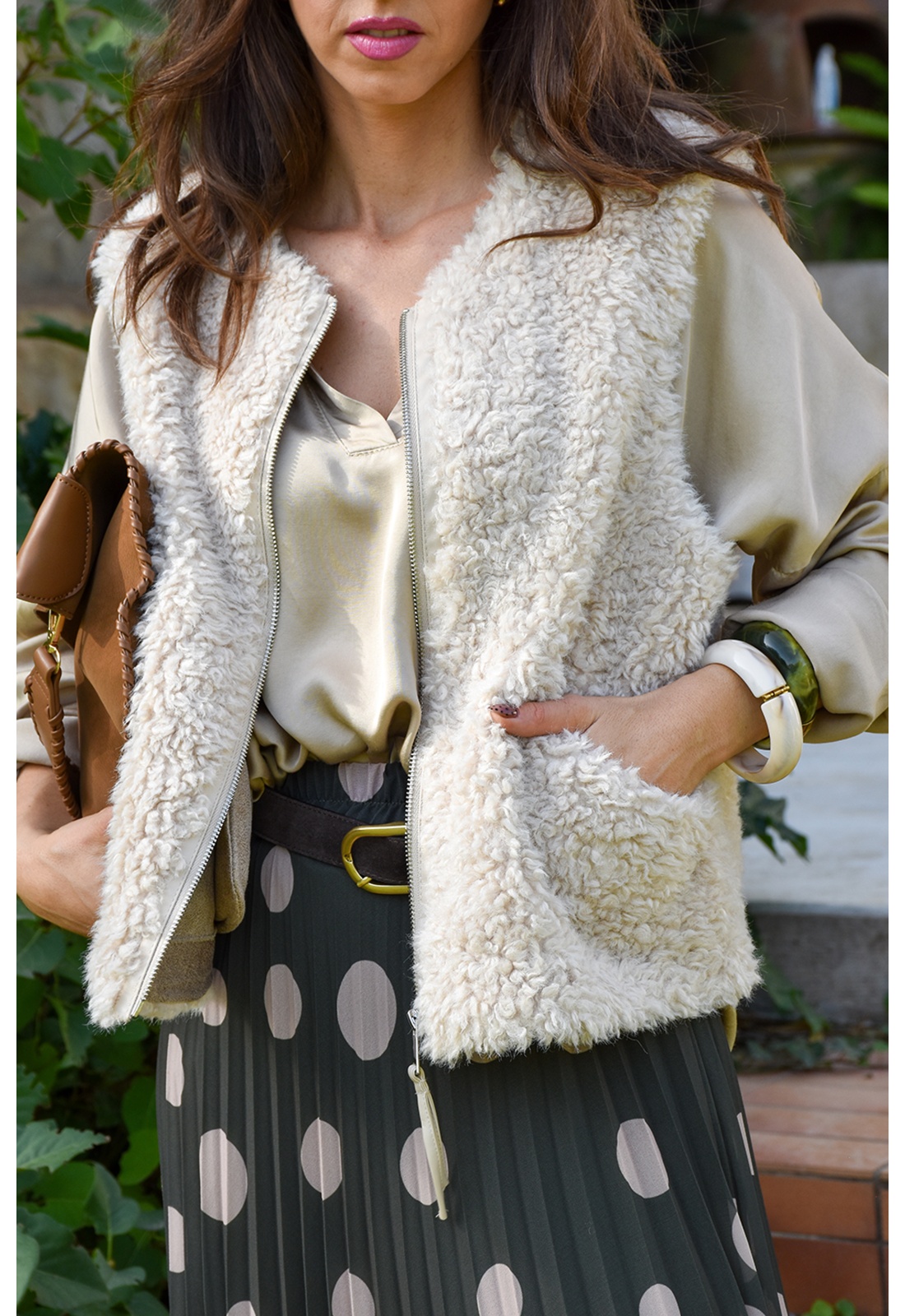 Veste pour femmes.De couleur écrue.En moumoute.Col rond.Sans manches.Matière douce.2 poches coupées à l'avant.Se ferme par zip.Composition :100% Polyester.Fausse moumoute.La mannequin porte une taille S/M et mesure 160cm.