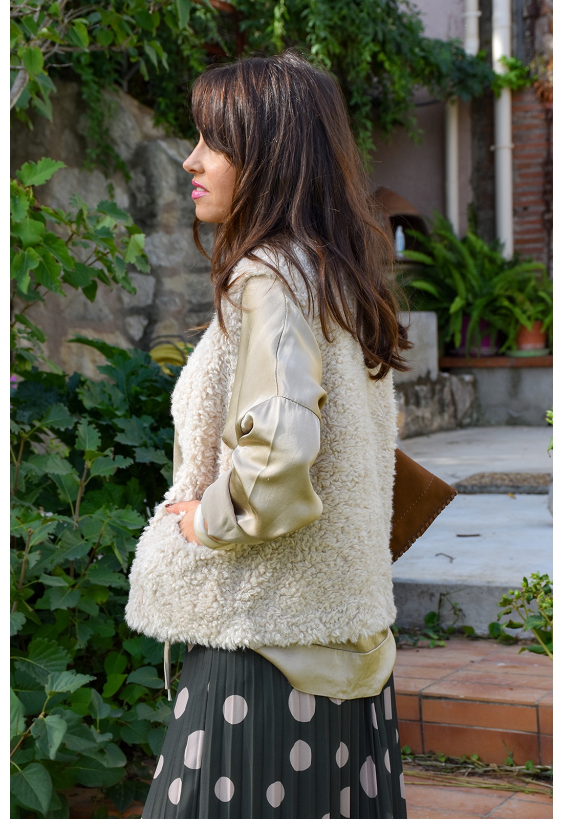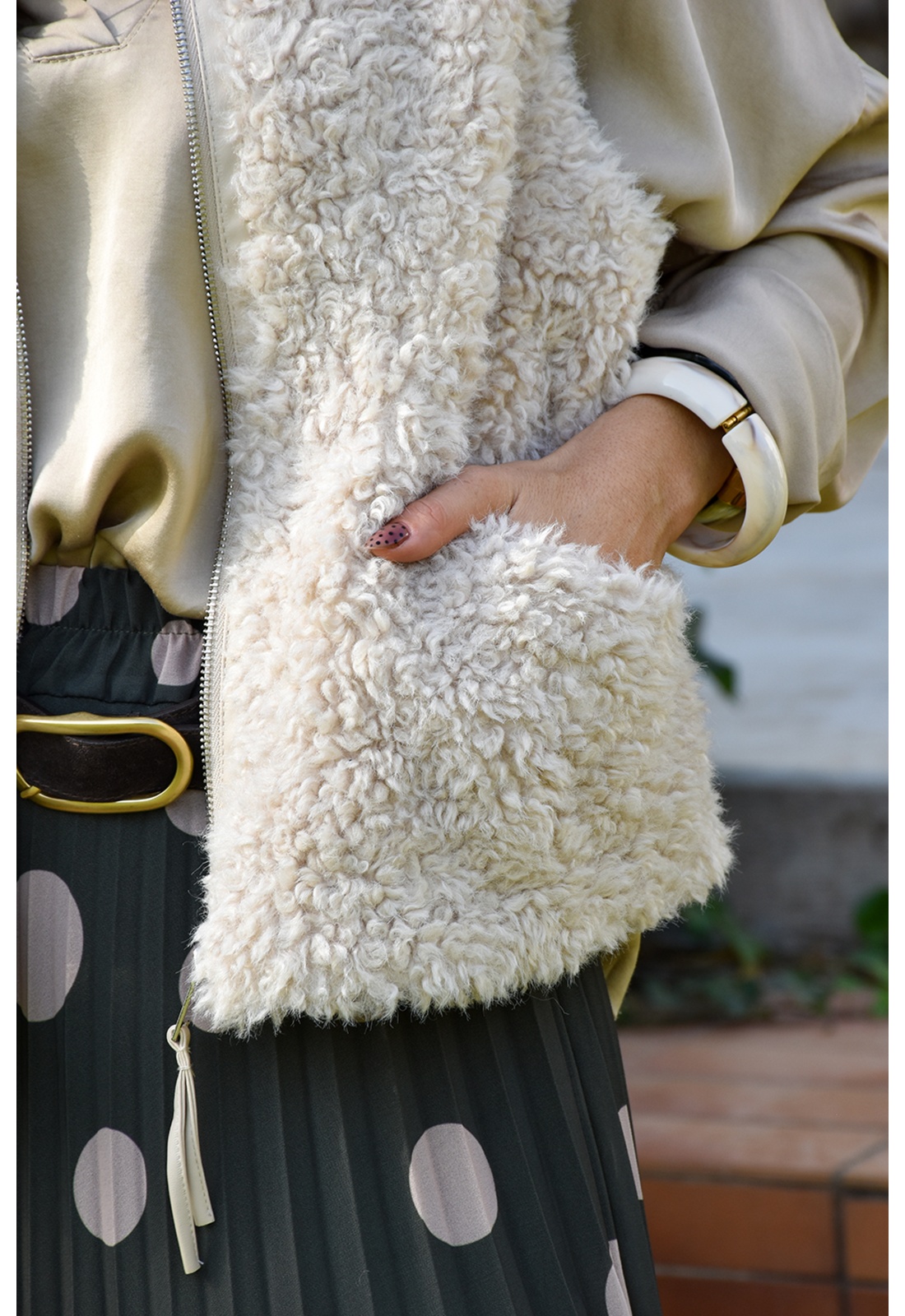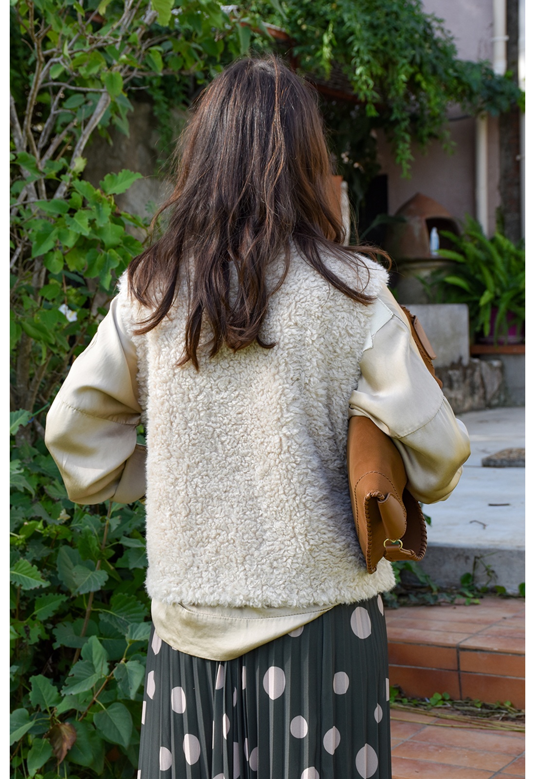 Veste pour femmes.De couleur écrue.En moumoute.Col rond.Sans manches.Matière douce.2 poches coupées à l'avant.Se ferme par zip.Composition :100% Polyester.Fausse moumoute.La mannequin porte une taille S/M et mesure 160cm.
