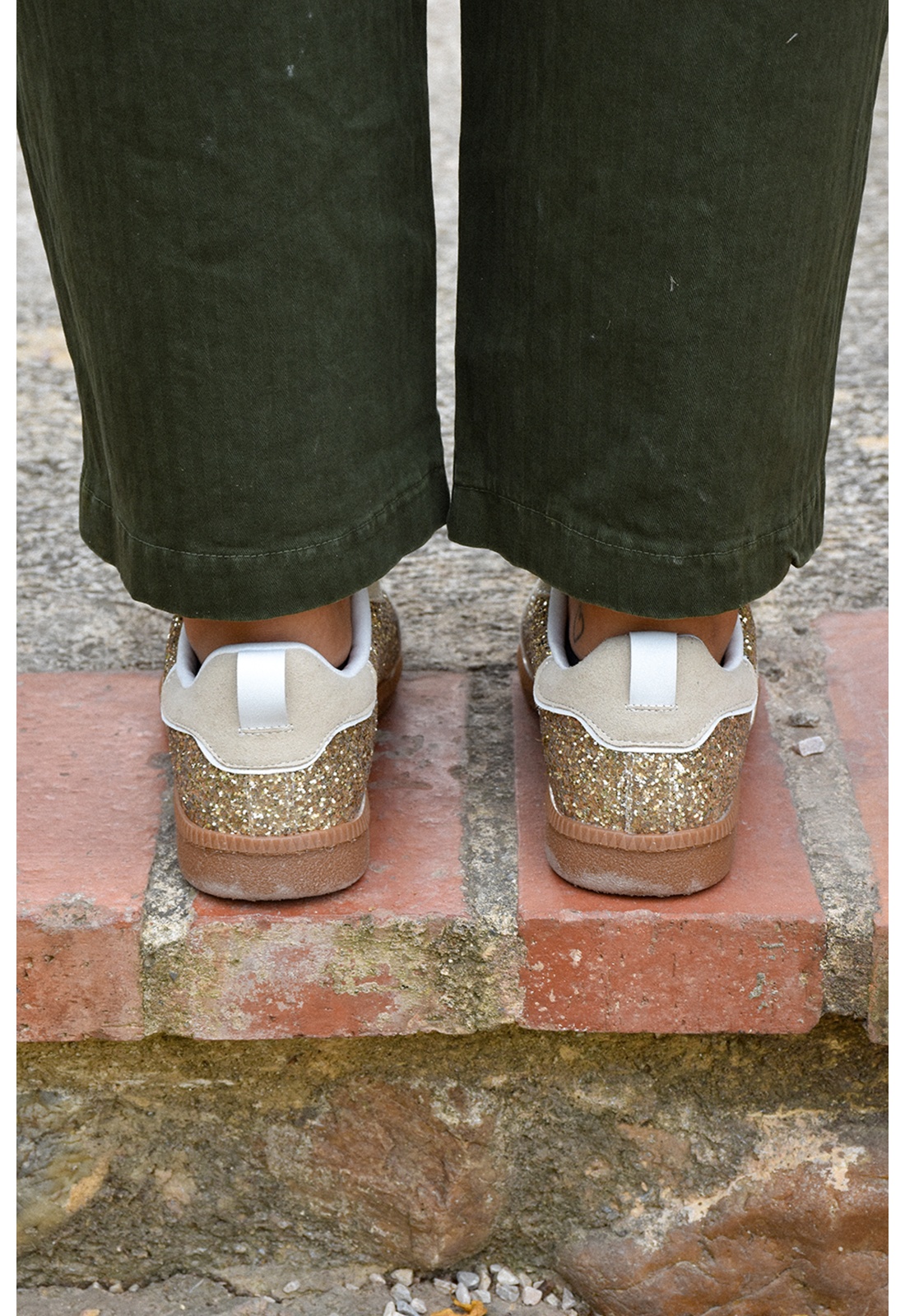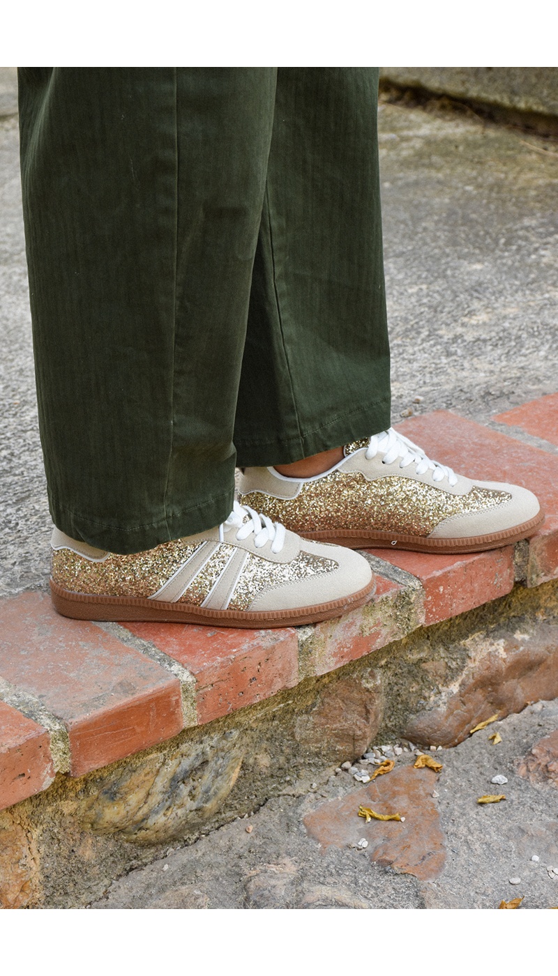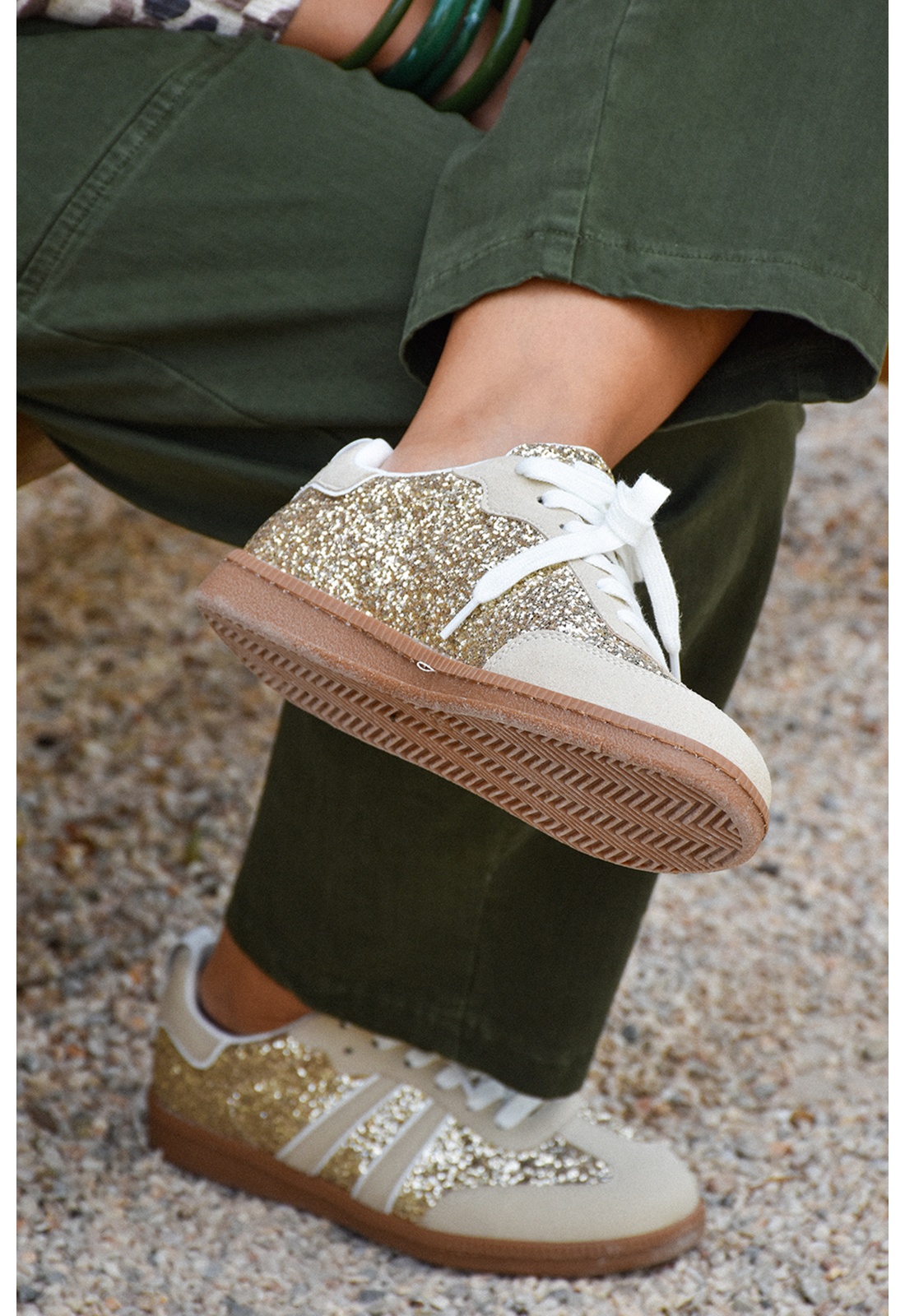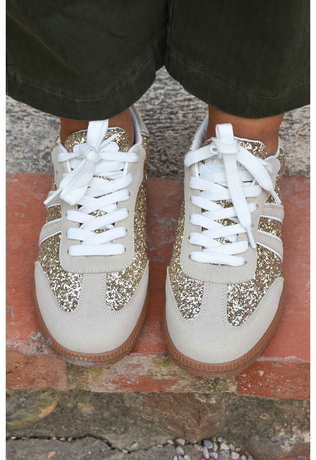 Baskets pour femmes.En suédine beige.Avec paillettes dorées.A lacets blancs.Avec semelles camel.Basses.