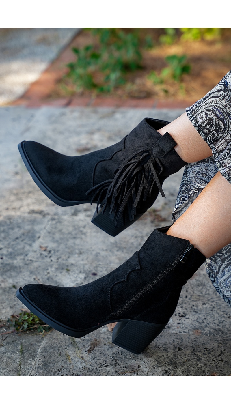 Bottines pour femmesDe couleur noire.En suédine.Avec franges.Basses.Semelles noires.Se ferme par zip.