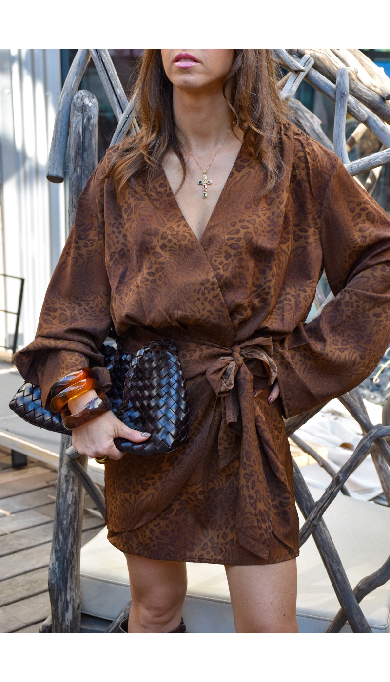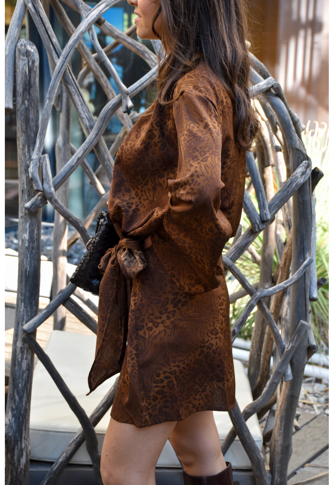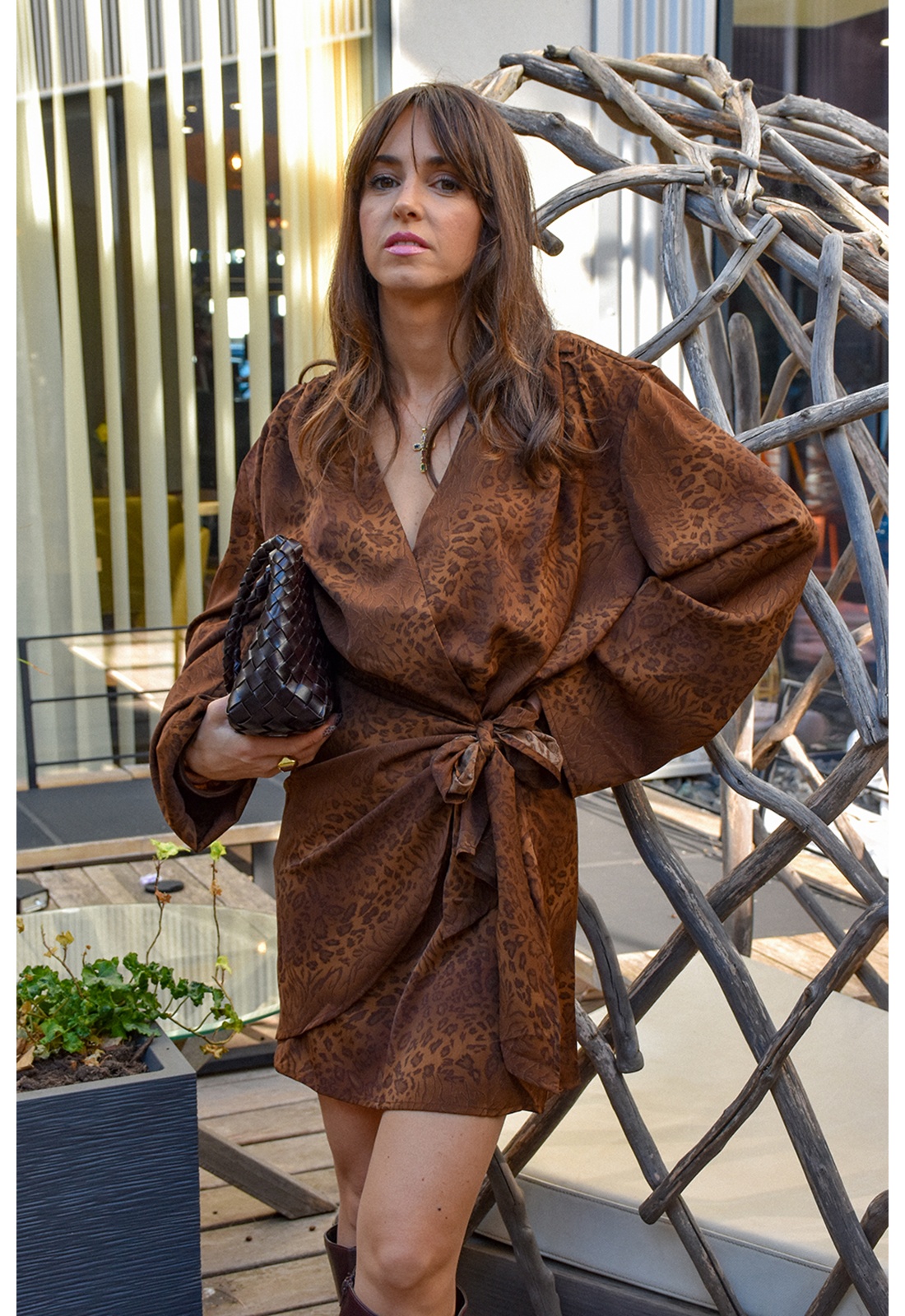 Robe pour femmes.De couleur camel.A motif léopard.Matière fluide.Col en V.Petit bouton pour fermer le décolleté.Manches longues.Courte et cintrée.Drapé à nouer sur l'avant.Composition :100% Polyester.La mannequin porte une taille S et mesure 160cm.