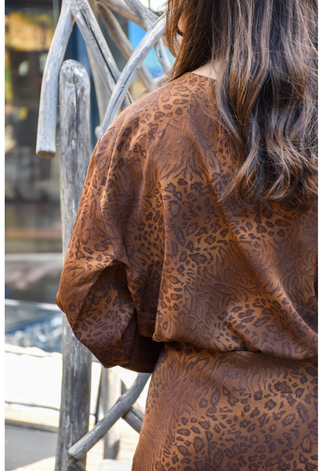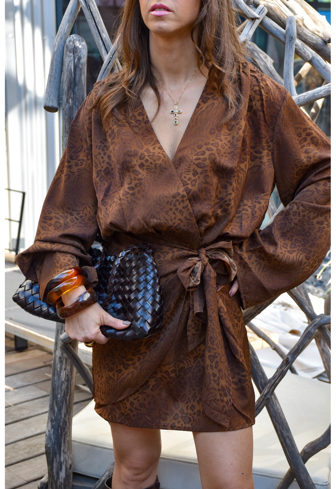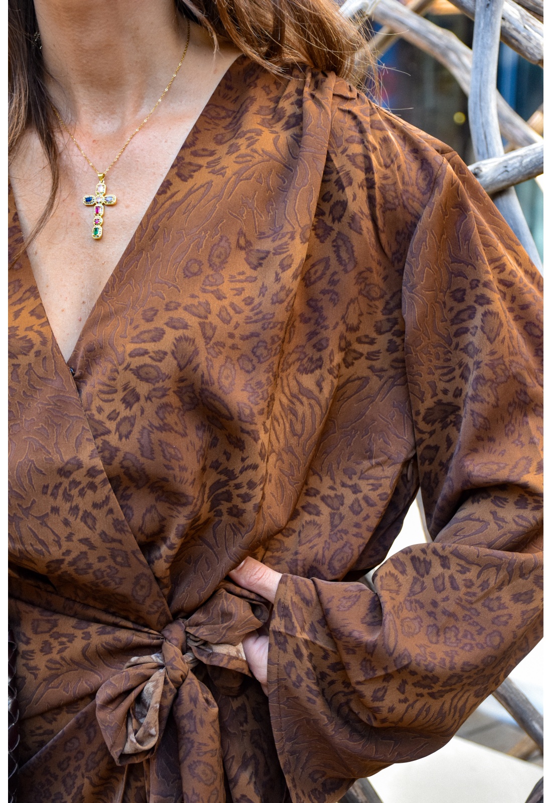 Robe pour femmes.De couleur camel.A motif léopard.Matière fluide.Col en V.Petit bouton pour fermer le décolleté.Manches longues.Courte et cintrée.Drapé à nouer sur l'avant.Composition :100% Polyester.La mannequin porte une taille S et mesure 160cm.