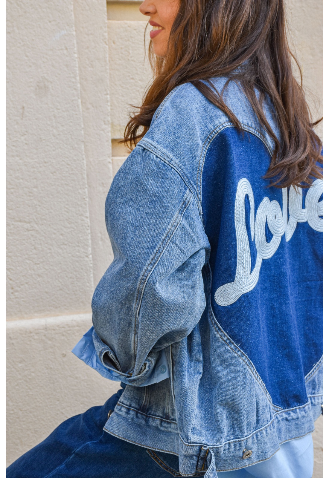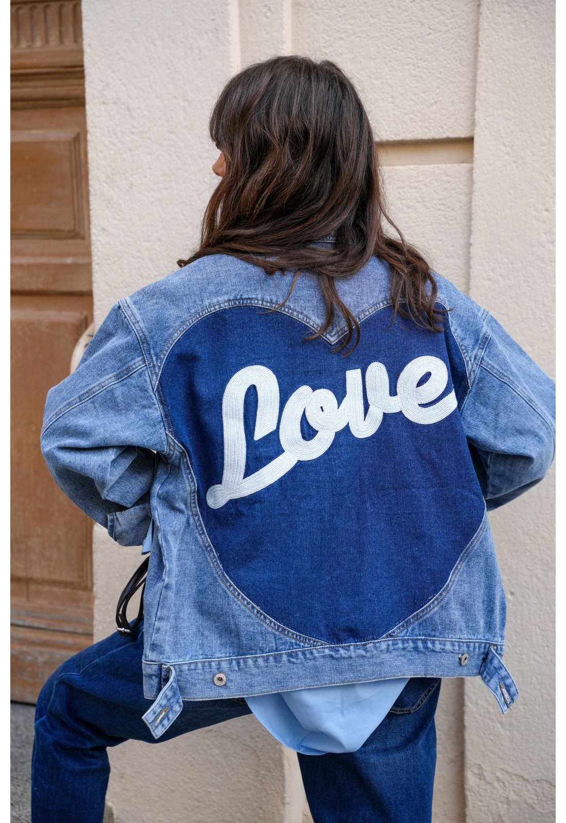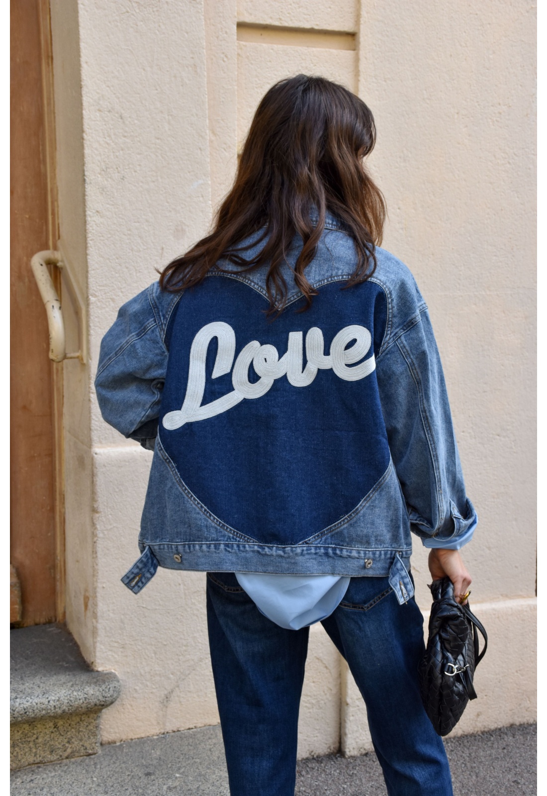 Cœur en jean brut au dos avec broderie "love" blanc.