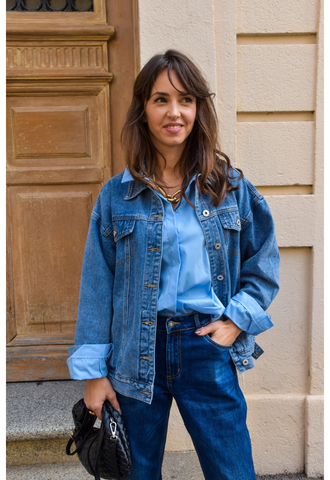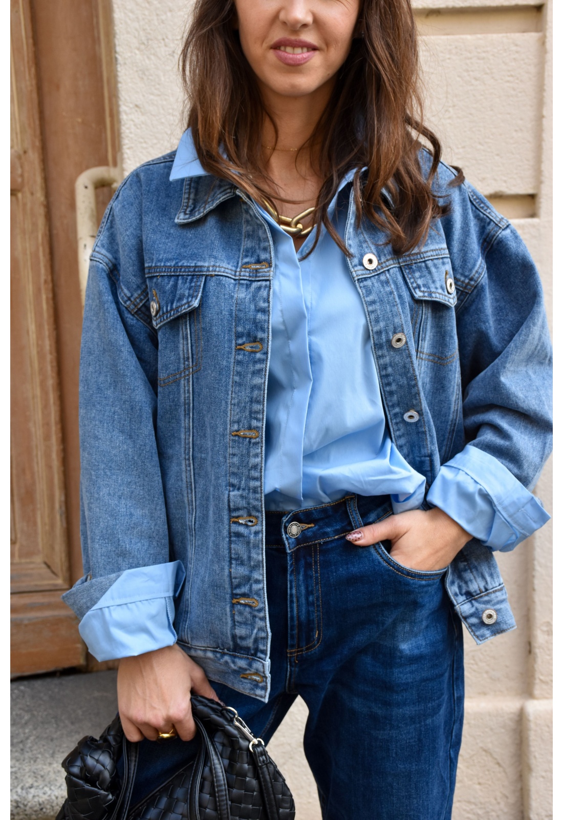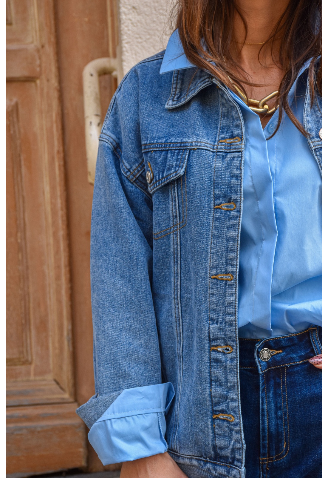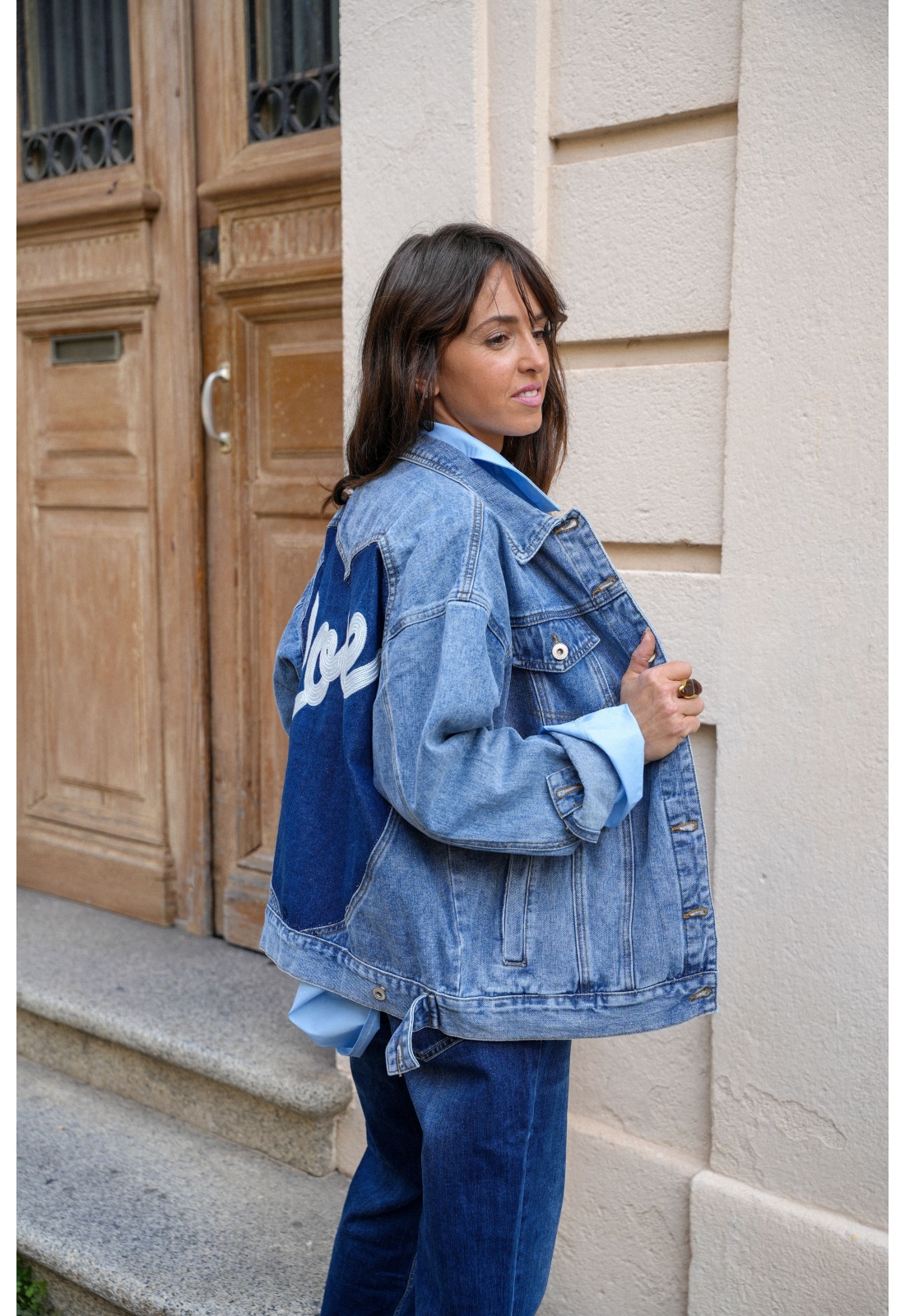 Cœur en jean brut au dos avec broderie "love" blanc.
