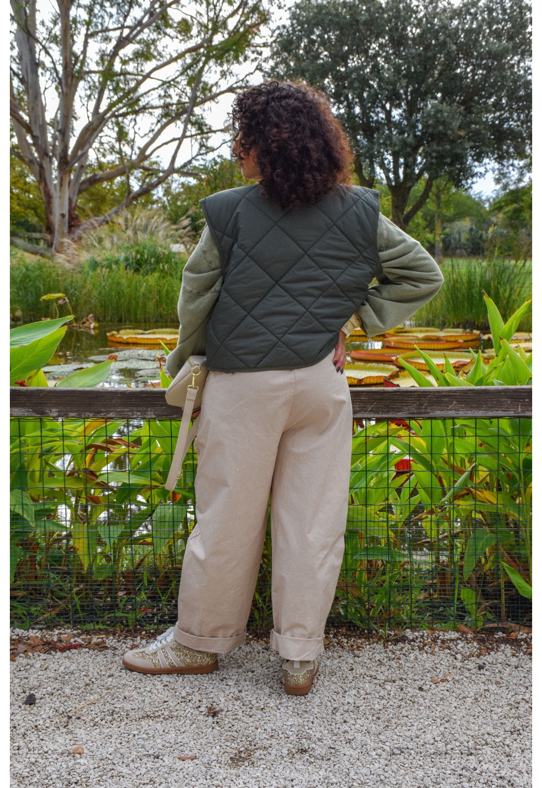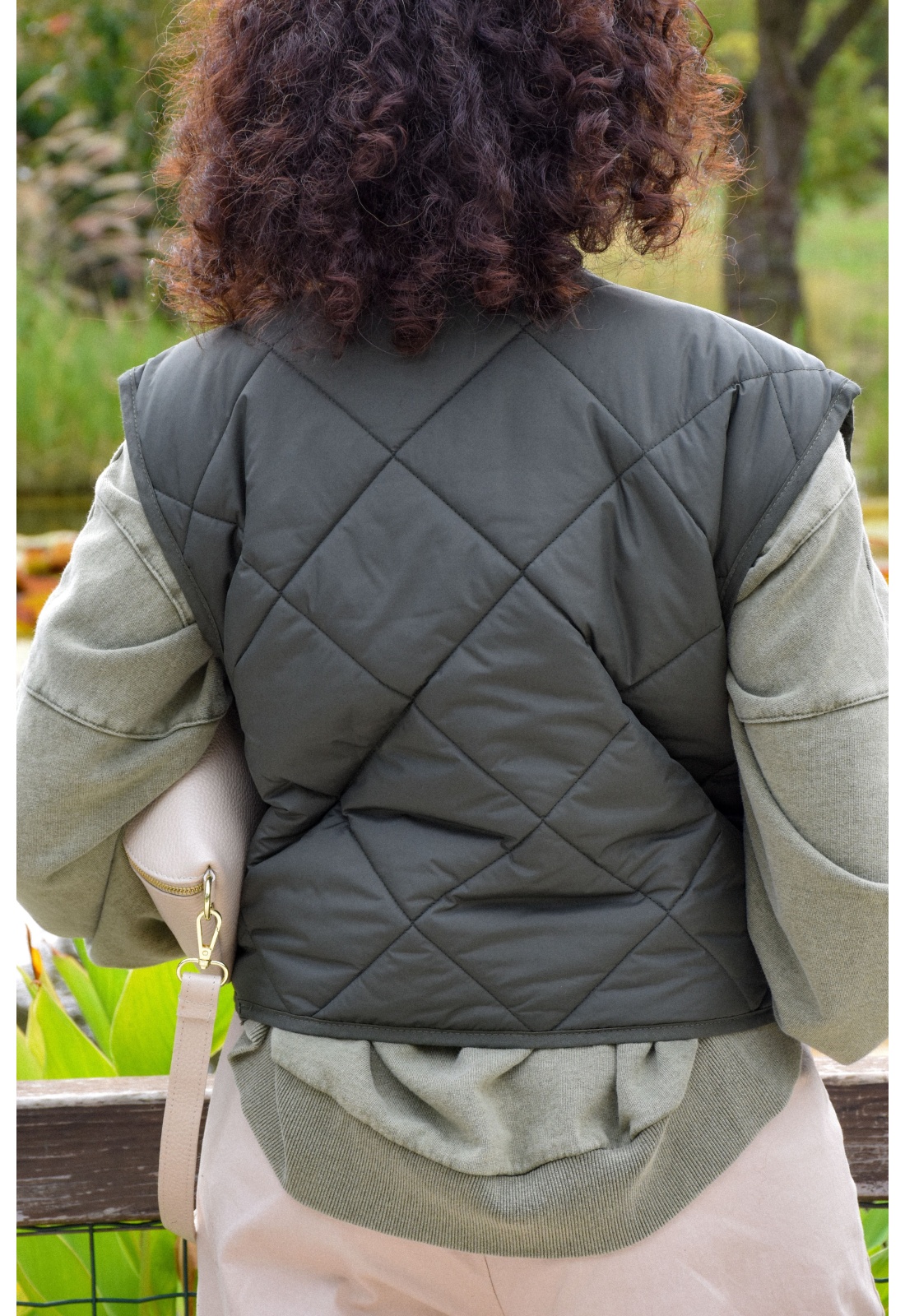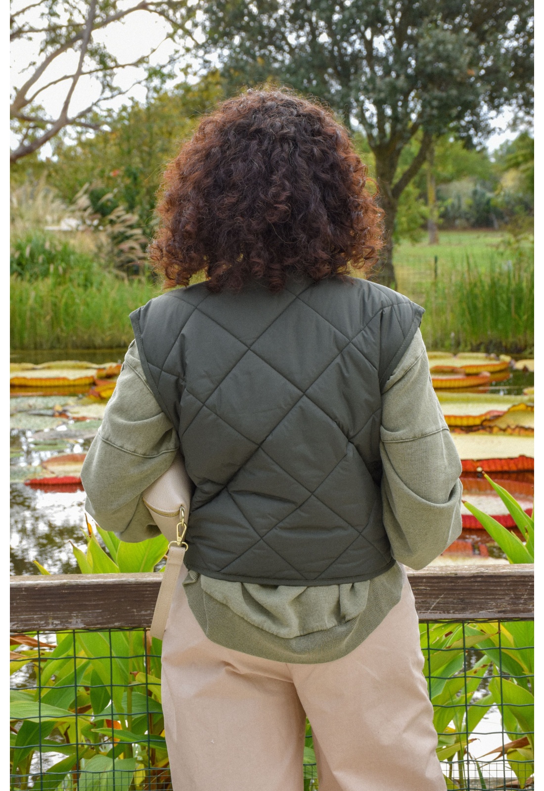 Veste matelassée kakiCol rondSans manchesFermeture par bouton pressionPoches avant plaquée