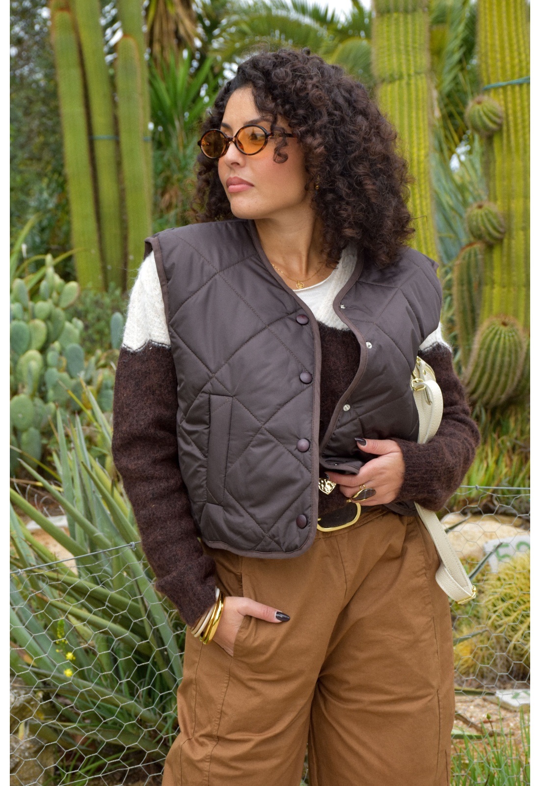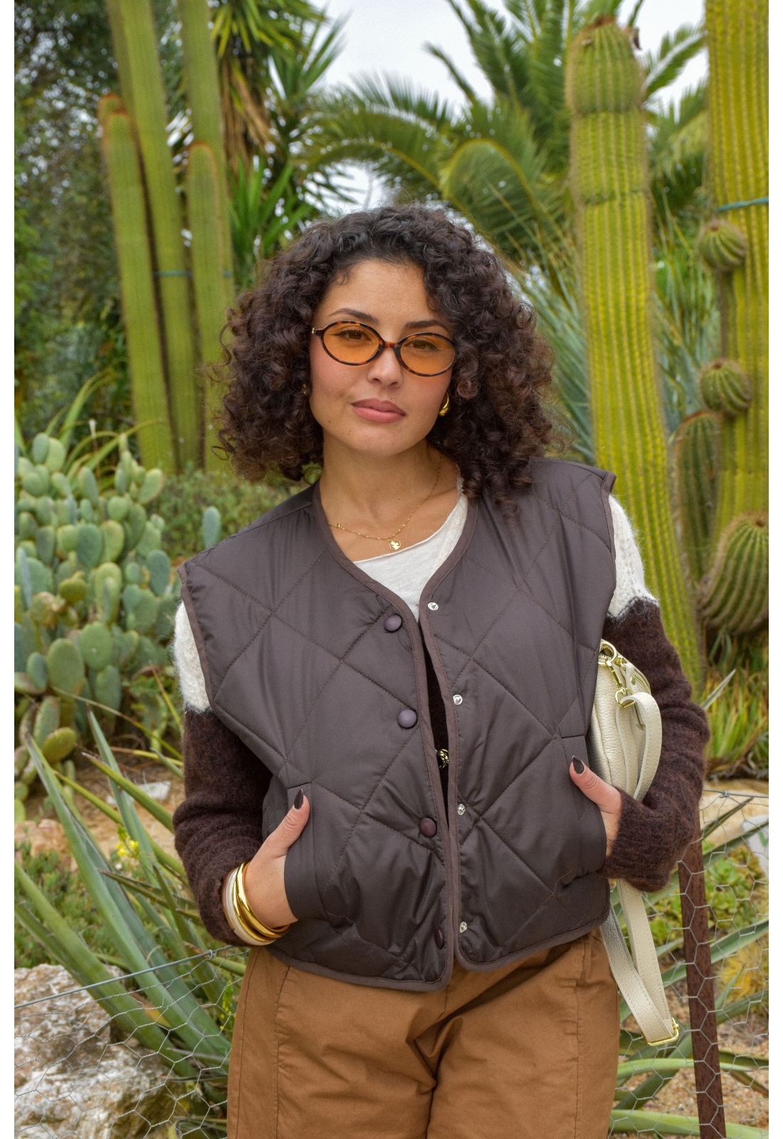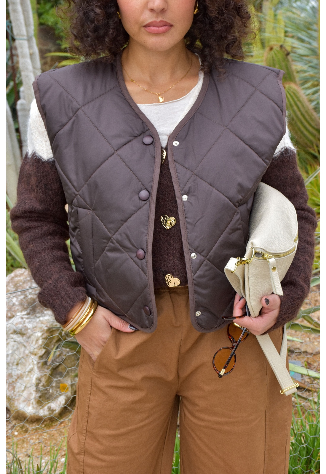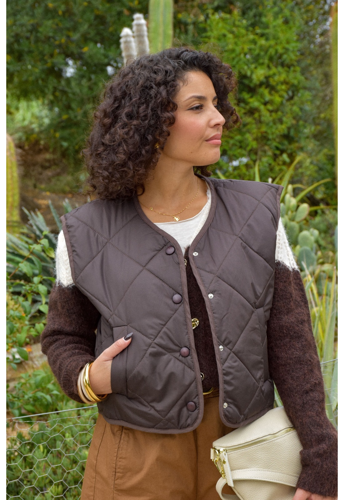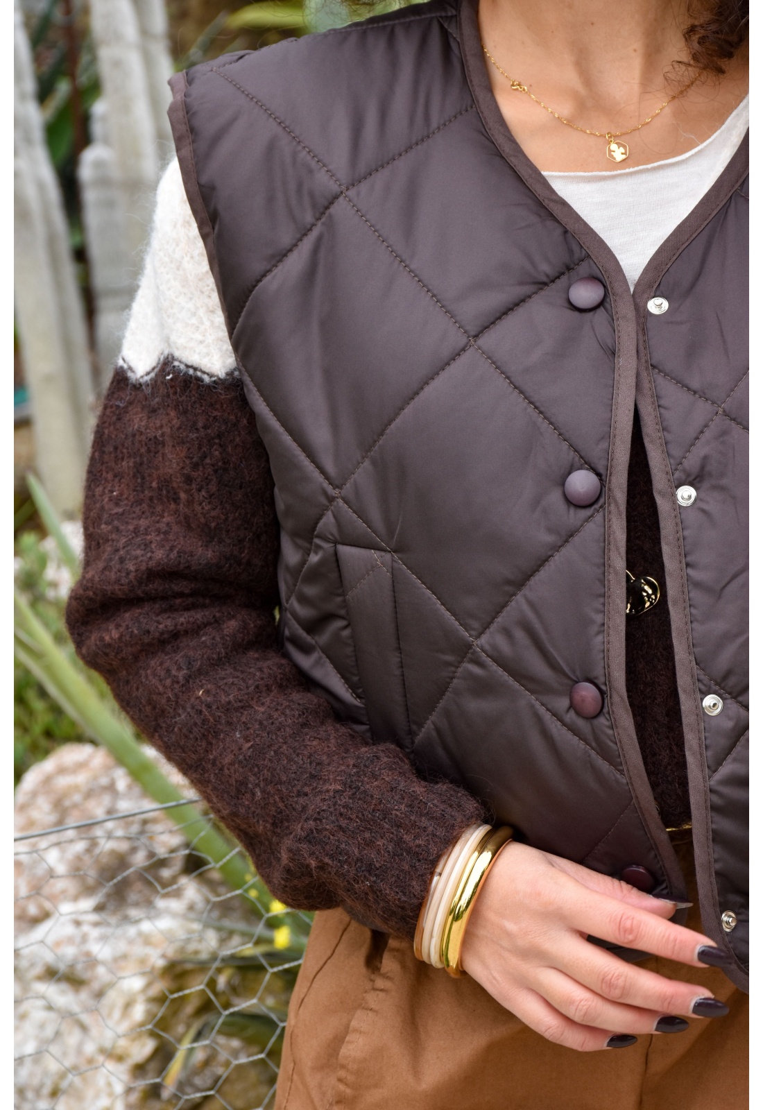 Veste matelassée chocolatCol rondSans manchesFermeture par bouton pressionPoches avant plaquée