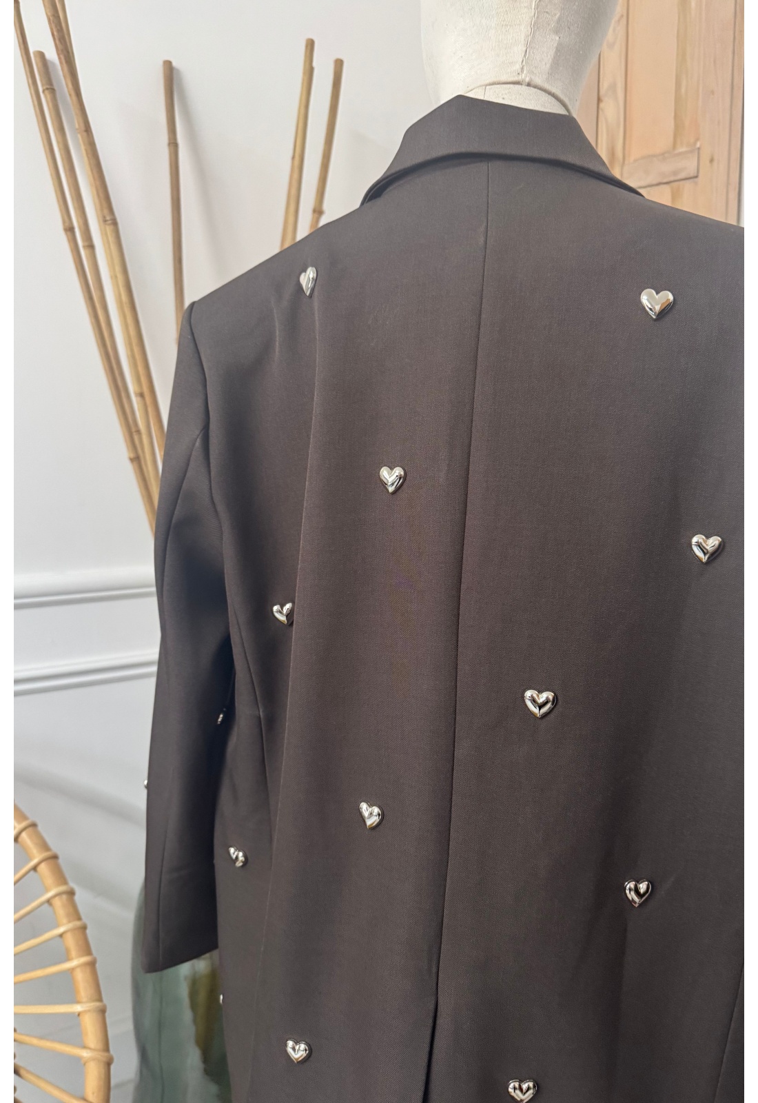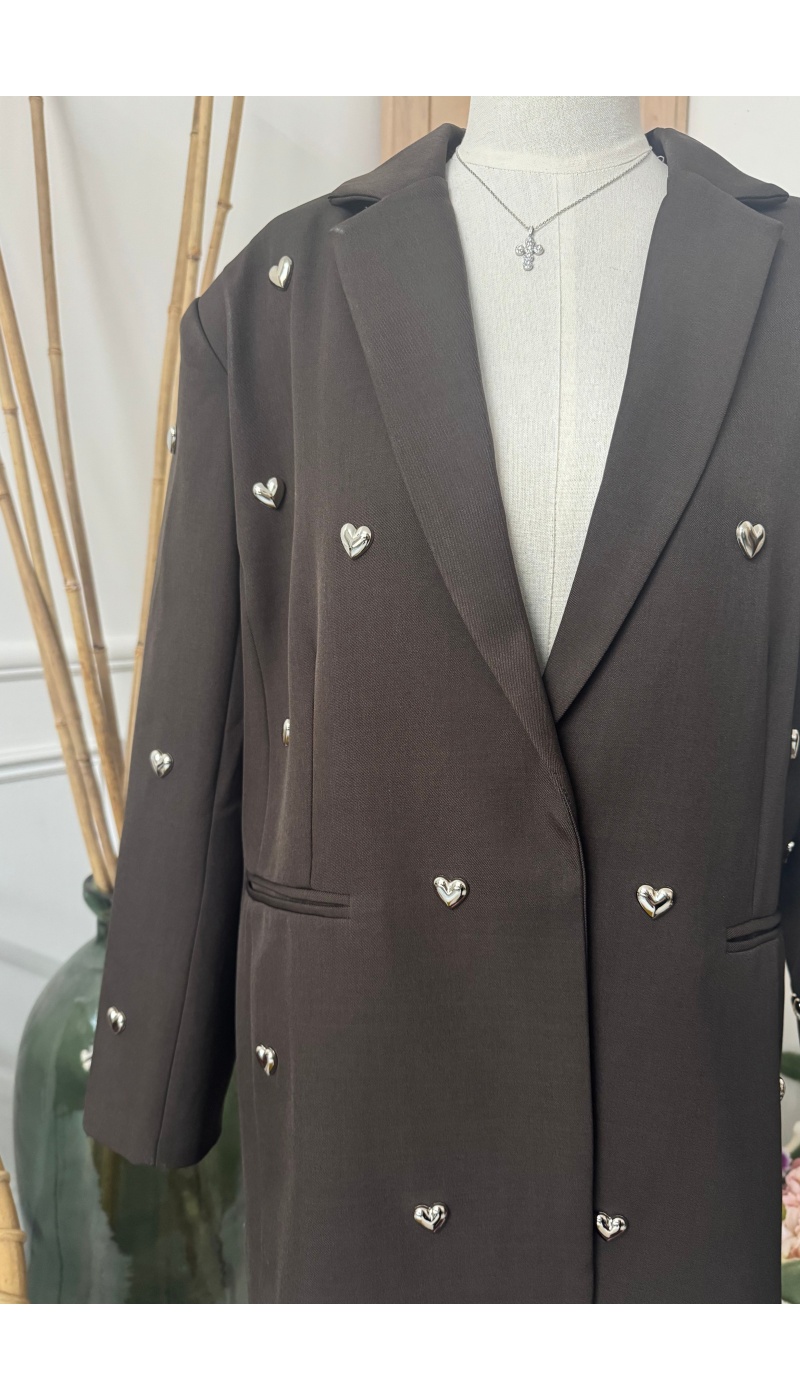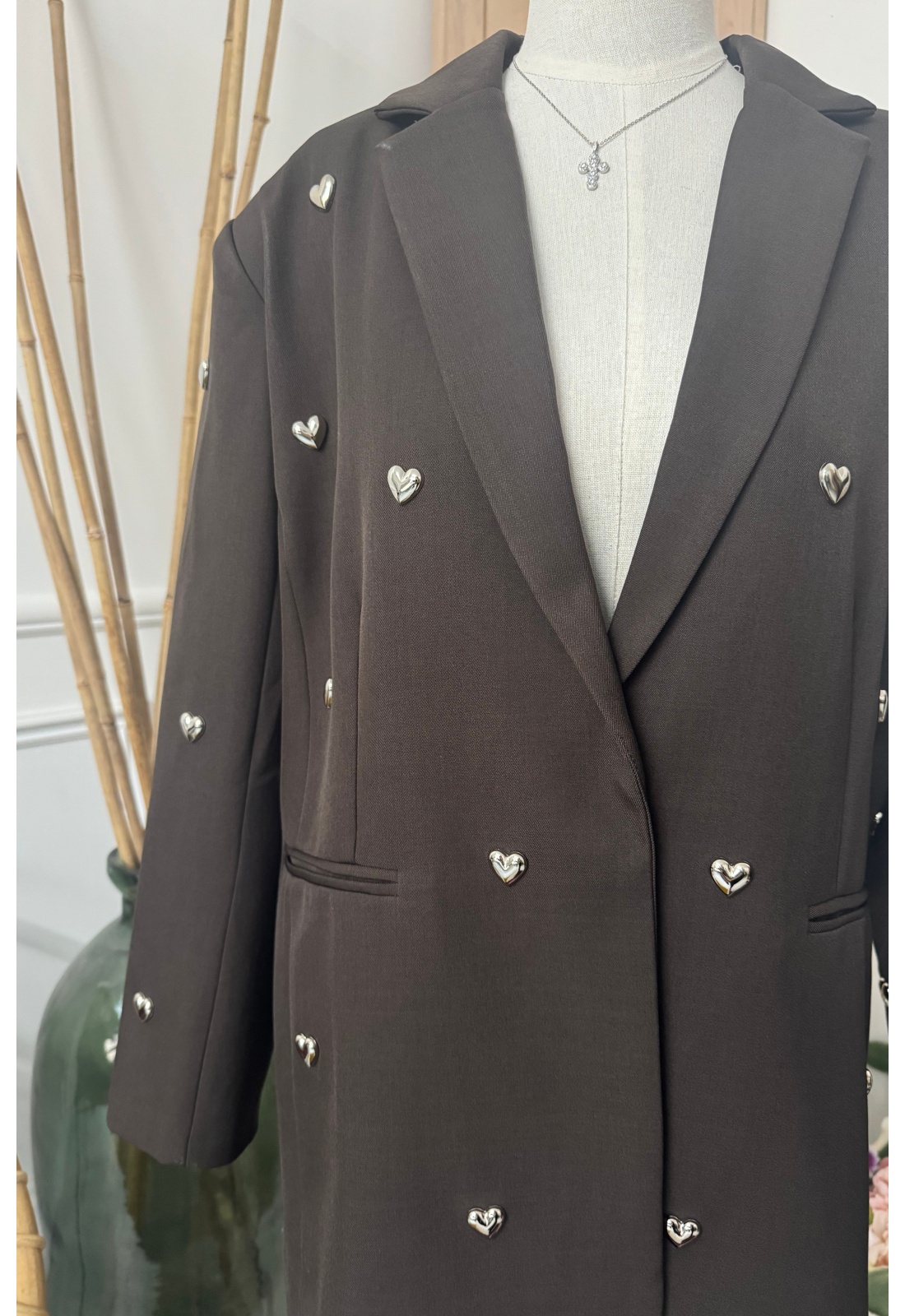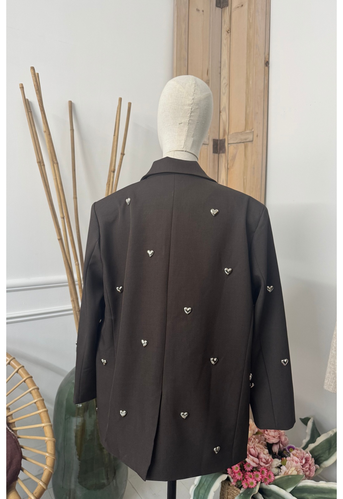 Blazer pour femmes.Détails de coeur argentés .Coloris chocolat.Avec des épaulettes.Col à revers.Manches longues.Coupe droite.Deux fausse passepoilée à l'avant.Se ferme avec un bouton à pression.Composition :94% Coton.6% Elasthane.