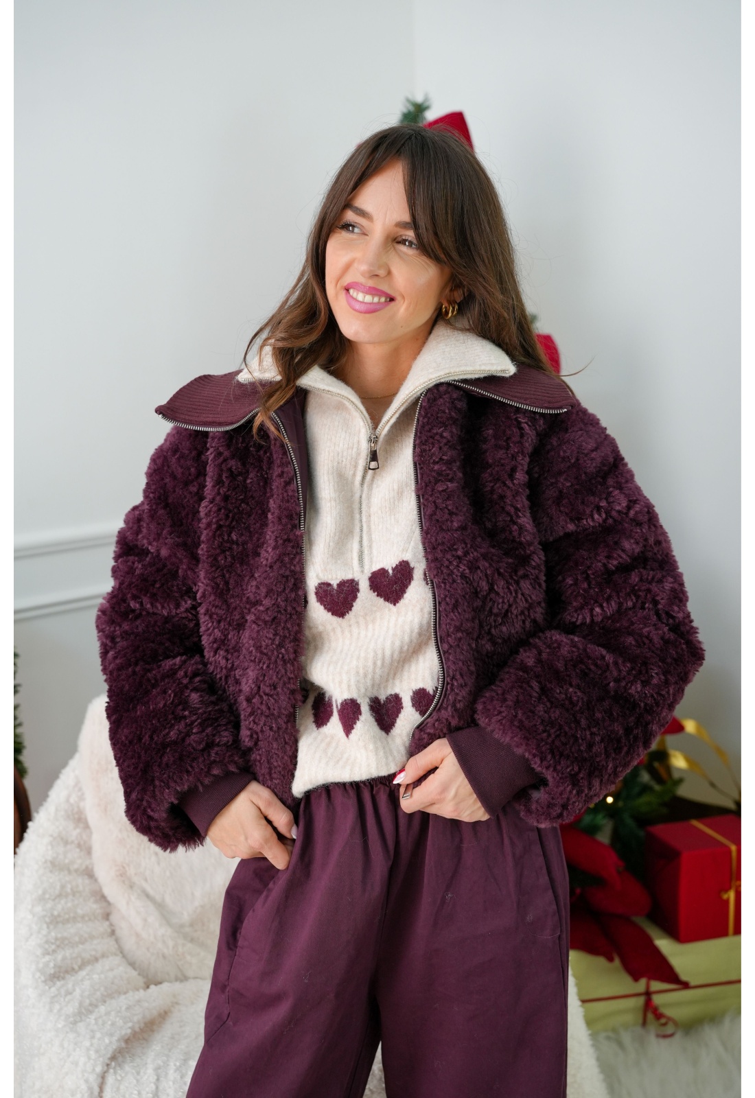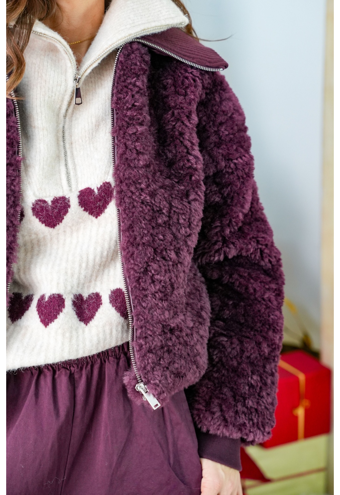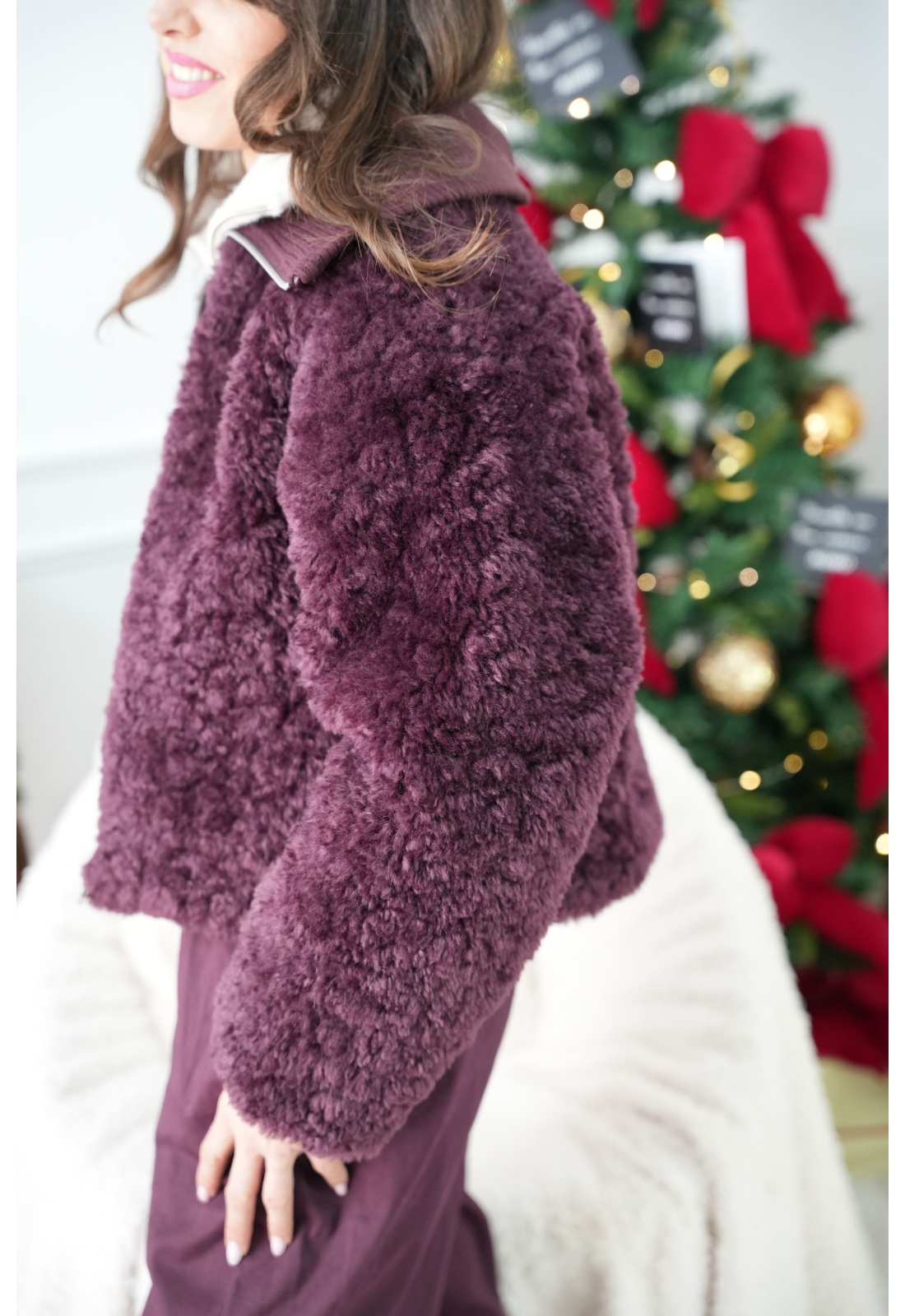 Veste pour femmes.De couleur prune.En fourrureDe chez VILA.Col haut.Manches longues.Courte.Coupe droite.Poches latérales.Entièrement doublée.Avec fermeture éclair.