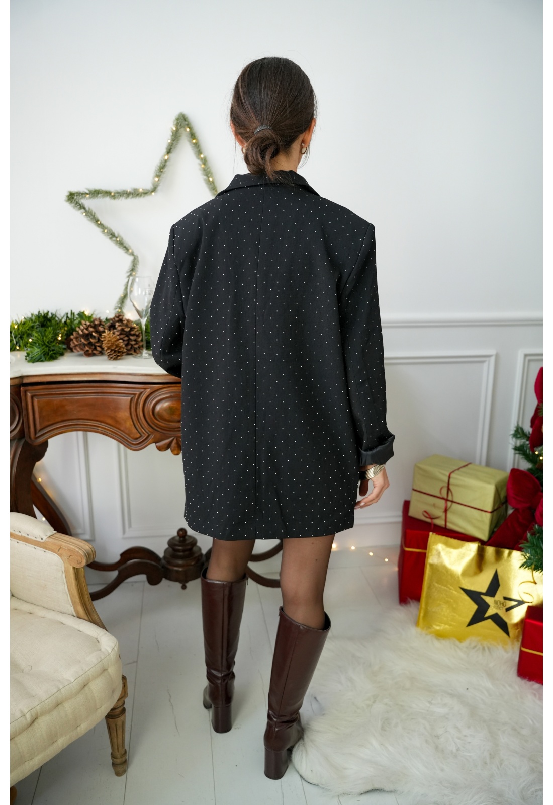 Blazer pour femmes. De couleur noir. A strass argents. Col à revers. Manches longues. Avec petites épaulettes. Coupe ample. 2 poches à rabats. Se ferme par un bouton noir.