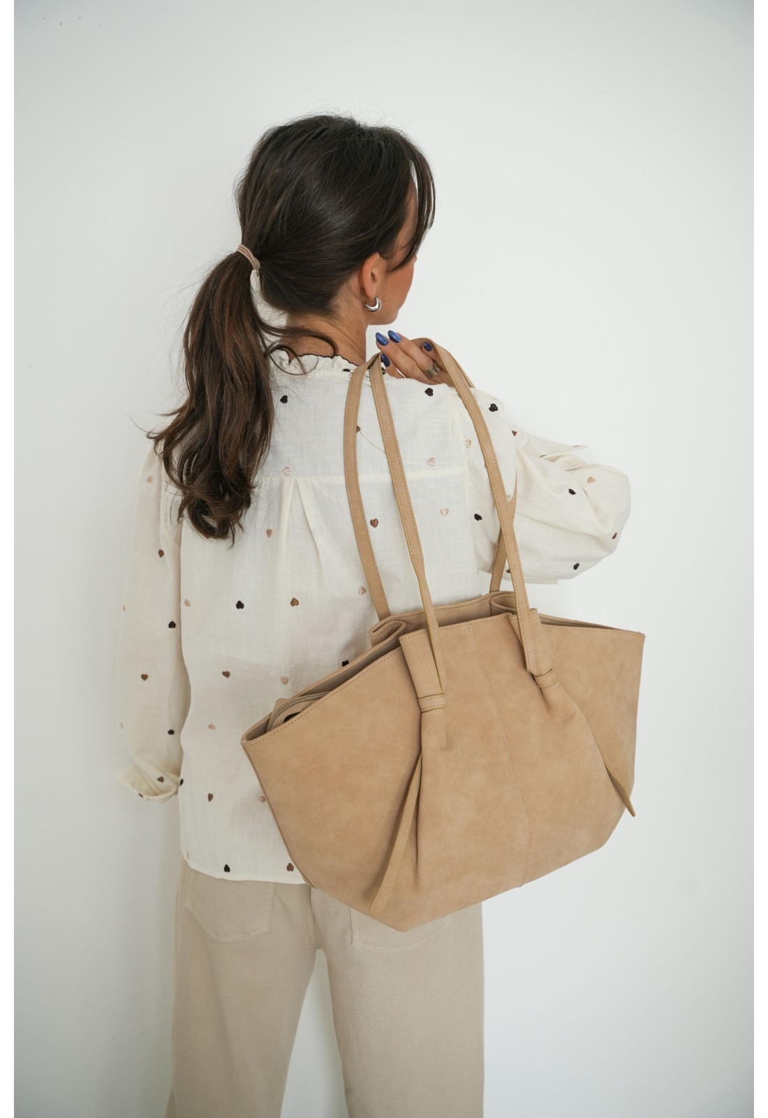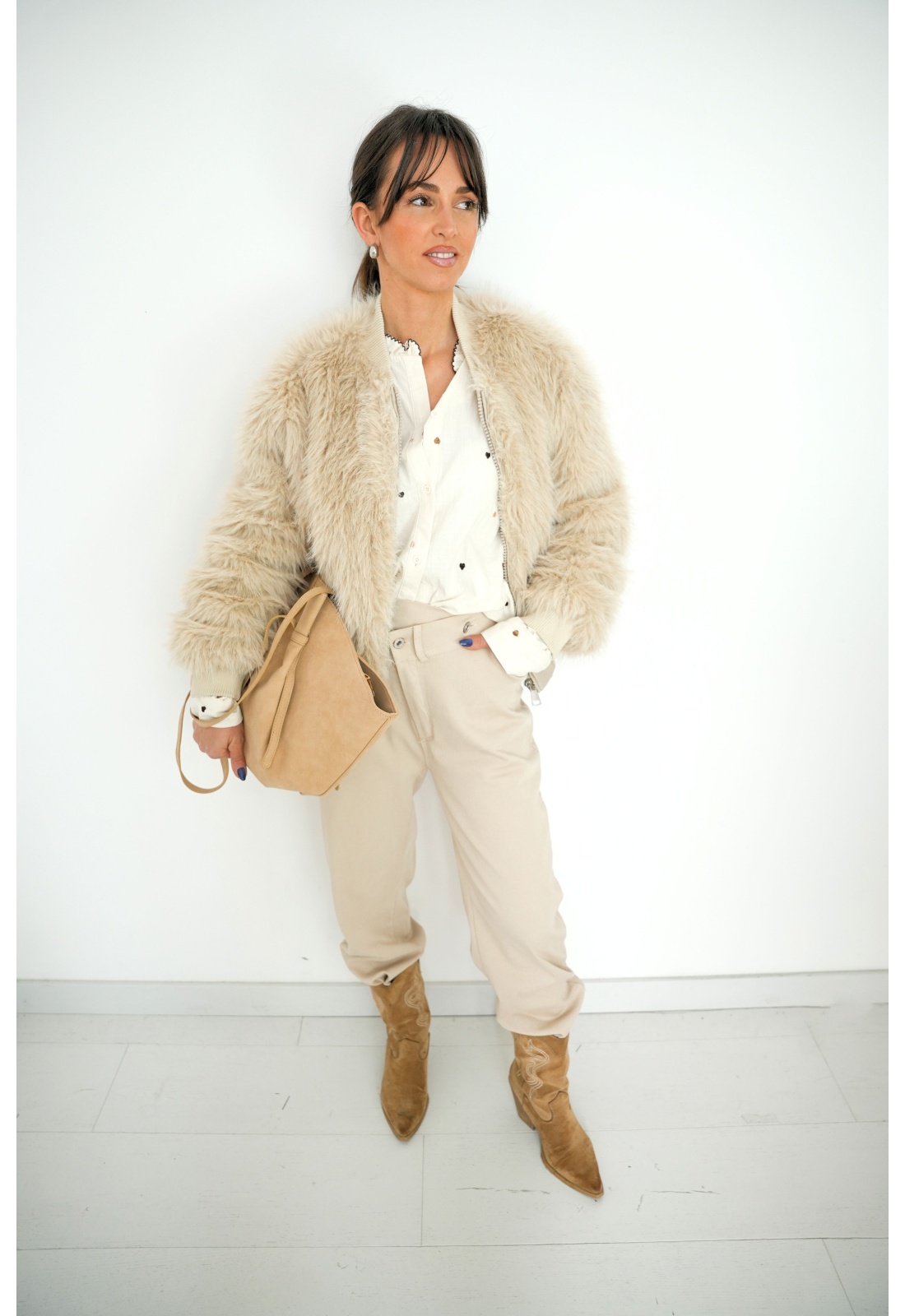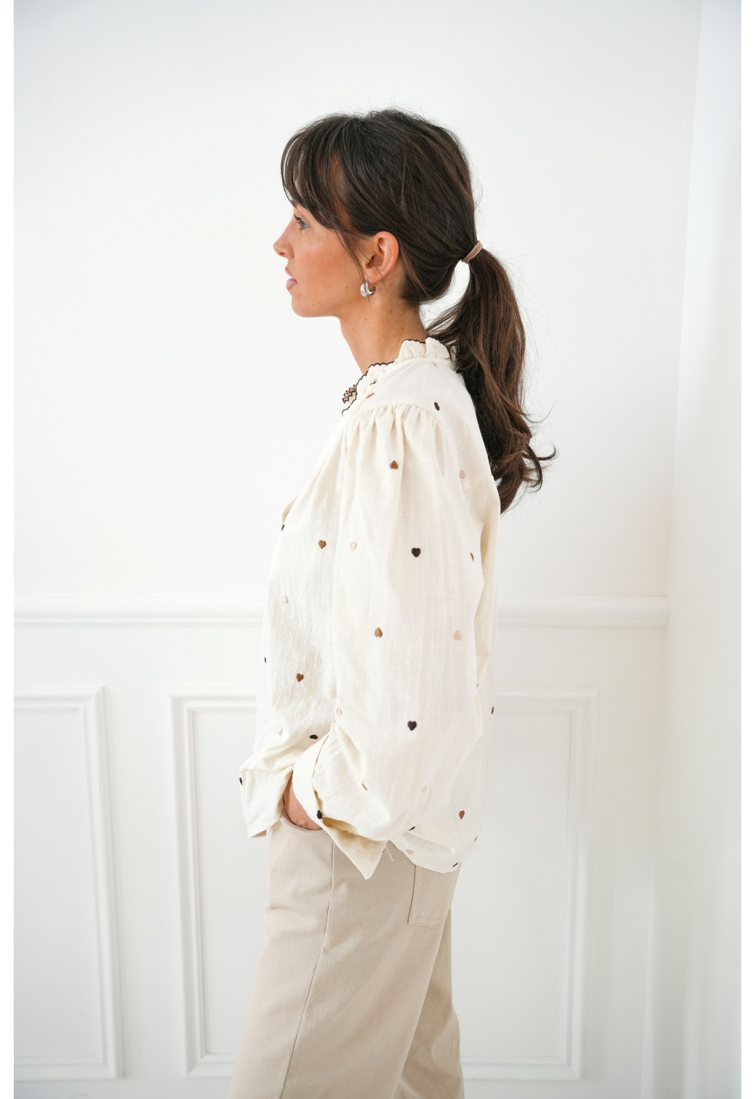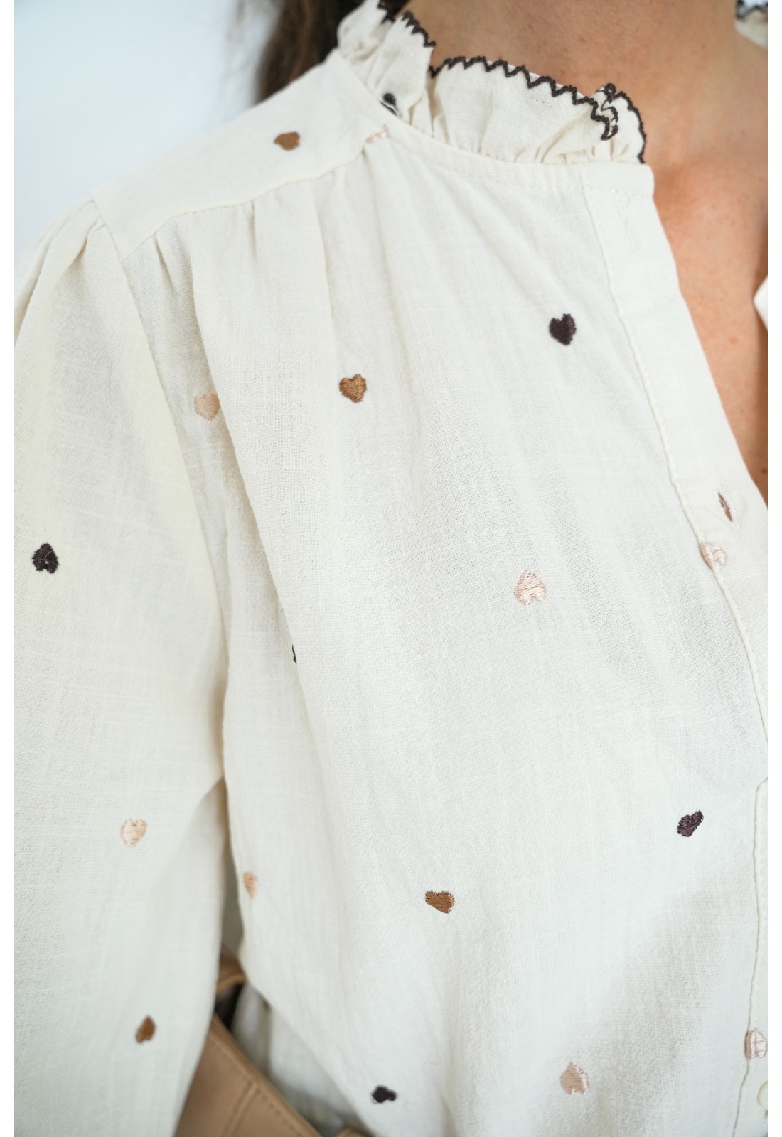 Chemisier pour femmes.De couleur écru.Coeurs brodés.Col rond à volants.Manches longues.Poignets boutonnés.Coupe droite.Se ferme par boutons.Composition :100% Coton.La mannequin porte une taille unique et mesure 160cm