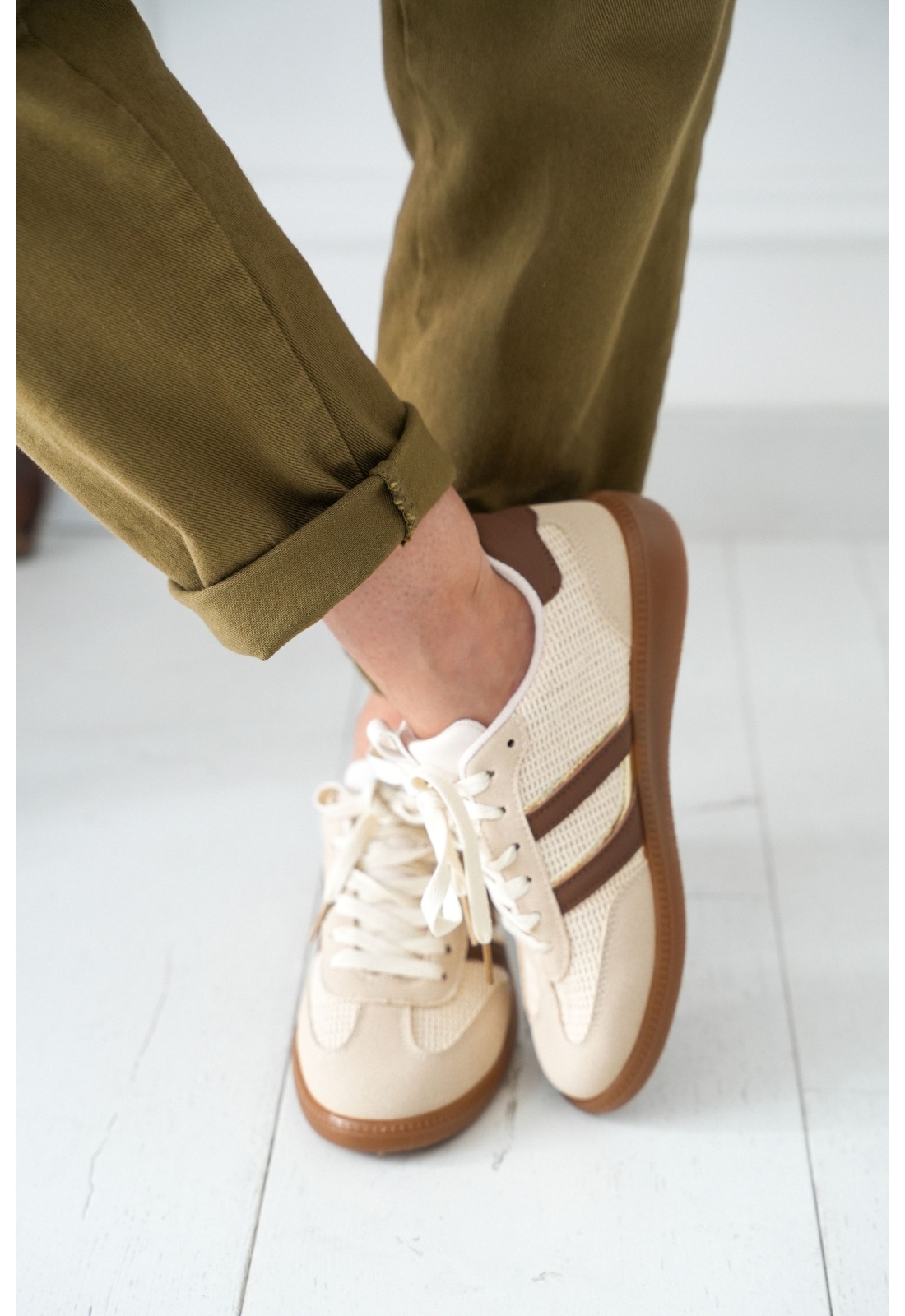 Baskets pour femmes.De couleur écrue et marron.Paire de lacets écrus.Semelles plates camel.Modèle bas.Il est conseillé de prendre votre taille habituelle.