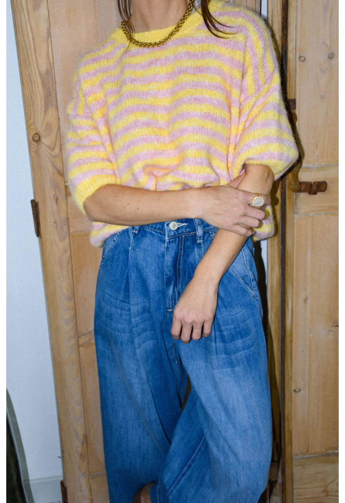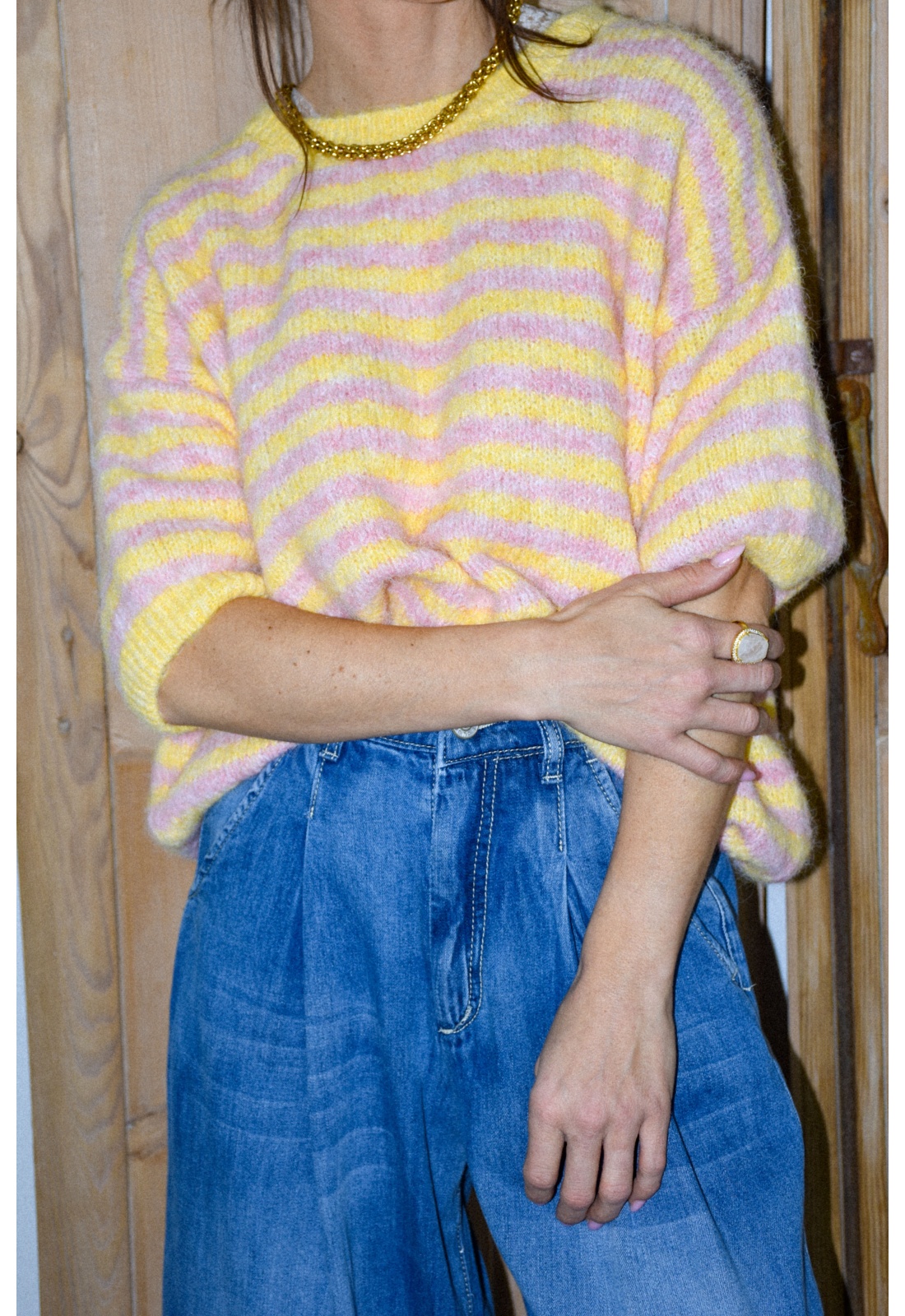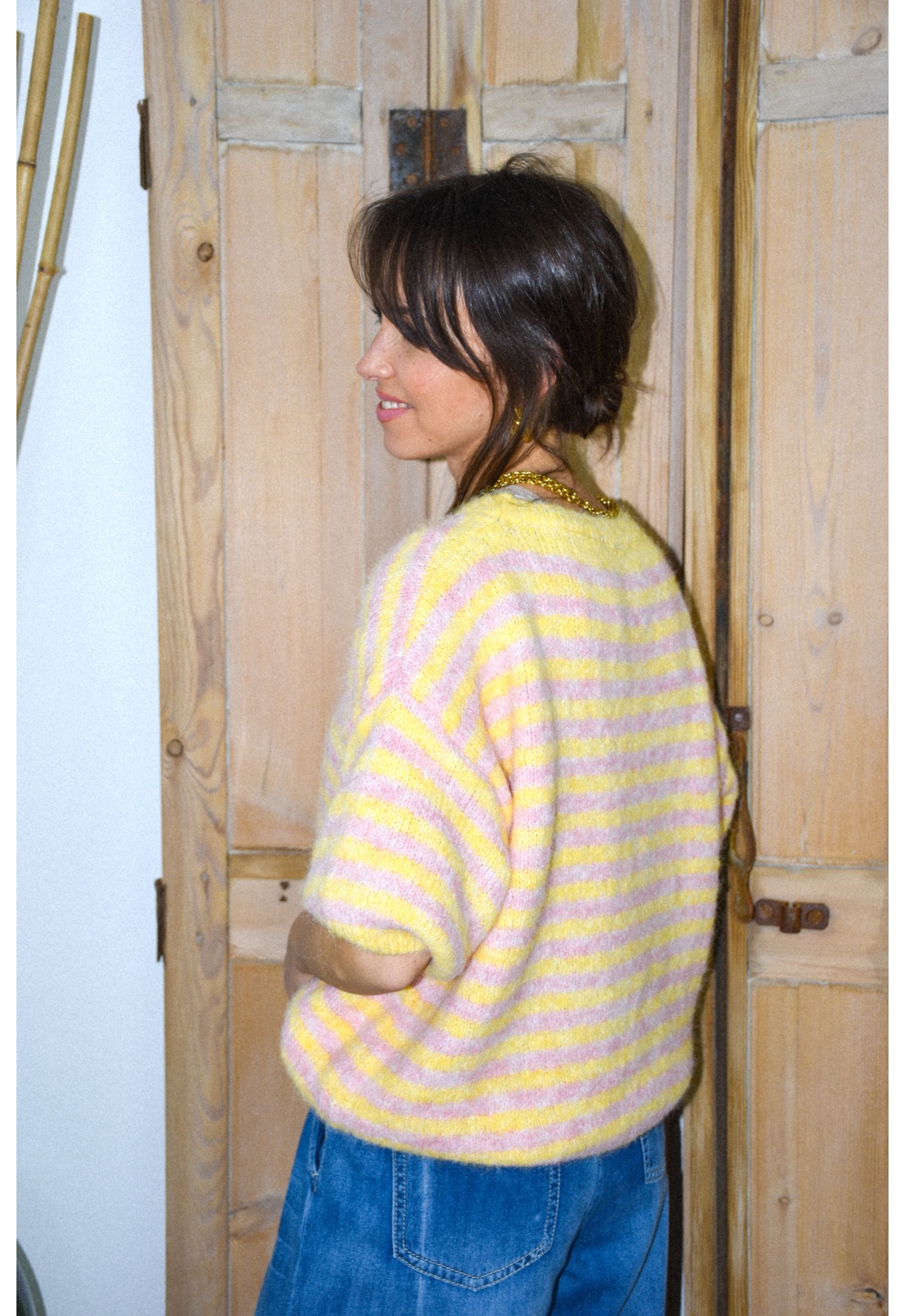 Pull pour femmes.Rayé jaune et rose.Manches courtes.Col rond.Composition:80% Polyester.8% Laine.1% Elasthanne.Fabriqué en Italie.La mannequin porte une taille unique et mesure 160 cm.