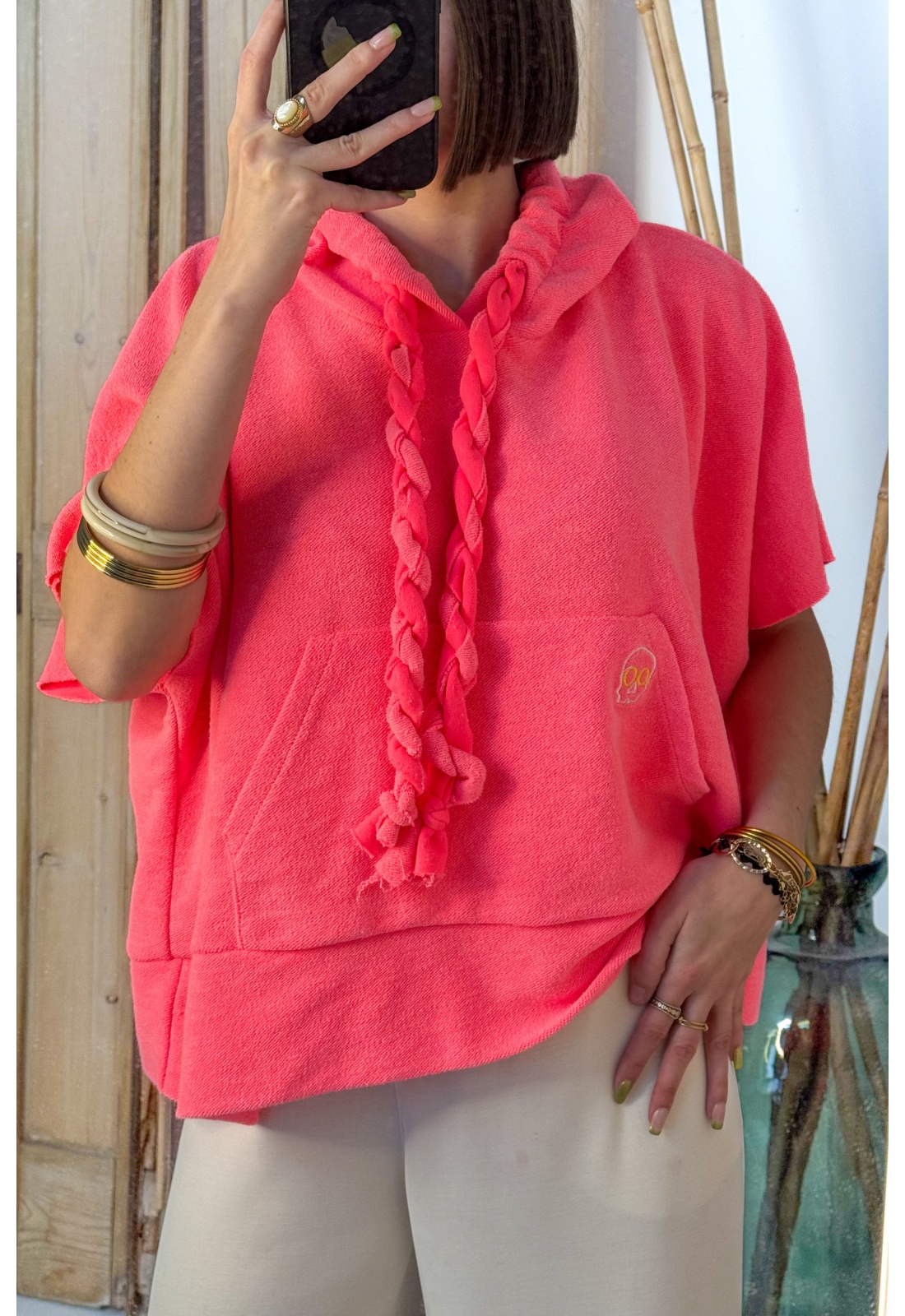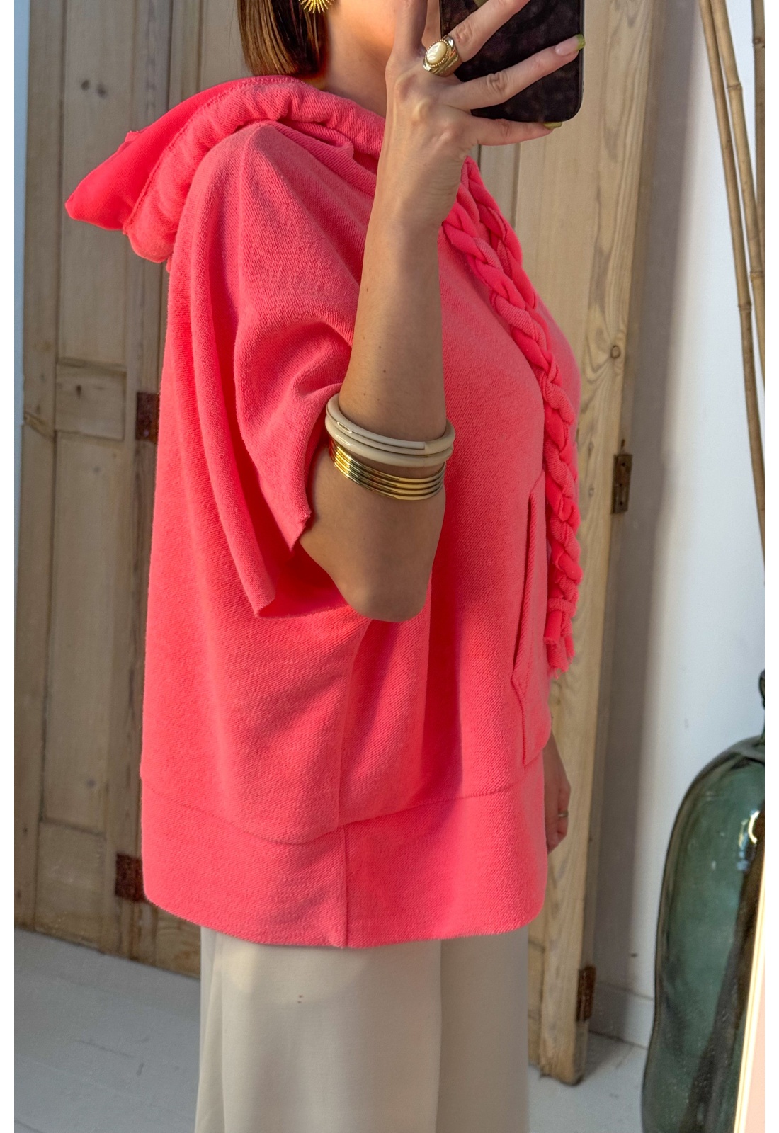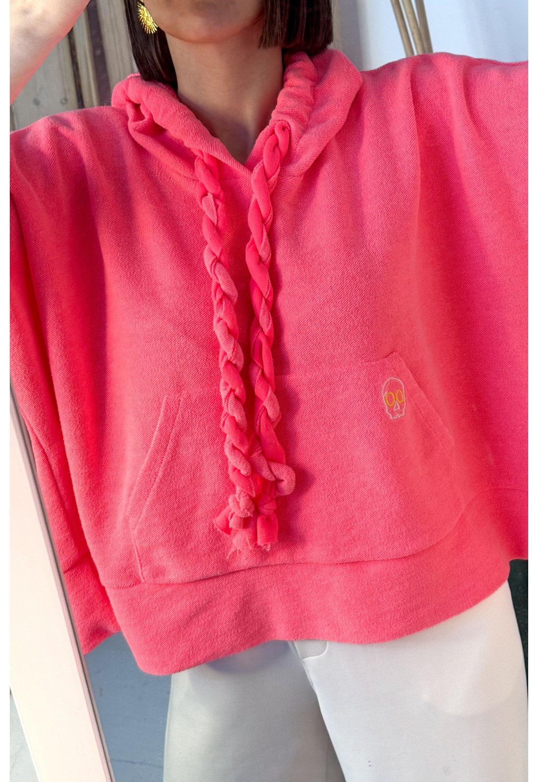 Enfile ce pull sweat rose fluo et laisse ton style parler pour toi. Sa capuche cosy et sa coupe fluide te donnent une allure décontractée, parfaite pour flâner en ville, retrouver des amis ou te détendre à la maison avec confort et attitude.
