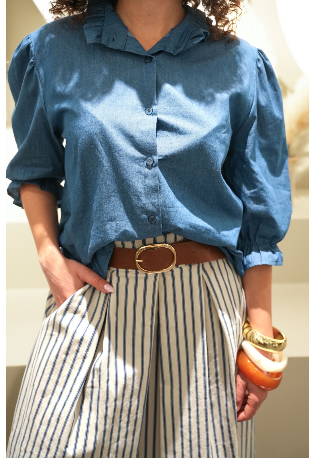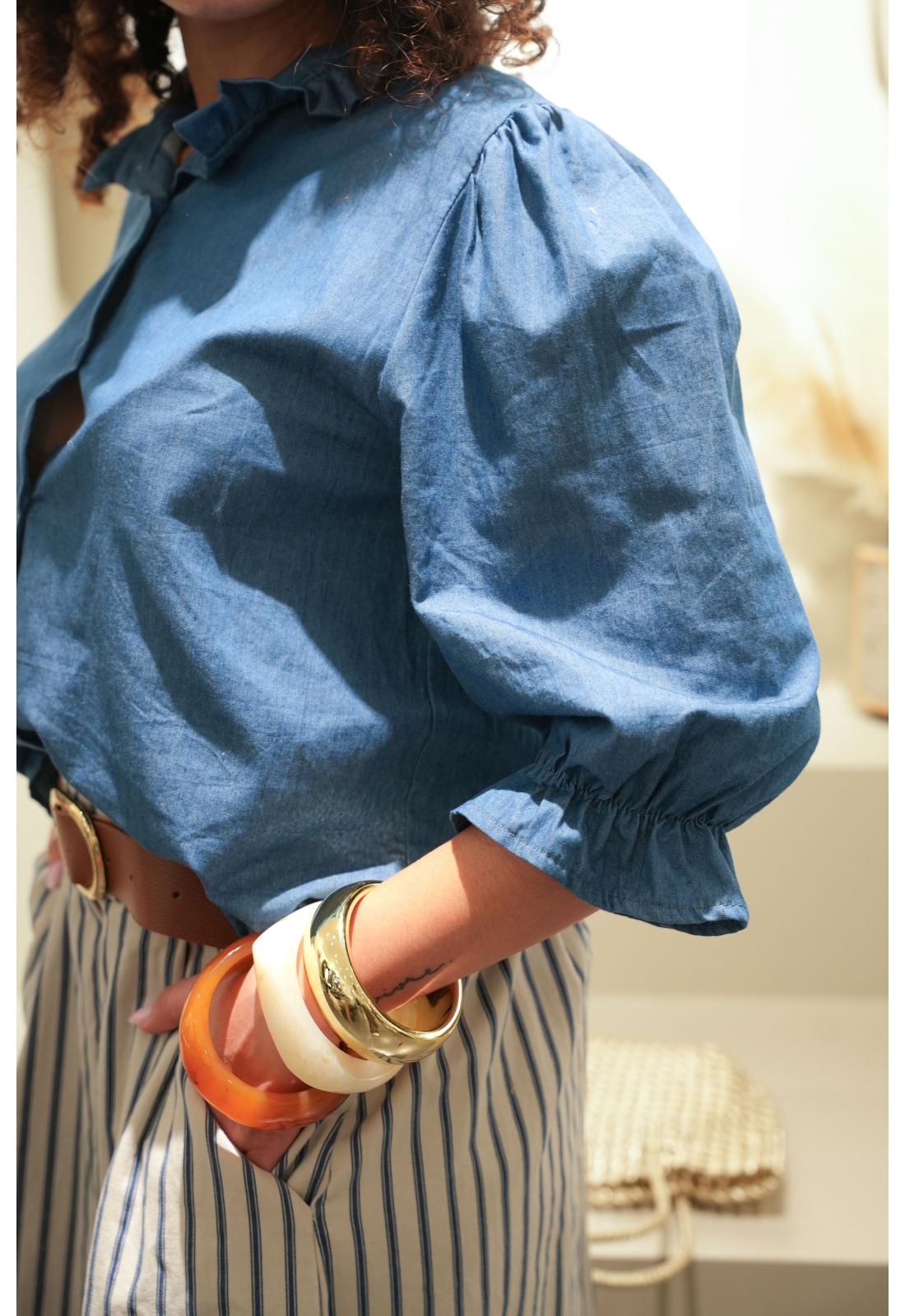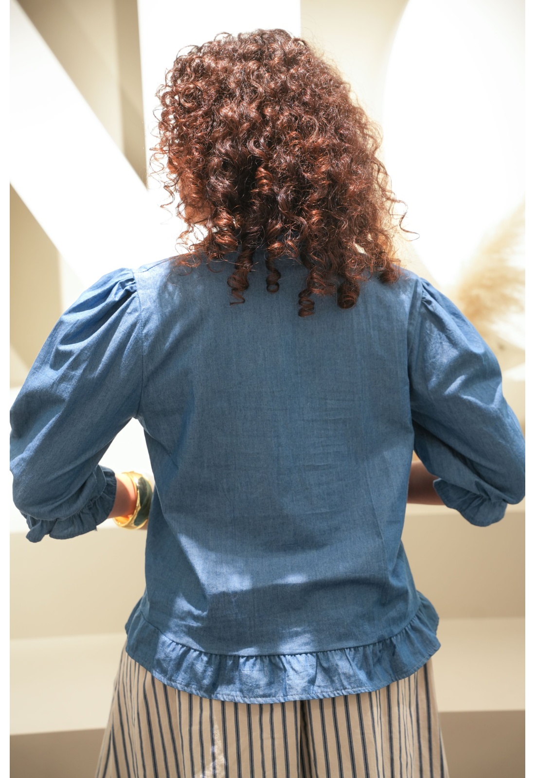 Chemisier femme bleu jean fluide LINDIE – col à volants et coupe droite