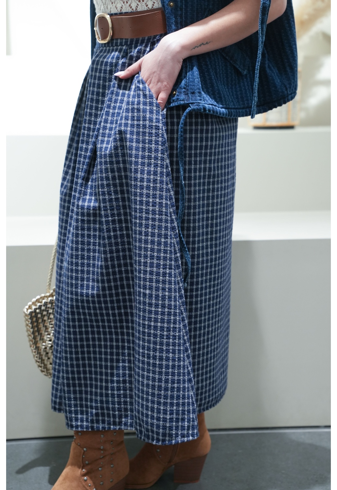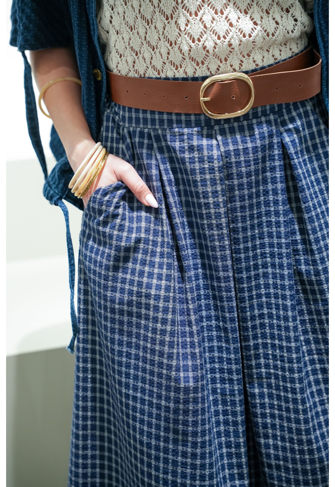 Jupe longue pour femme bleu à rayures, féminine et élégante.Sa coupe évasée avec pinces offre un joli mouvement et une silhouette fluide.Taille élastiquée à l’arrière avec passants et ceinture pour un ajustement parfait.Dotée de deux poches coupées, elle allie confort et style au quotidien.