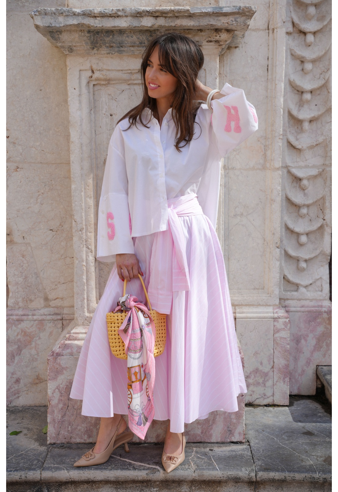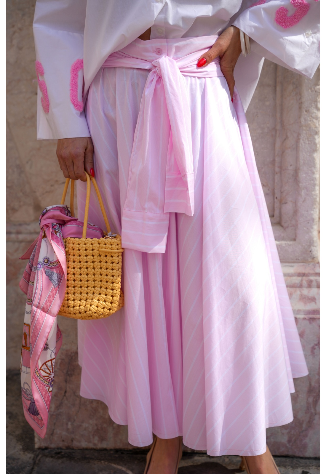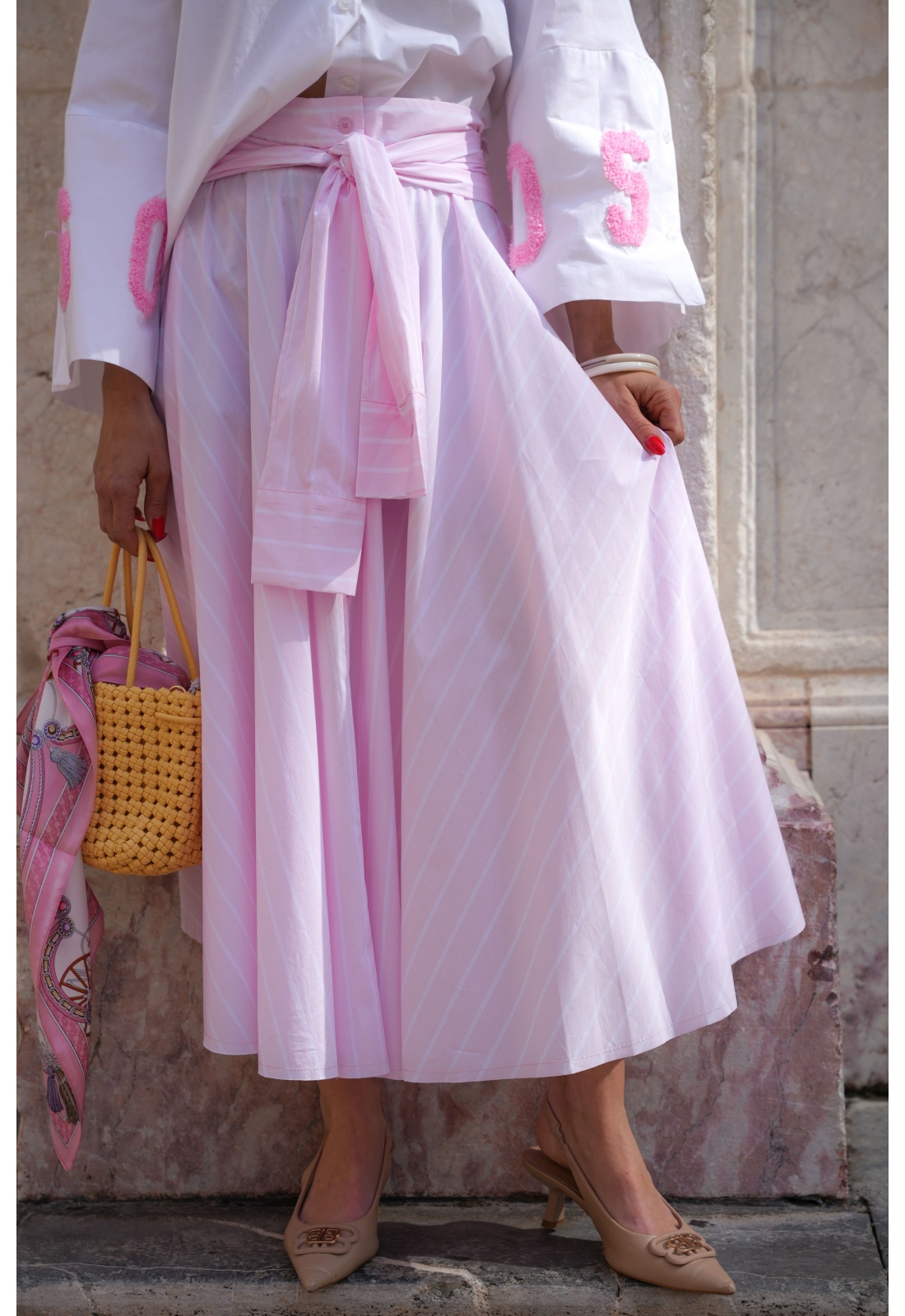 Rayée rose et blanche.Longue.Effet manches nouées à la tailler.Coupe évasée.Boutonnée sur tout le long.2 poches coupées à l'avant.Composition :100% Coton.Fabriquée en Italie.La mannequin porte une taille unique et mesure 160 cm.