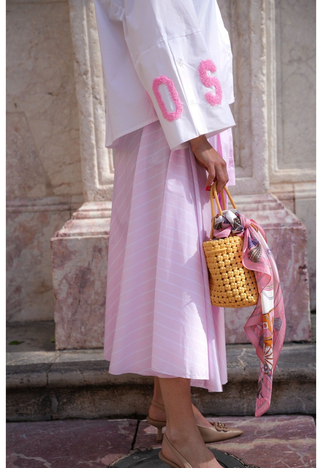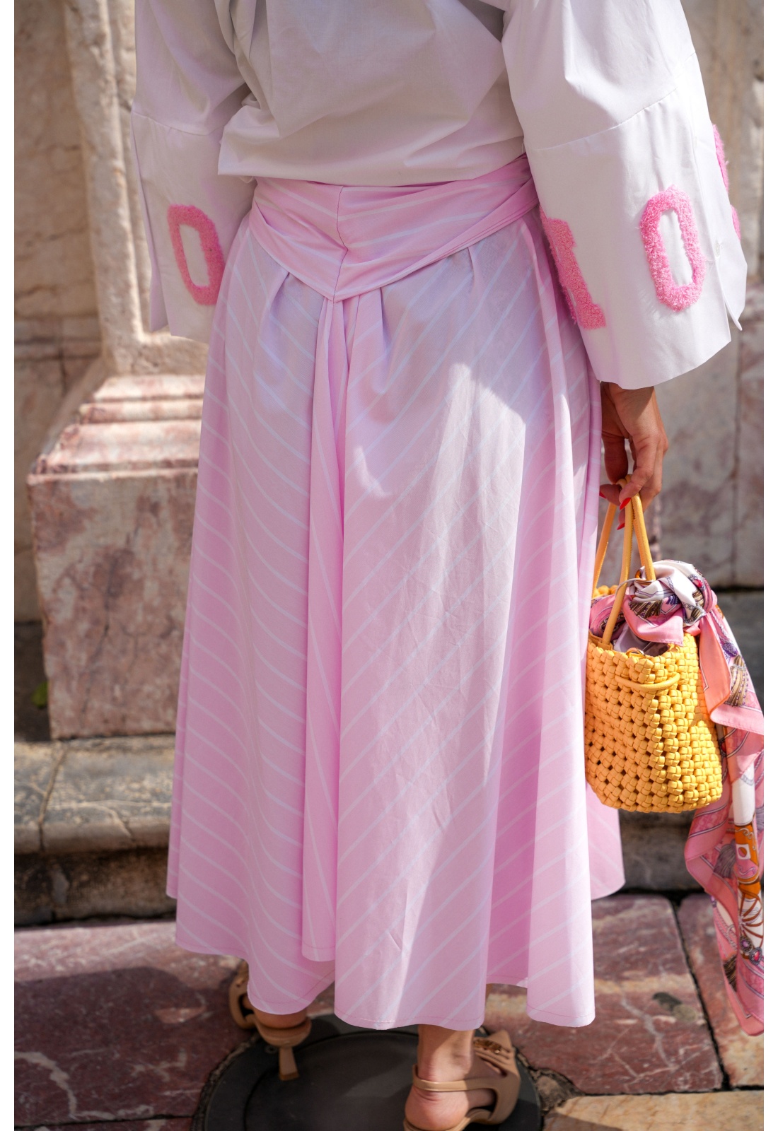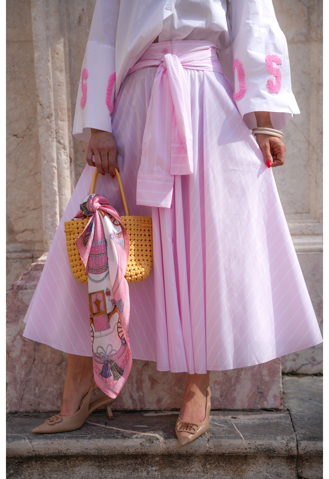 Rayée rose et blanche.Longue.Effet manches nouées à la tailler.Coupe évasée.Boutonnée sur tout le long.2 poches coupées à l'avant.Composition :100% Coton.Fabriquée en Italie.La mannequin porte une taille unique et mesure 160 cm.