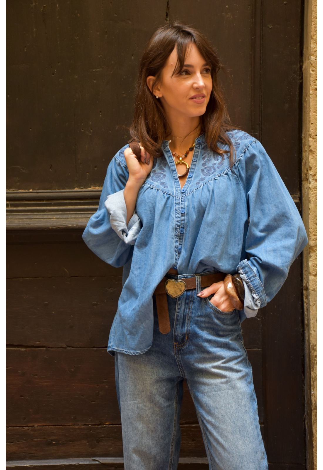 Chemisier pour femmes.En denim clair.Broderie marine au col.Col mao.Manches bouffantes.Avec poignets boutonnés.Coupe droite.Se ferme par boutons ciel.Composition:100% Coton.La mannequin porte une taille S et mesure 160cm.