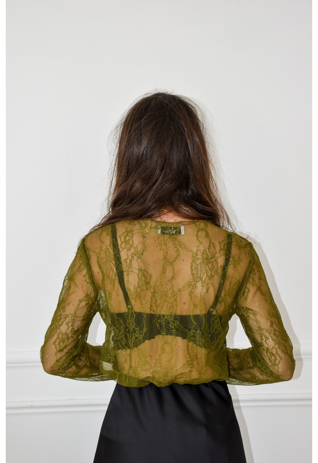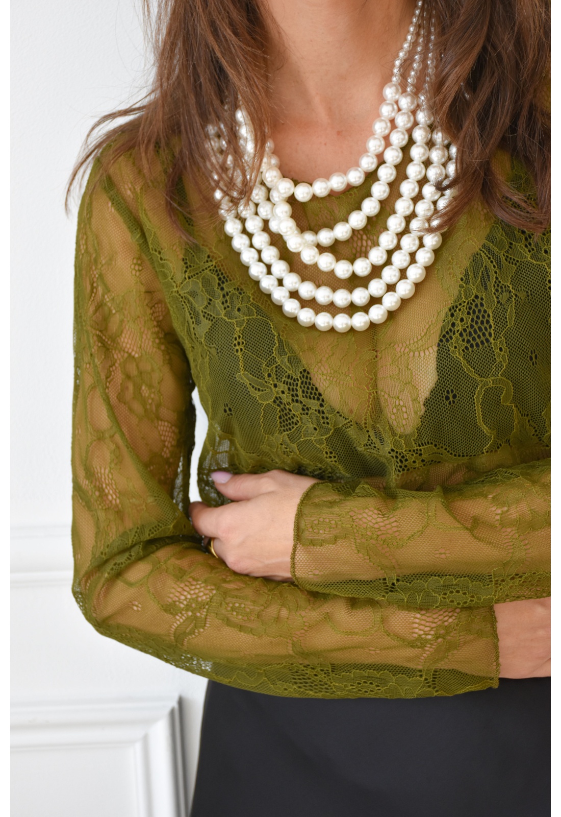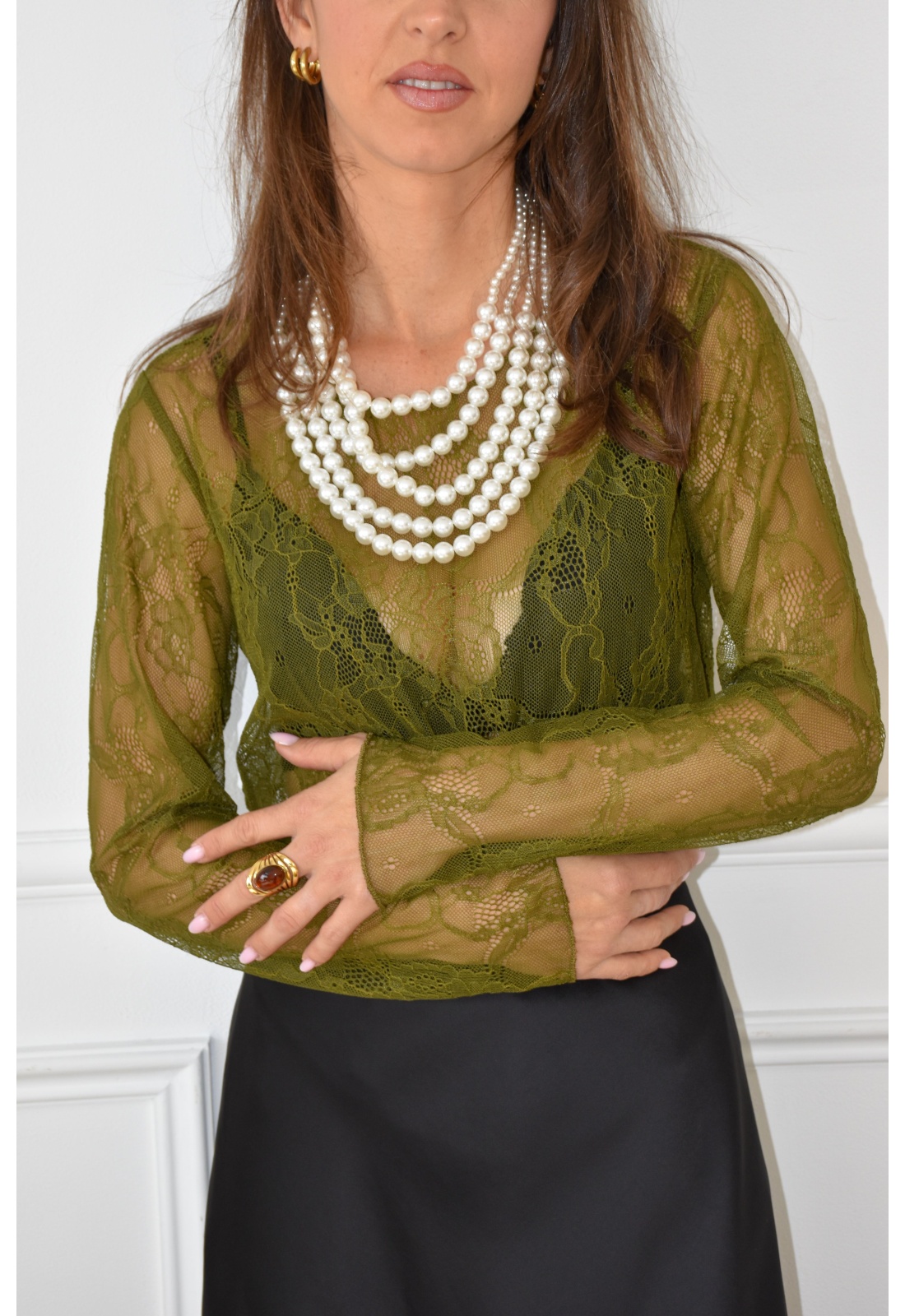 Haut pour femmes.De couleur olive.En dentelle.Col rond.Manches longues.Coupe proche du corps.Composition :90% Nylon.10% Elasthanne.Fabriqué en Italie.La mannequin porte une taille unique et mesure 160cm.