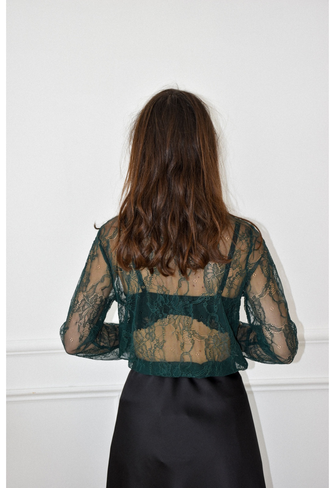 Haut pour femmes.De couleur sapin.En dentelle.Col rond.Manches longues.Coupe proche du corps.Composition :90% Polyamide.10% Elasthanne.Fabriqué en Italie.La mannequin porte une taille unique et mesure 160cm.