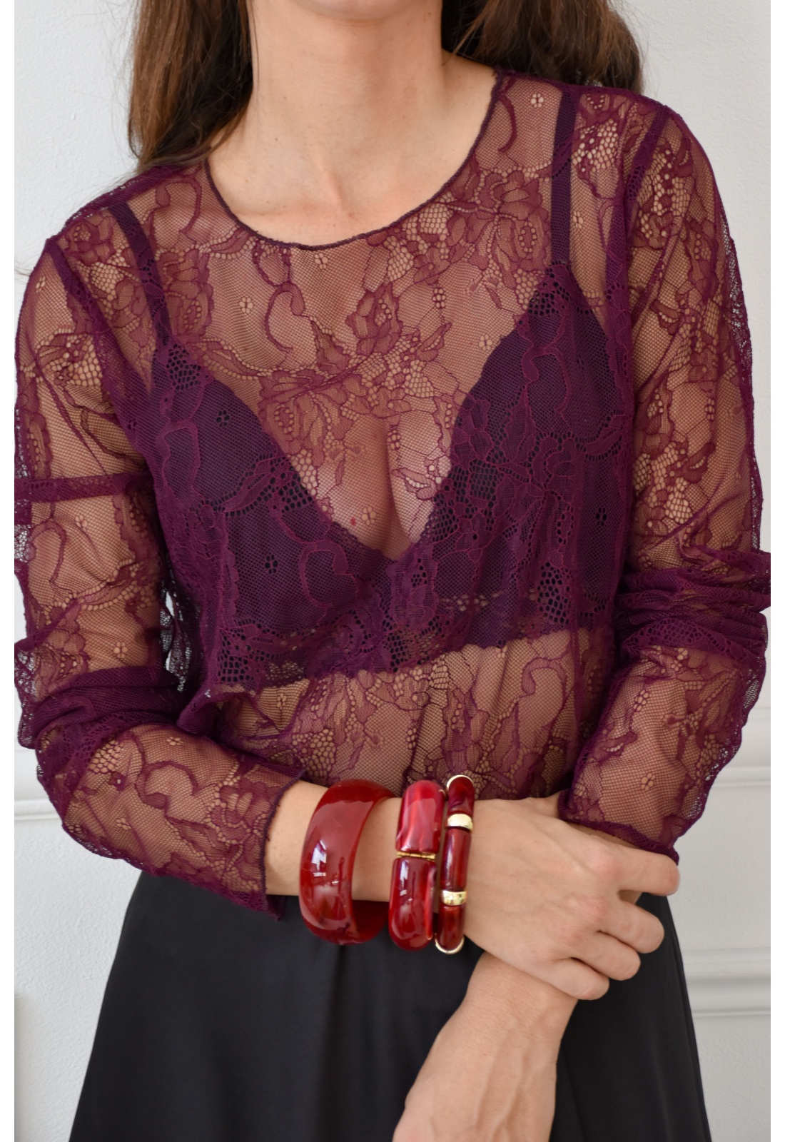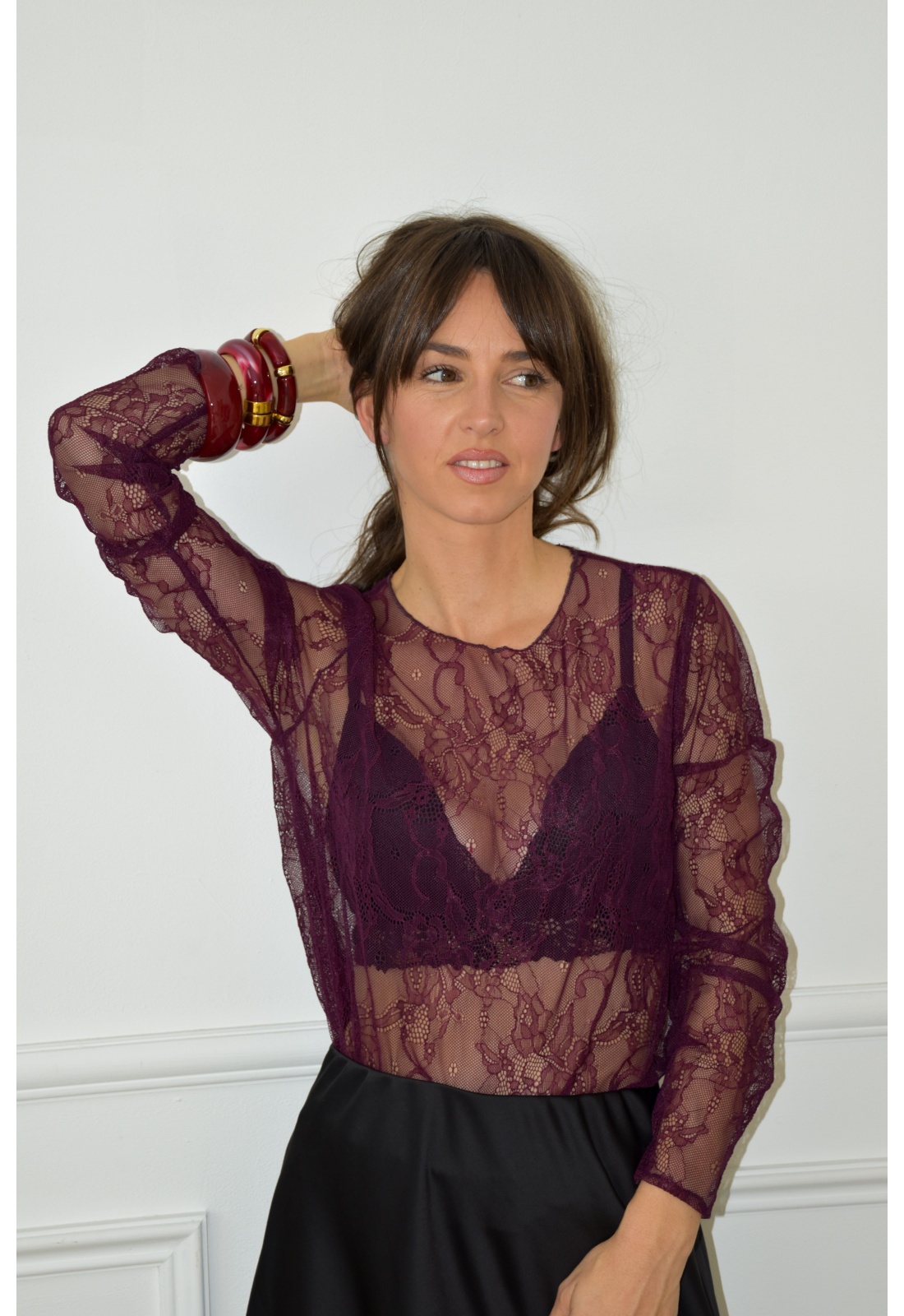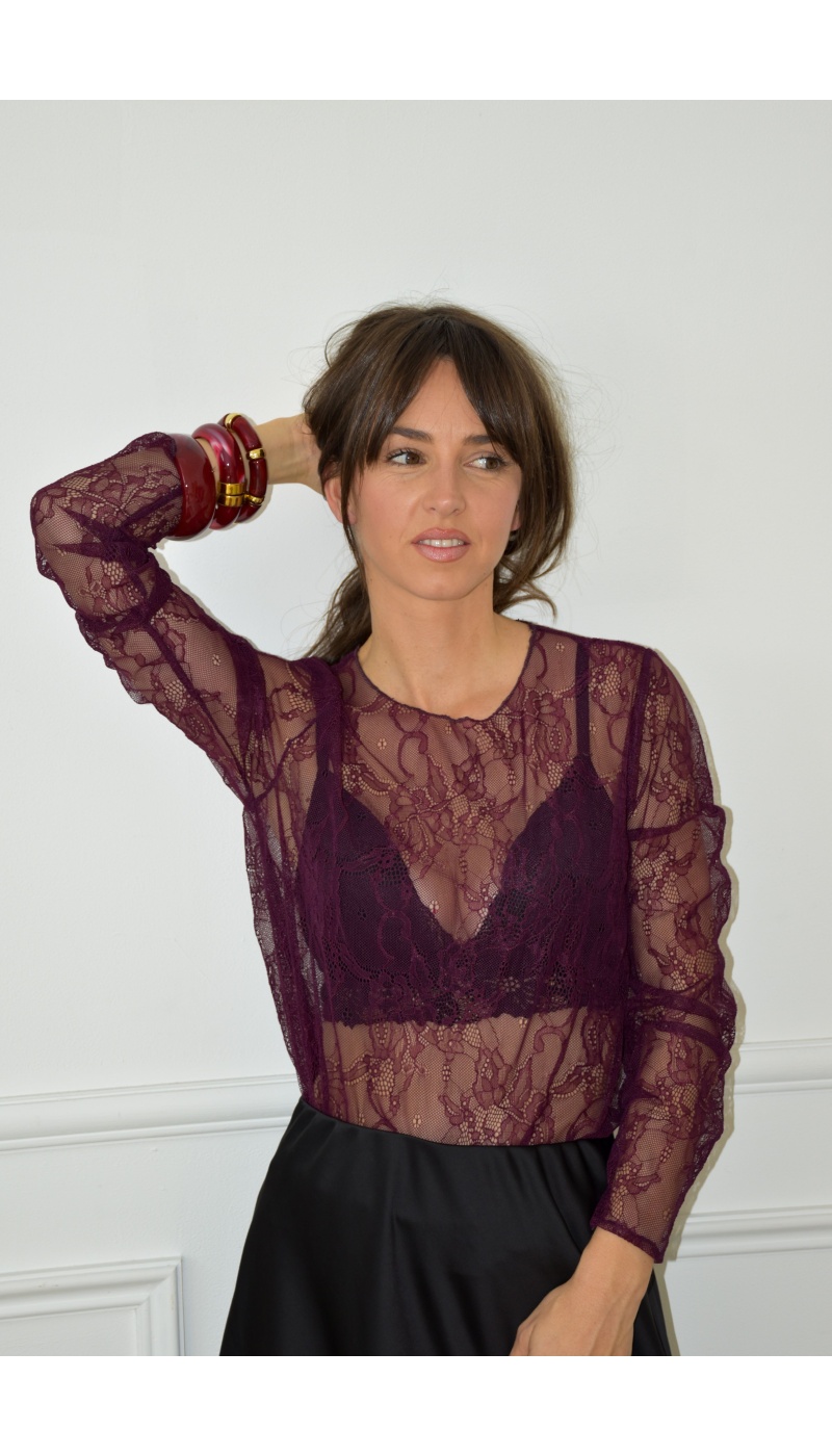 Haut pour femmes.De couleur violet.En dentelle.Col rond.Manches longues.Coupe proche du corps.Composition :90% Nylon.10% Elasthanne.Fabriqué en Italie.La mannequin porte une taille unique et mesure 160cm.