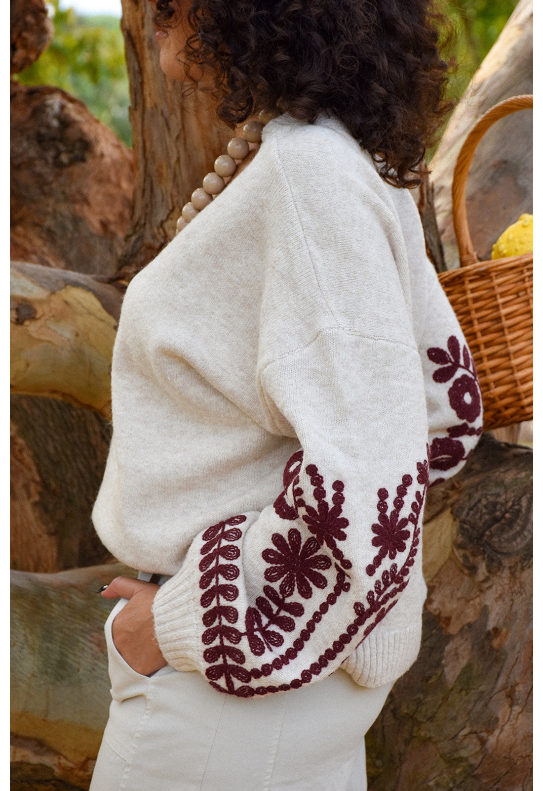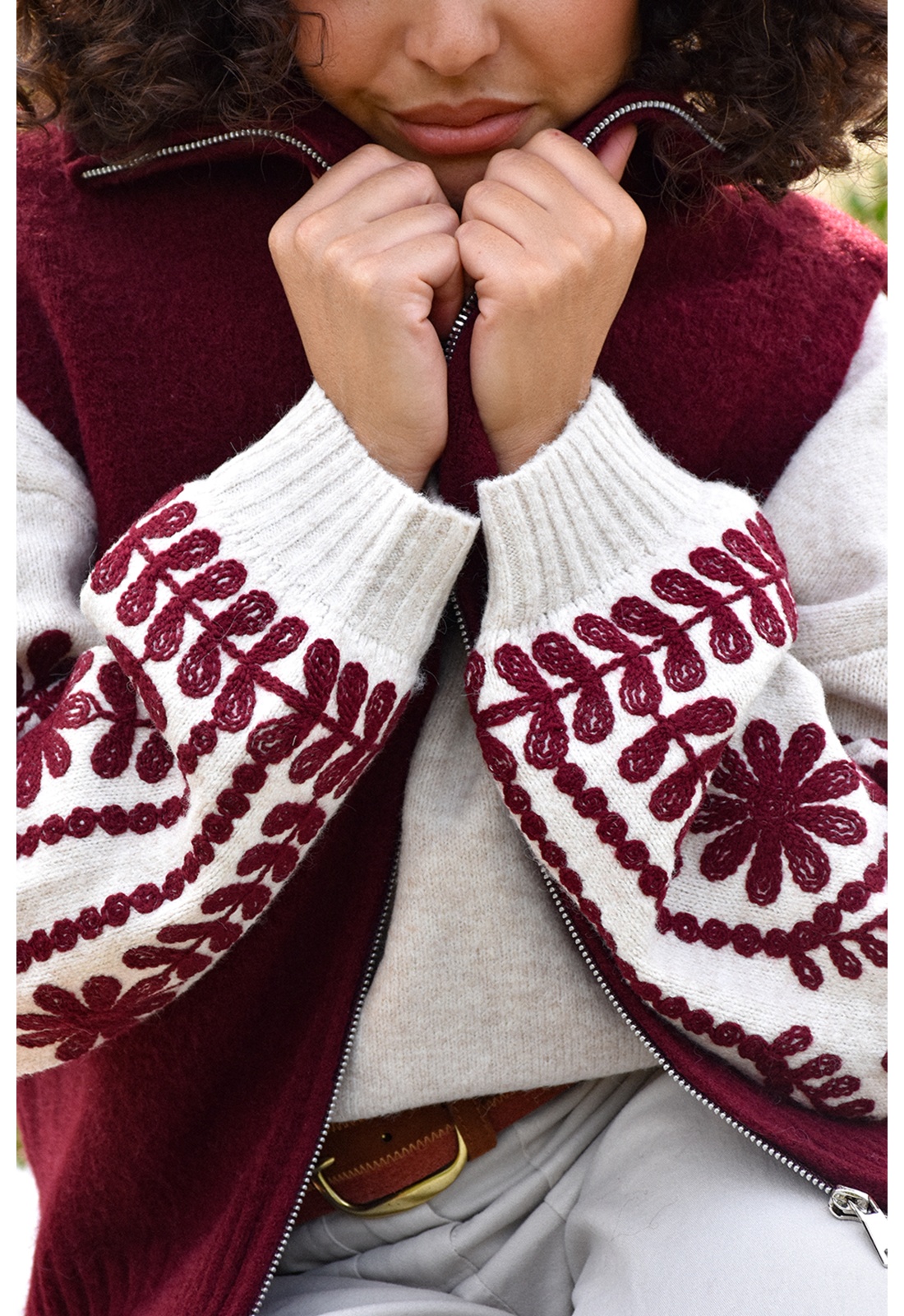 Avec broderies bordeaux aux manches.