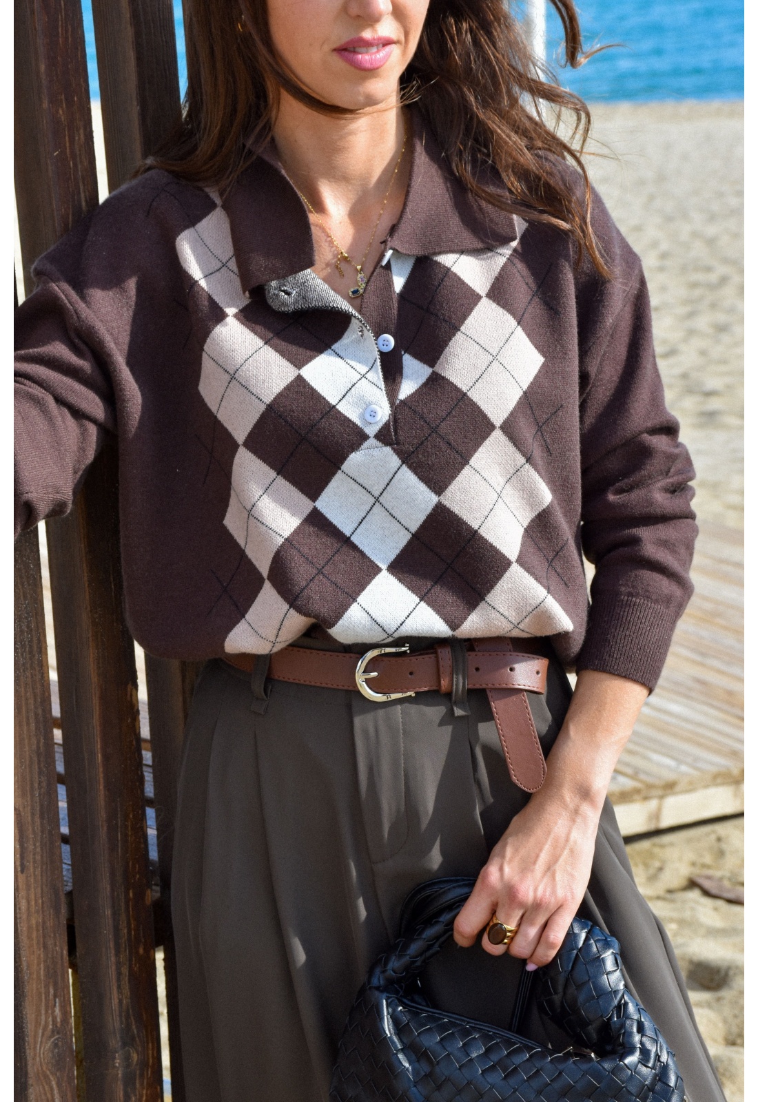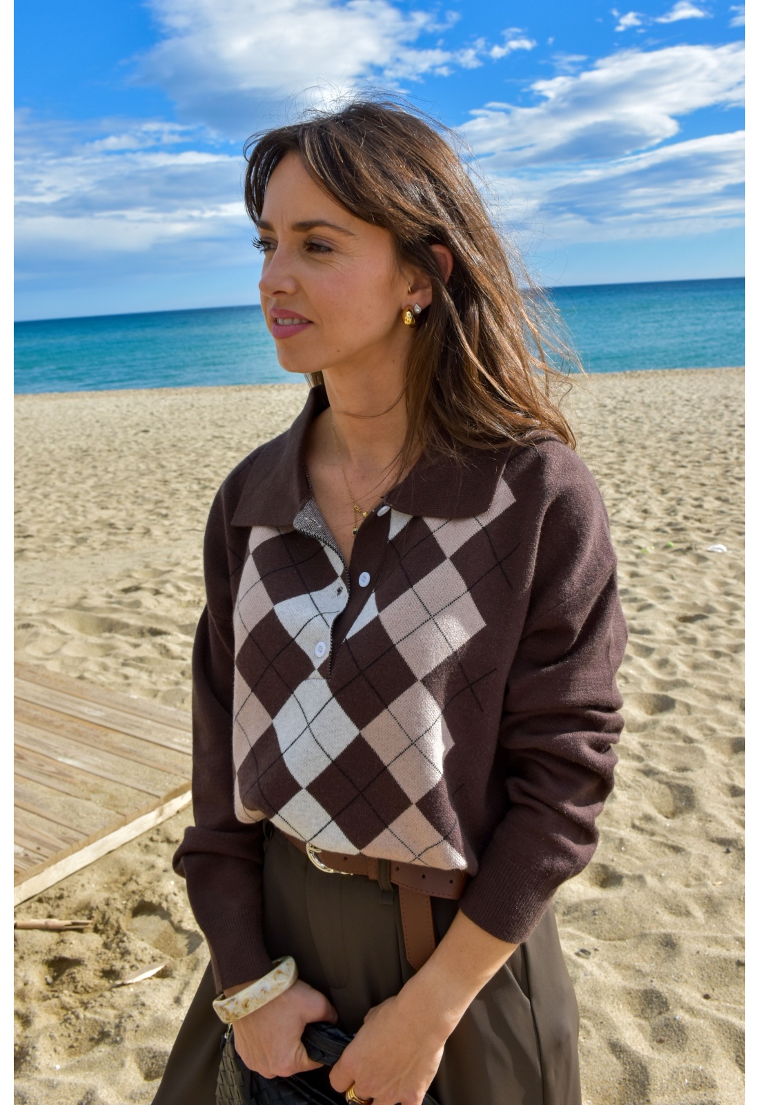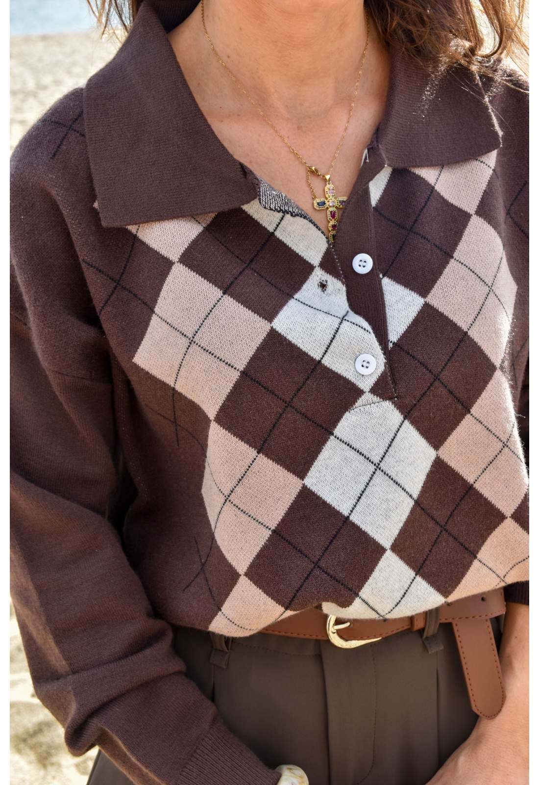 Pull pour femmes.De couleur marron.Motif losange.En maille.Col à revers boutonnés.Manches longues.Coupe droite.Extrémités côtelées.Composition :60% Viscose.30% Polyamide.10% Elasthanne.La mannequin porte une taille S-M et mesure 160cm.