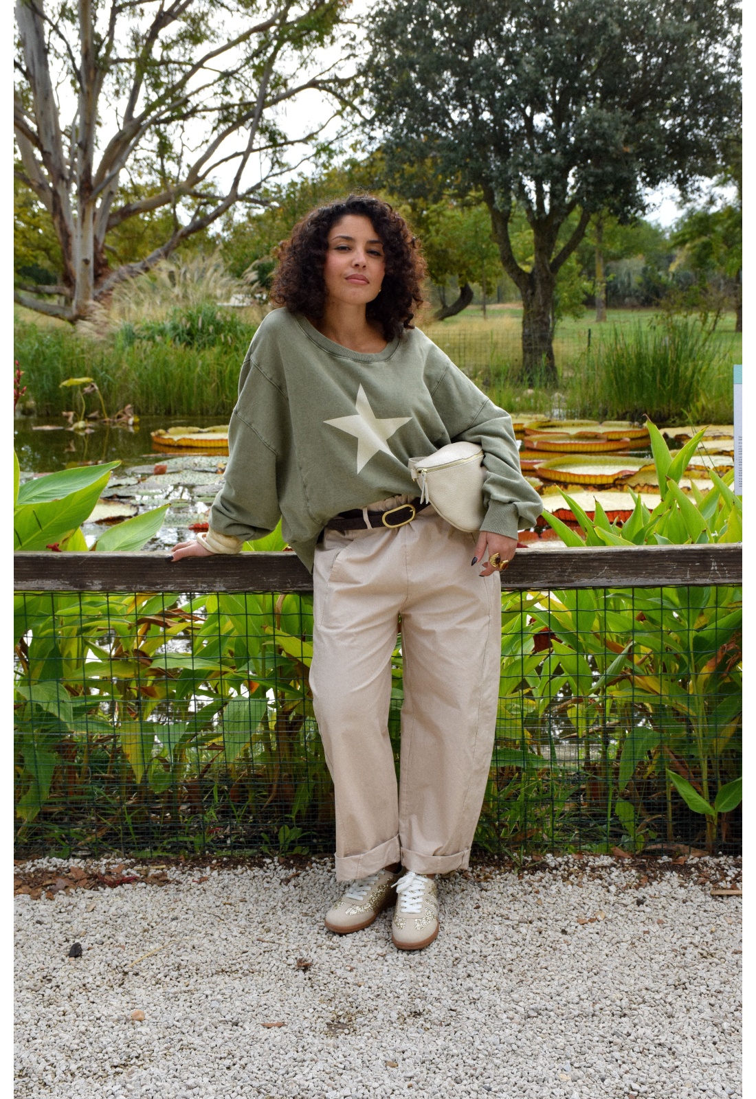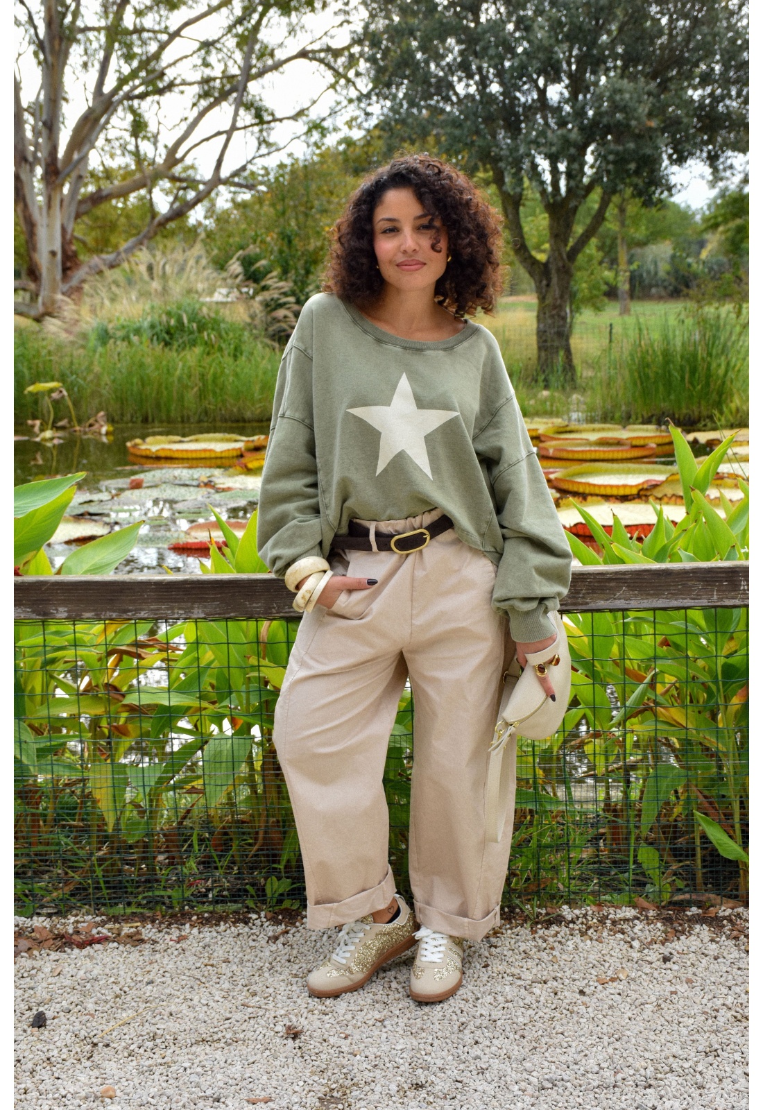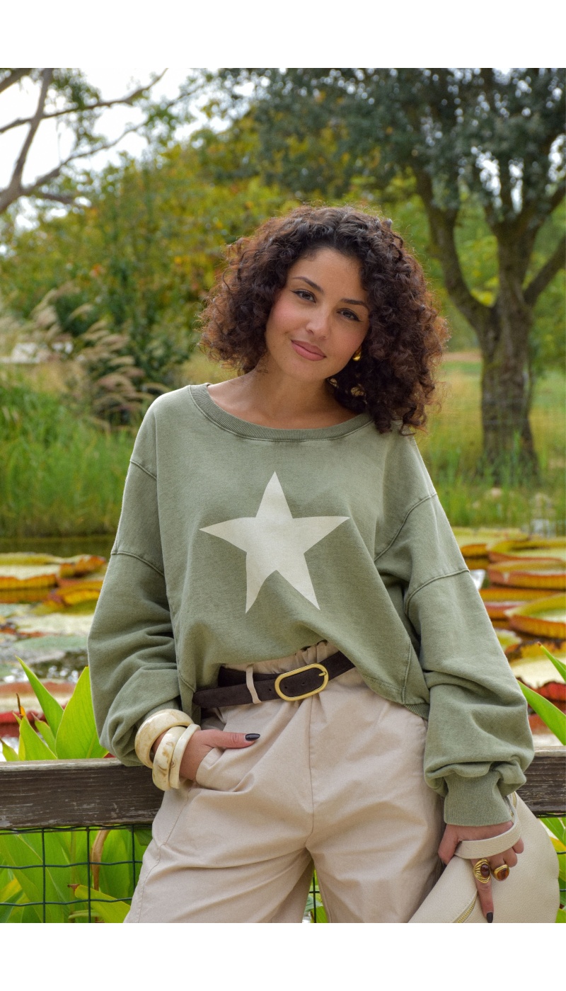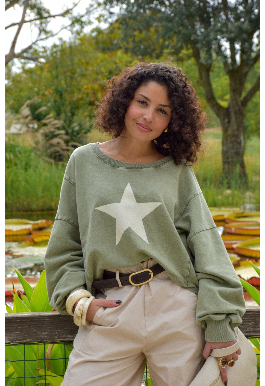 Sweat kakiEtoile écru sur le devantCol rond largueManches longues tombantesBord côteléCoupe oversizeDe marque BanditasComposition: 100% Coton