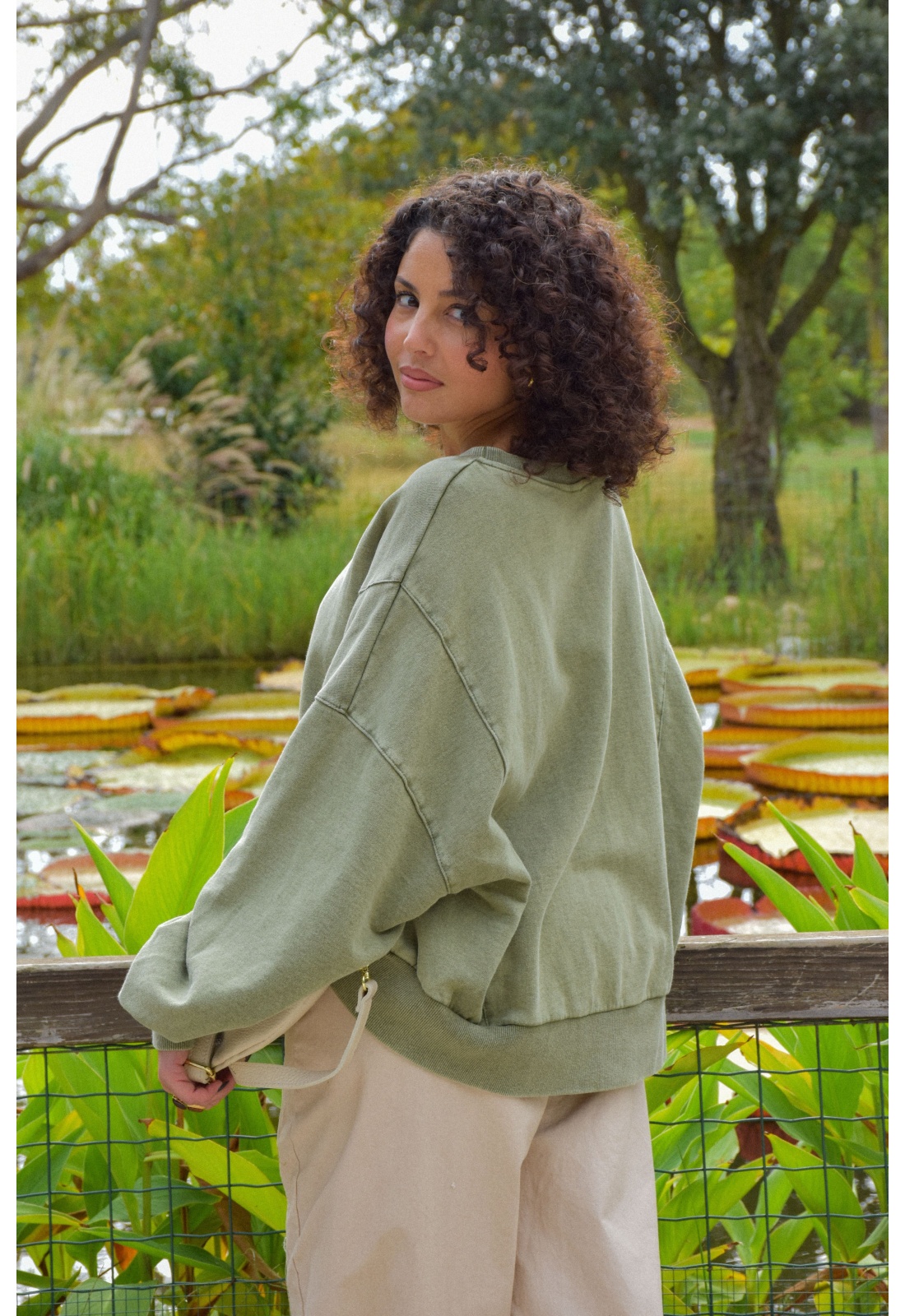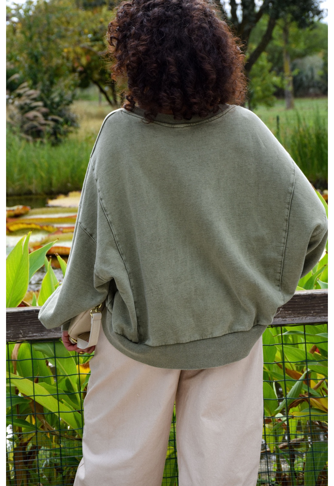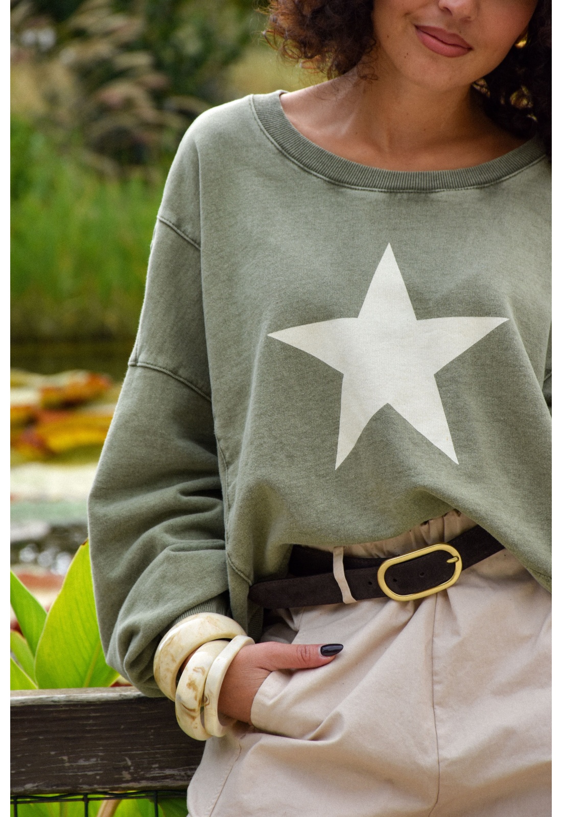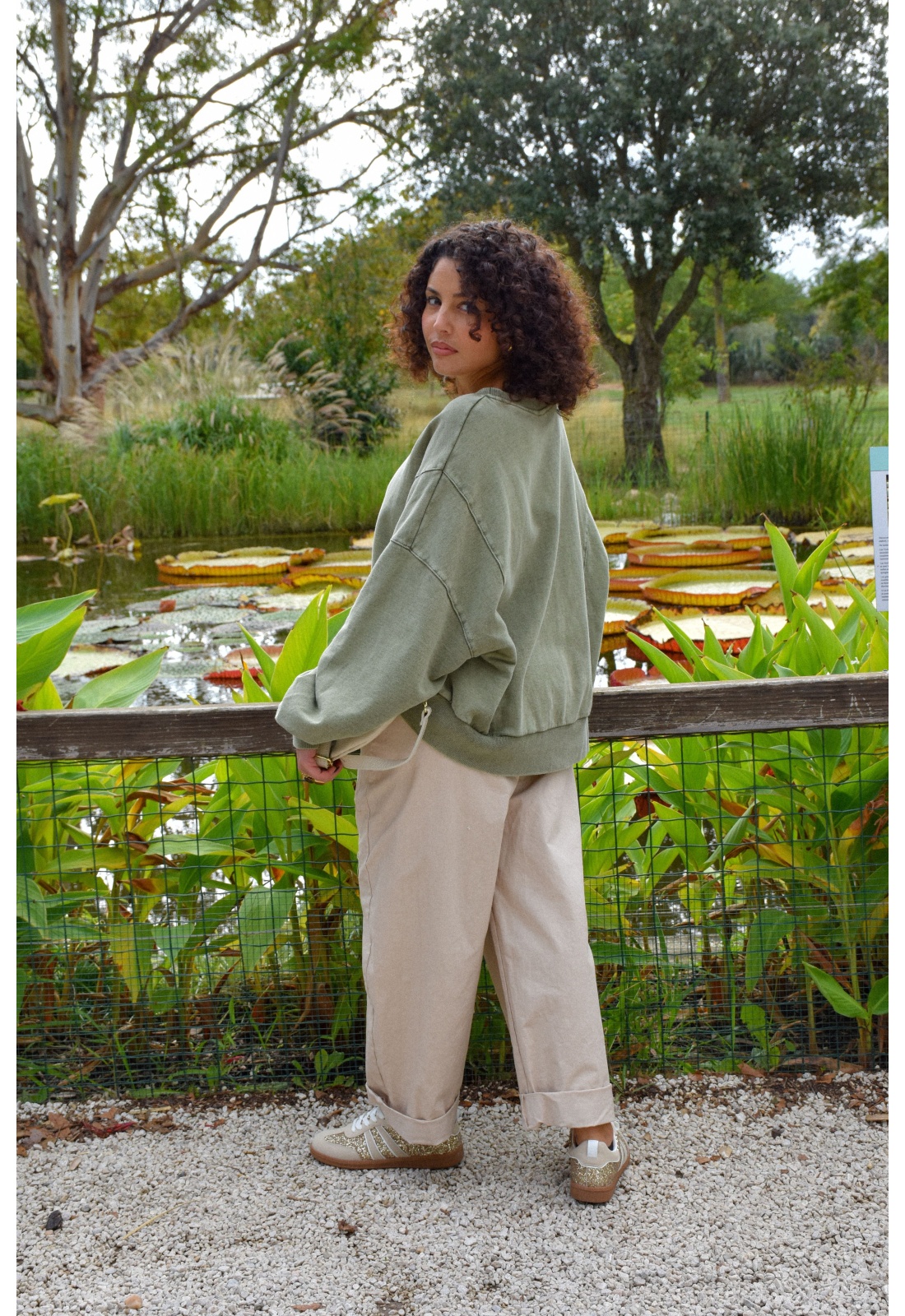 Sweat kakiEtoile écru sur le devantCol rond largueManches longues tombantesBord côteléCoupe oversizeDe marque BanditasComposition: 100% Coton