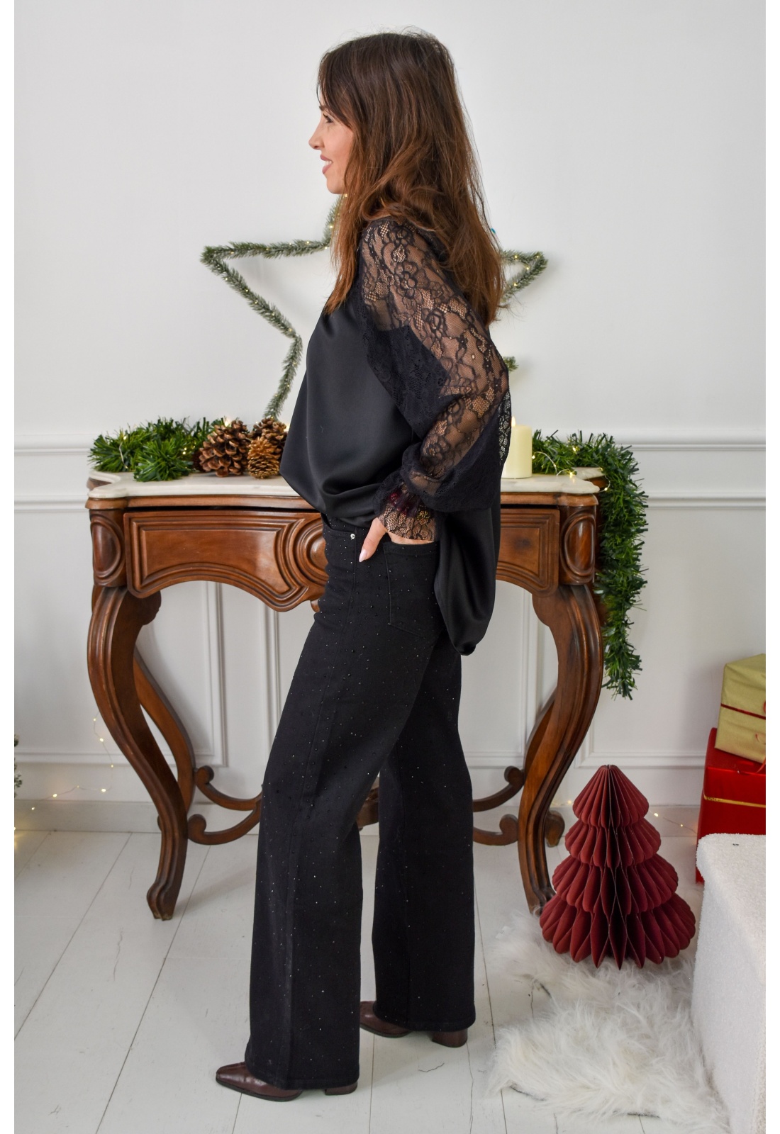 Blouse pour femmes.De couleur noir.Col rond élastiqué.Manches longues en dentelle.Poignets élastiqués.Effet satiné.Coupe oversize.Composition :100% Polyester.Fabriquée en Italie.La mannequin porte une taille unique et mesure 160cm.