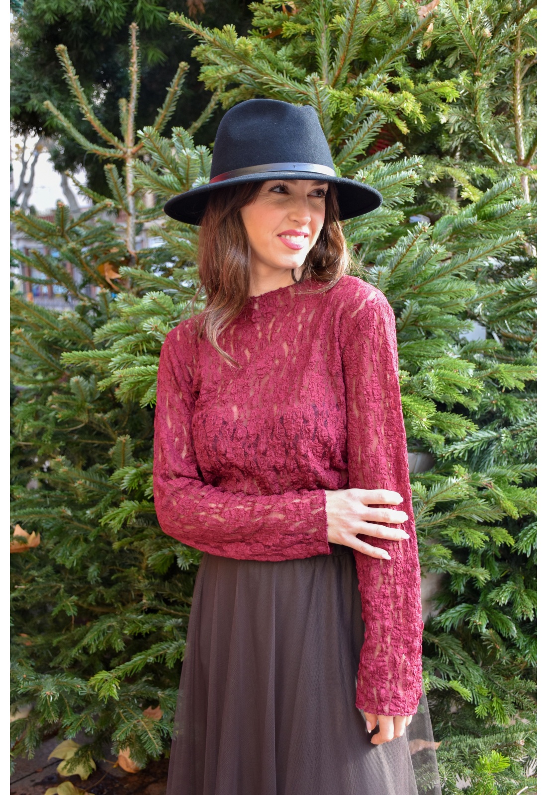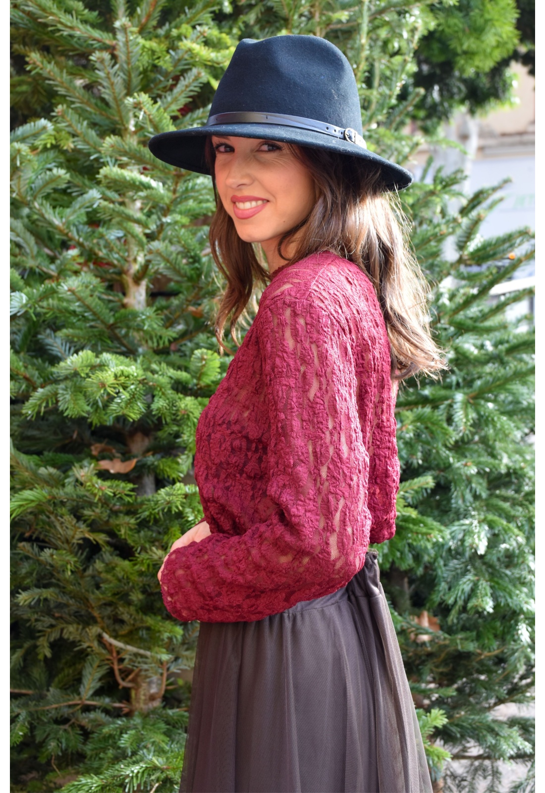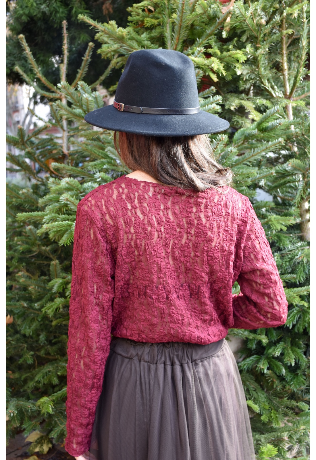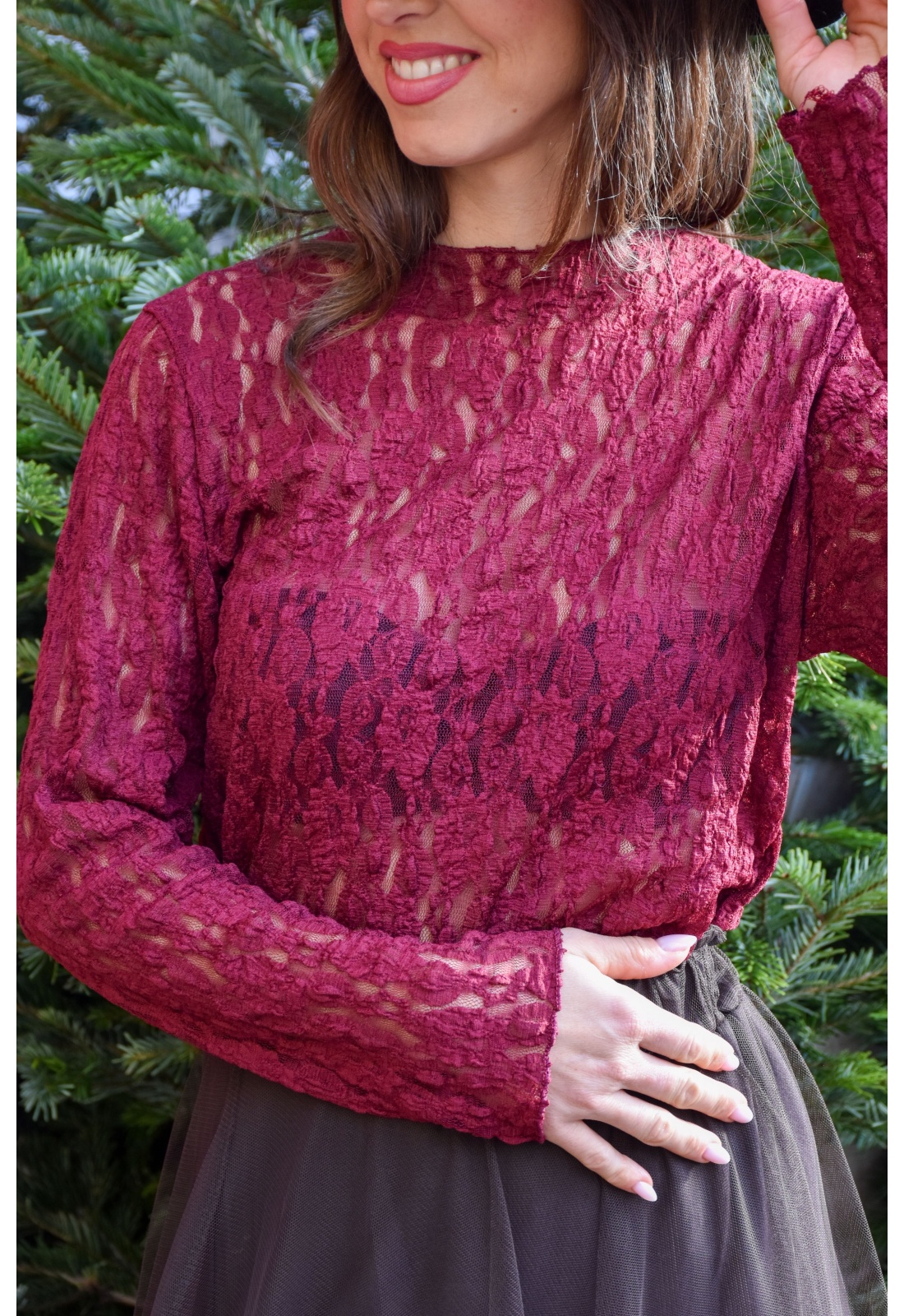 Haut pour femmes.De couleur bordeaux.En dentelle ajourée.Col rond.Manches longues.Proche du corps.Coupe droite.Composition :95% Polyester.5% Elasthanne.Fabriqué en Italie.La mannequin porte une taille unique et mesure 160cm.