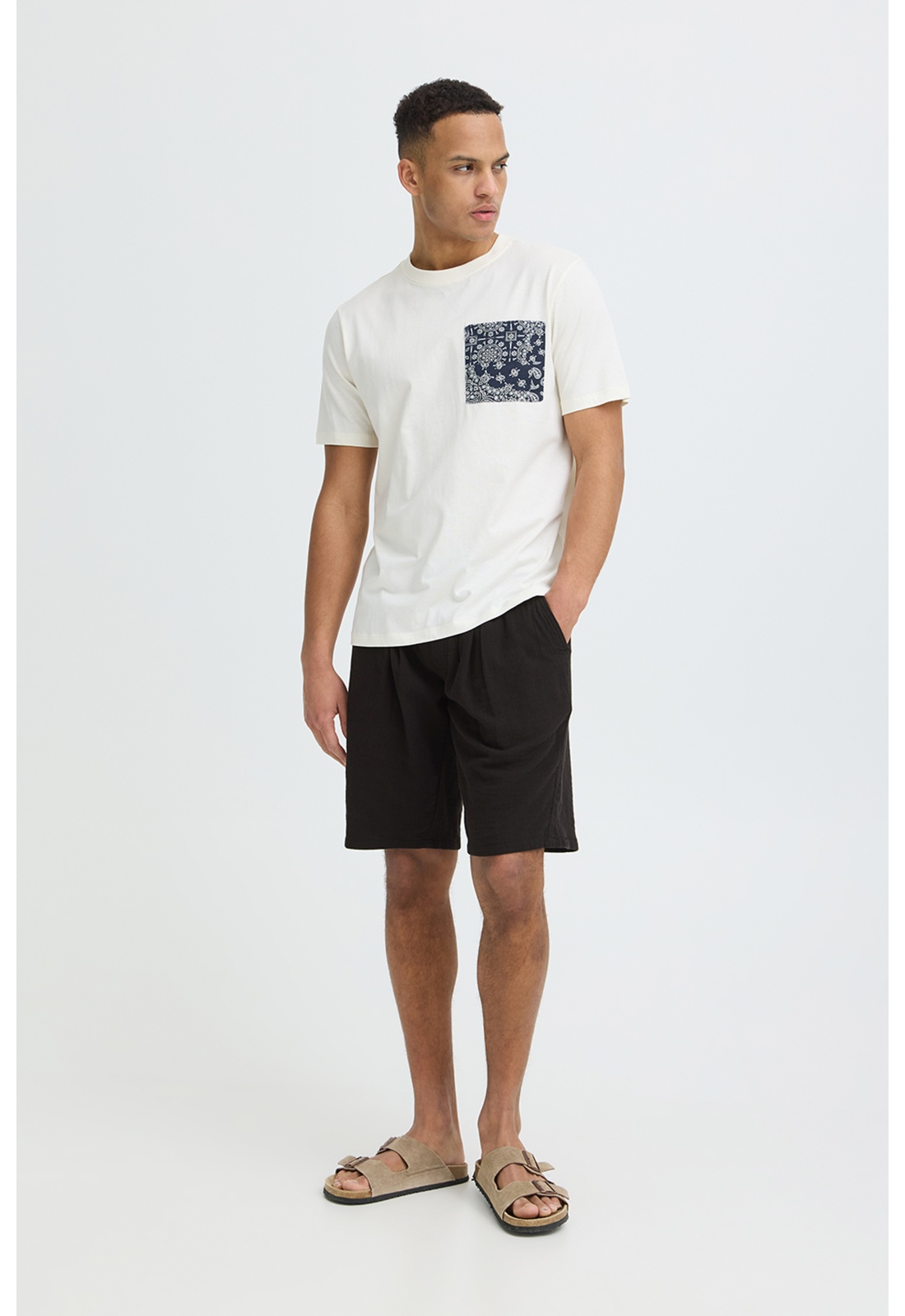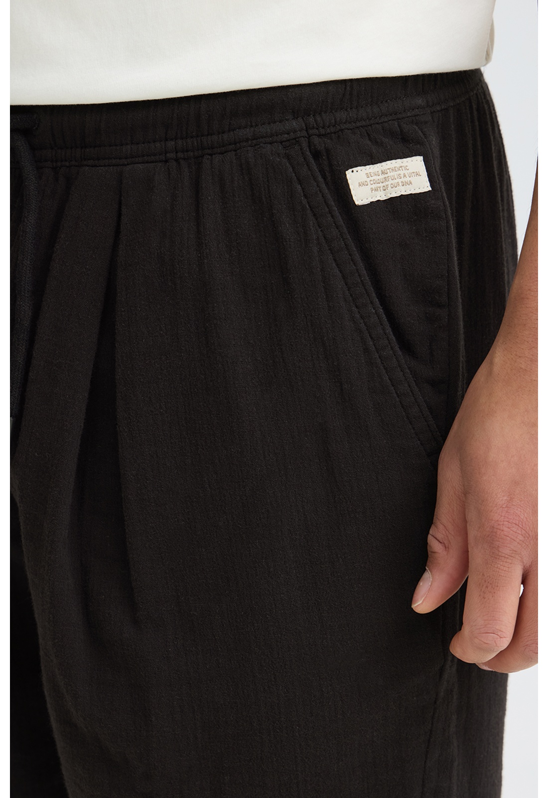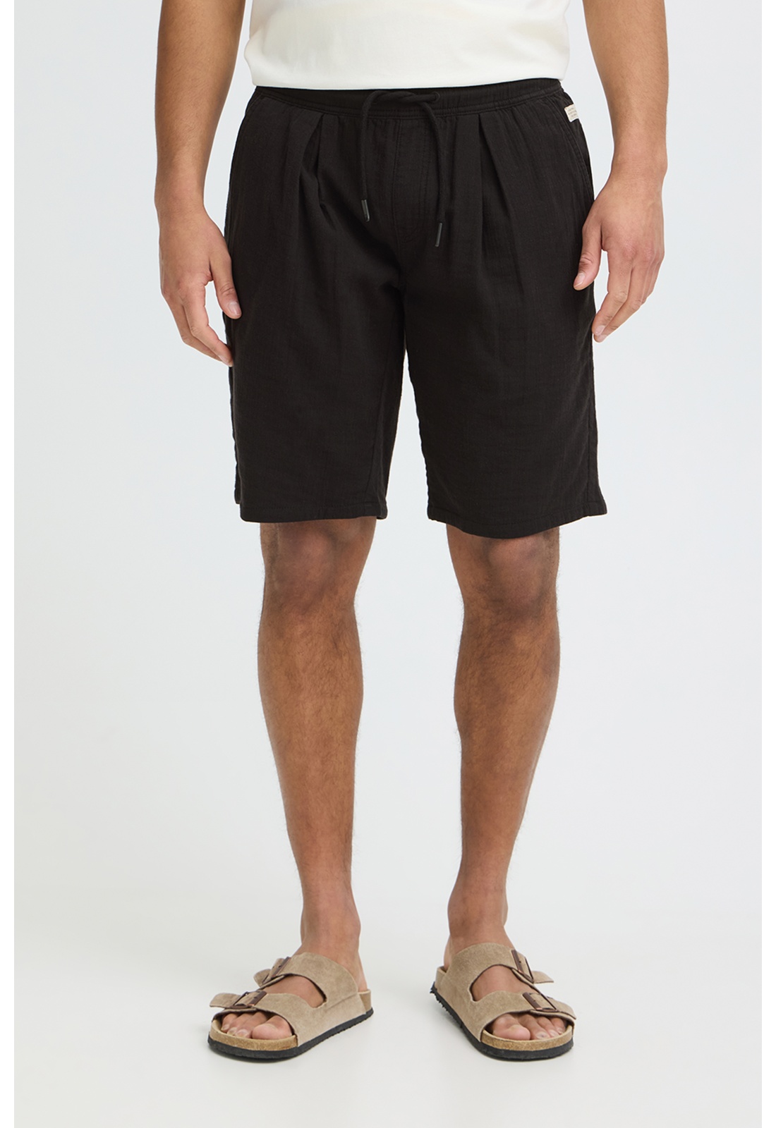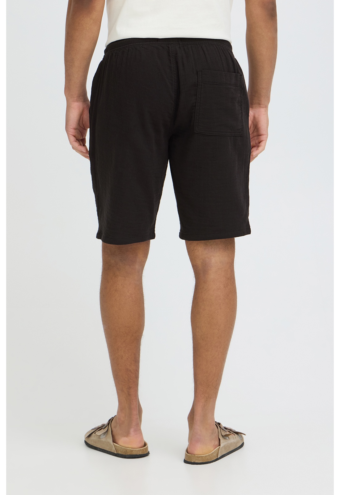 Short noirFermeture avec cordon de serrageTaille élastiquéeDeux poches passepoilées.Deux poches plaquées arrière