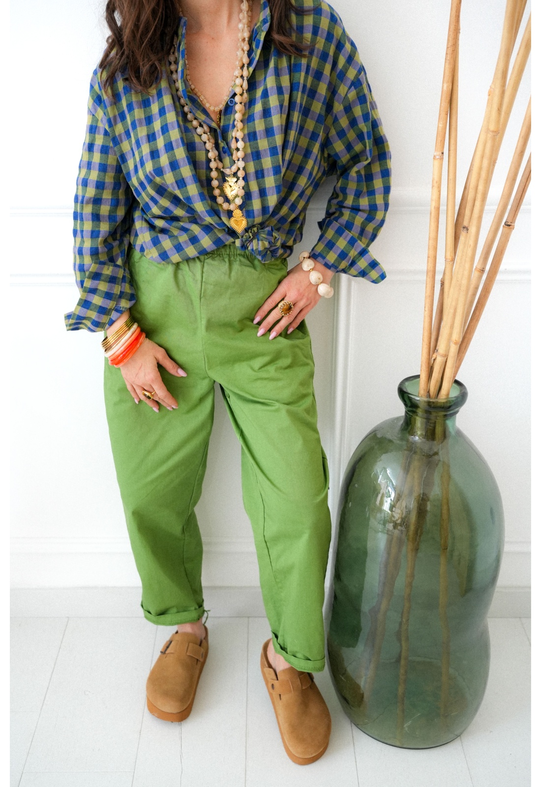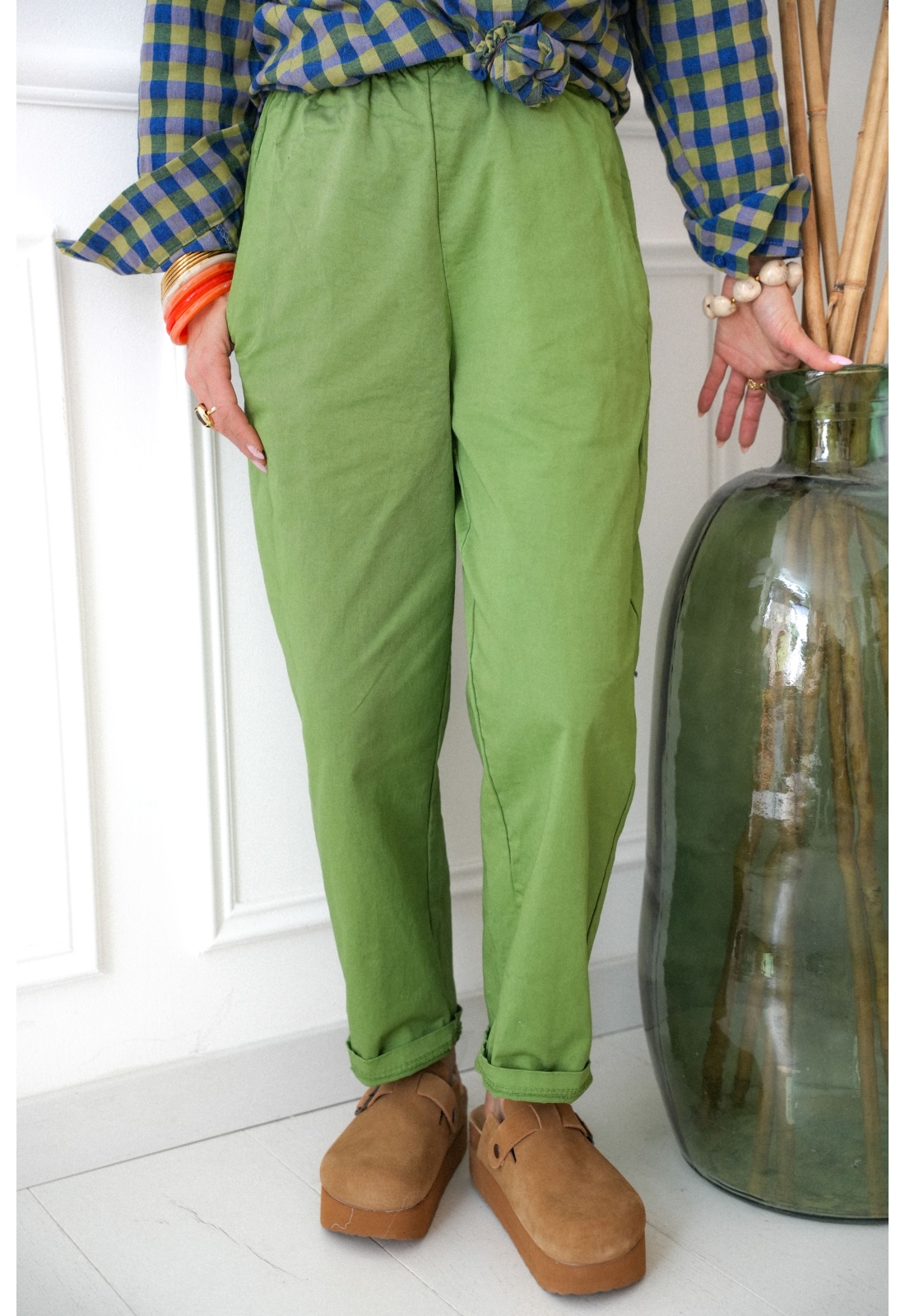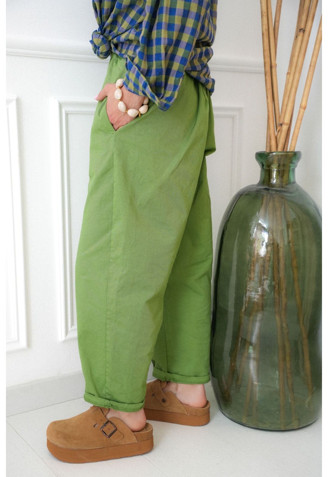 Women's pants. Green color. Piped pockets. Elastic waist. Straight and loose fit. Composition: 100% Cotton. Made in Italy.