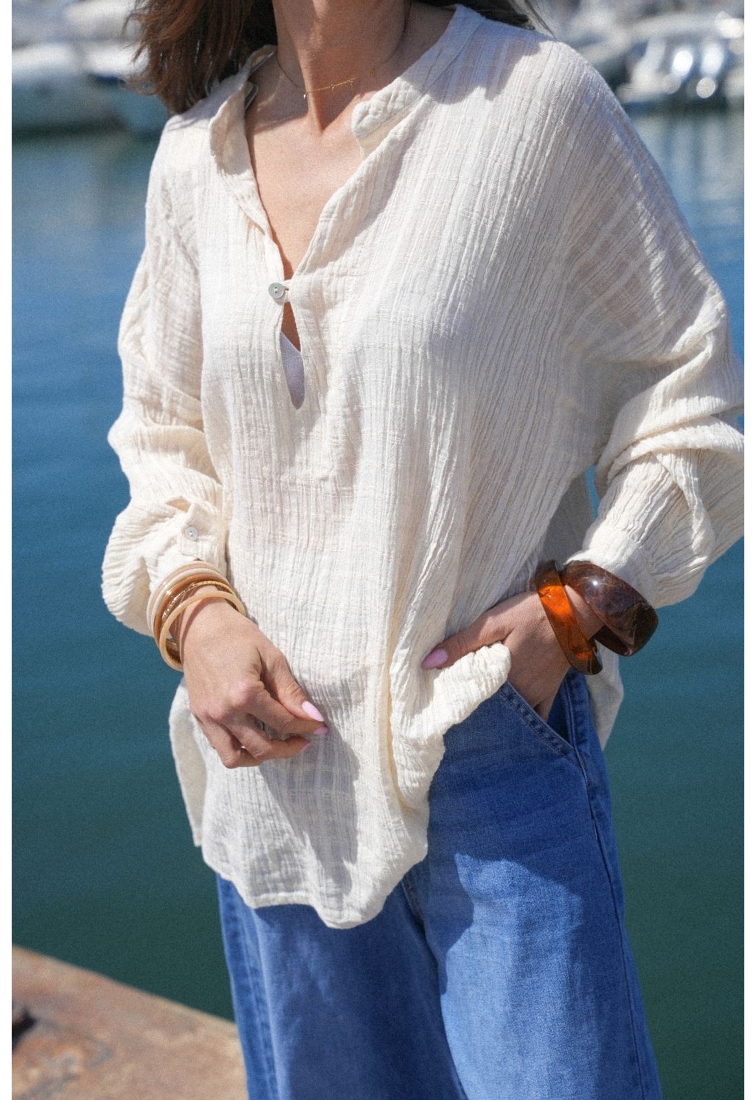 Adotta uno stile disinvolto con la camicetta fluida ecru WASP . Questa camicetta splendidamente drappeggiata offre una vestibilità comoda e rilassata, perfetta per il passaggio da una stagione all'altra. L'abbiamo progettato con un tessuto fluido e leggero che offre una sensazione incredibilmente confortevole sulla pelle.