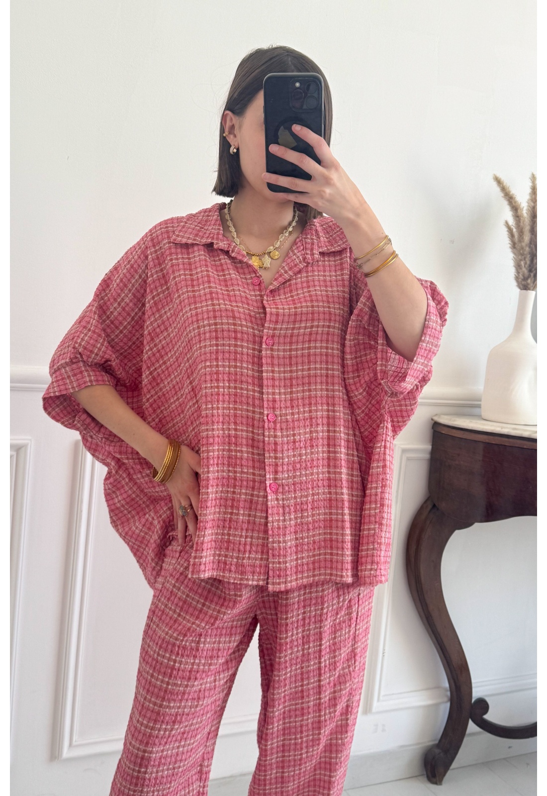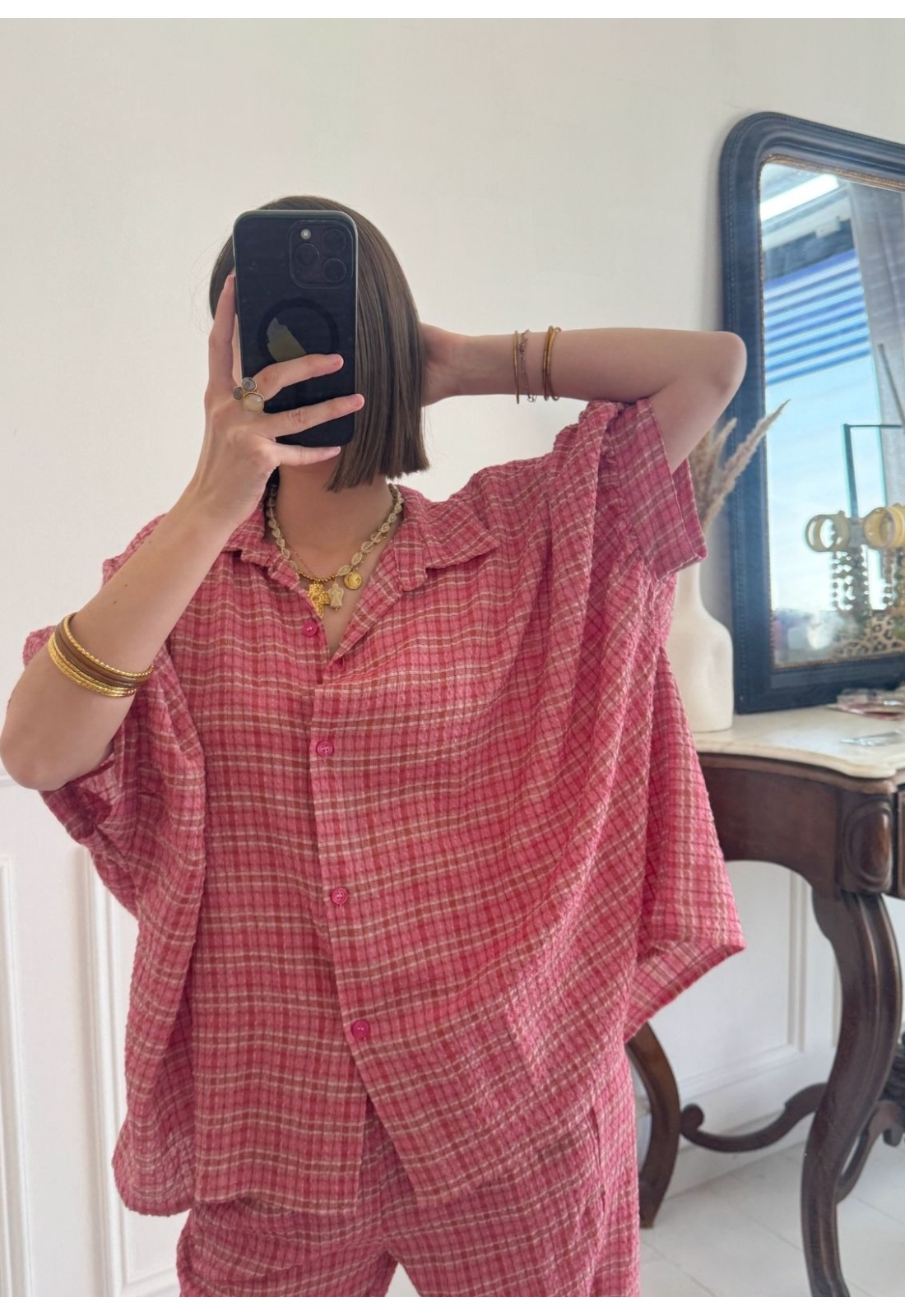 Blusa bianca a quadri vertet. Manica corta. Scollo a V. Bottoni lungo tutta la camicetta. Vestibilità ampia.
