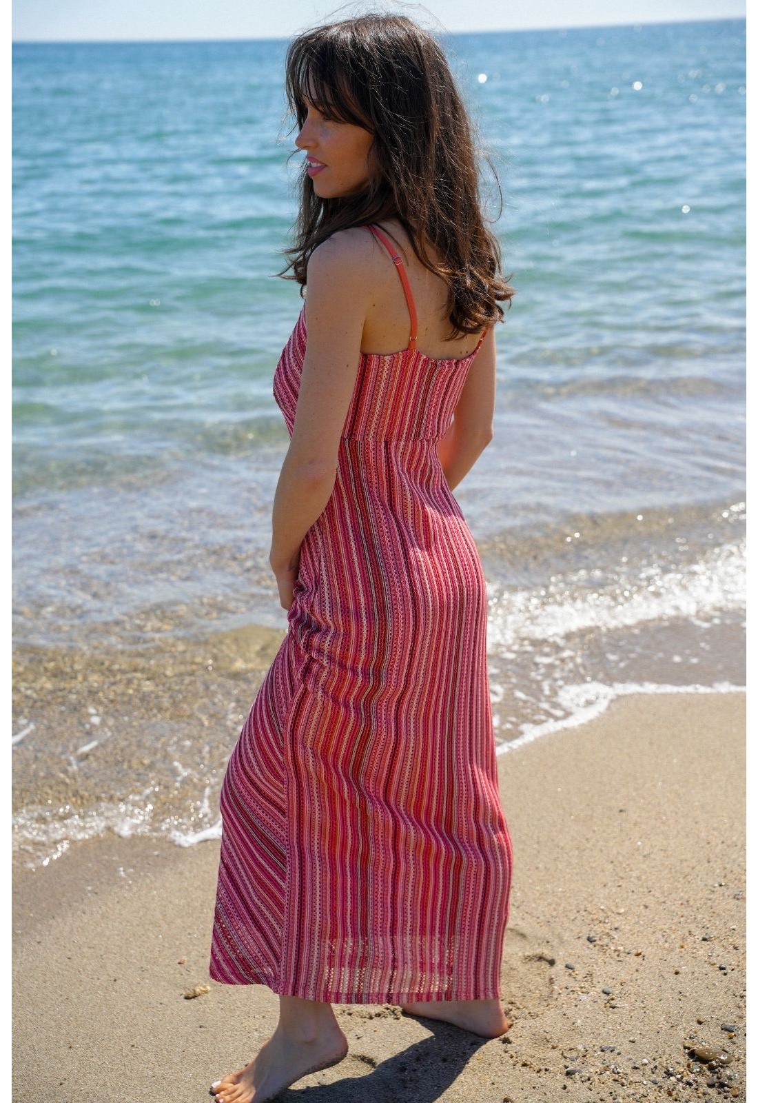 Abito lungo. Macramè rombo. Raddoppiato. Taglio a canotta. Scollo a V. Spalline regolabili. Composizione: Made in Italy 98% poliestere. 2% elastan. Il modello indossa la taglia unica ed è alto 160 cm.